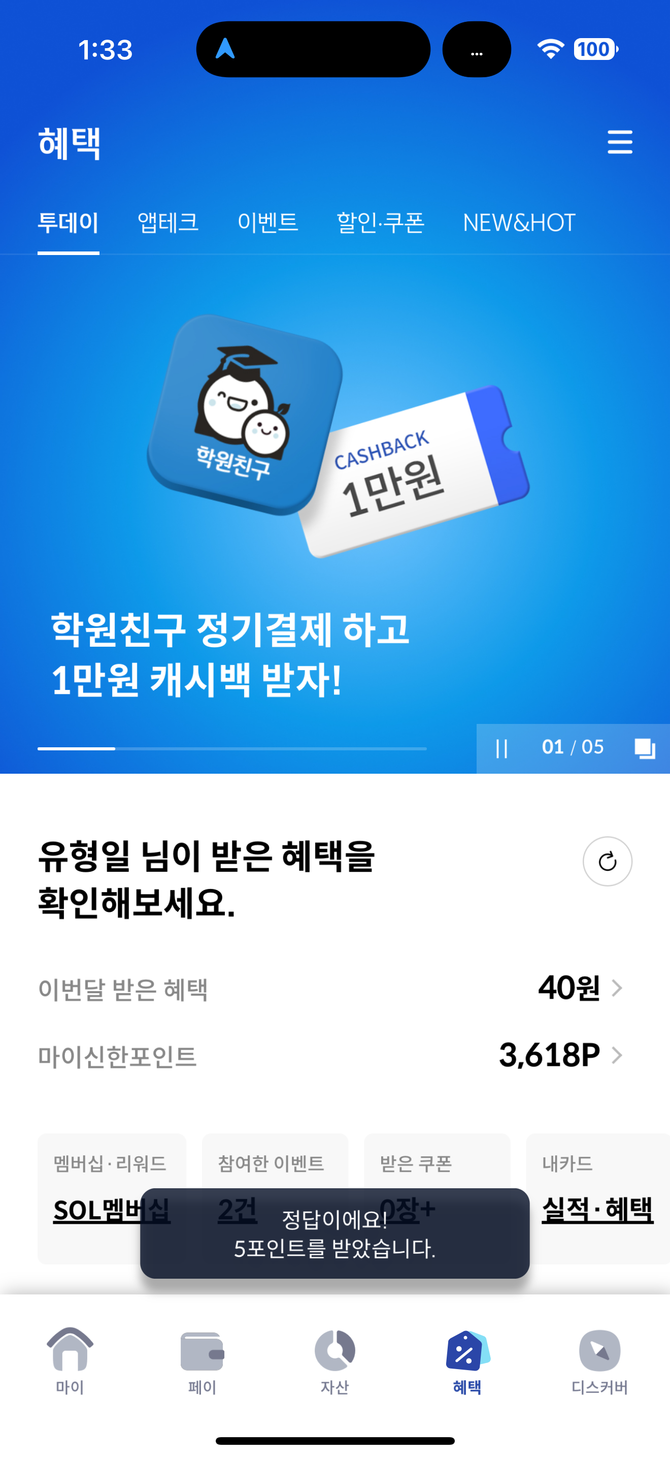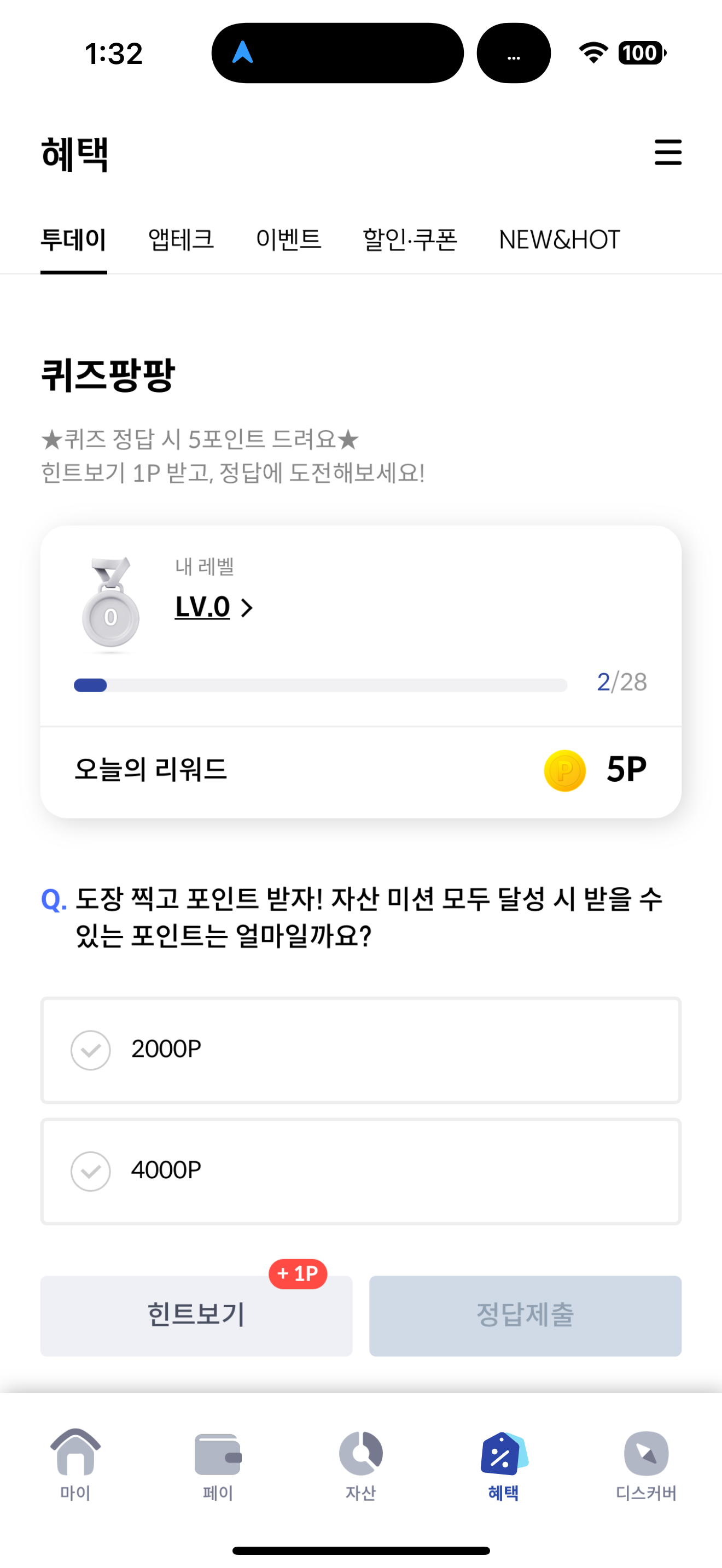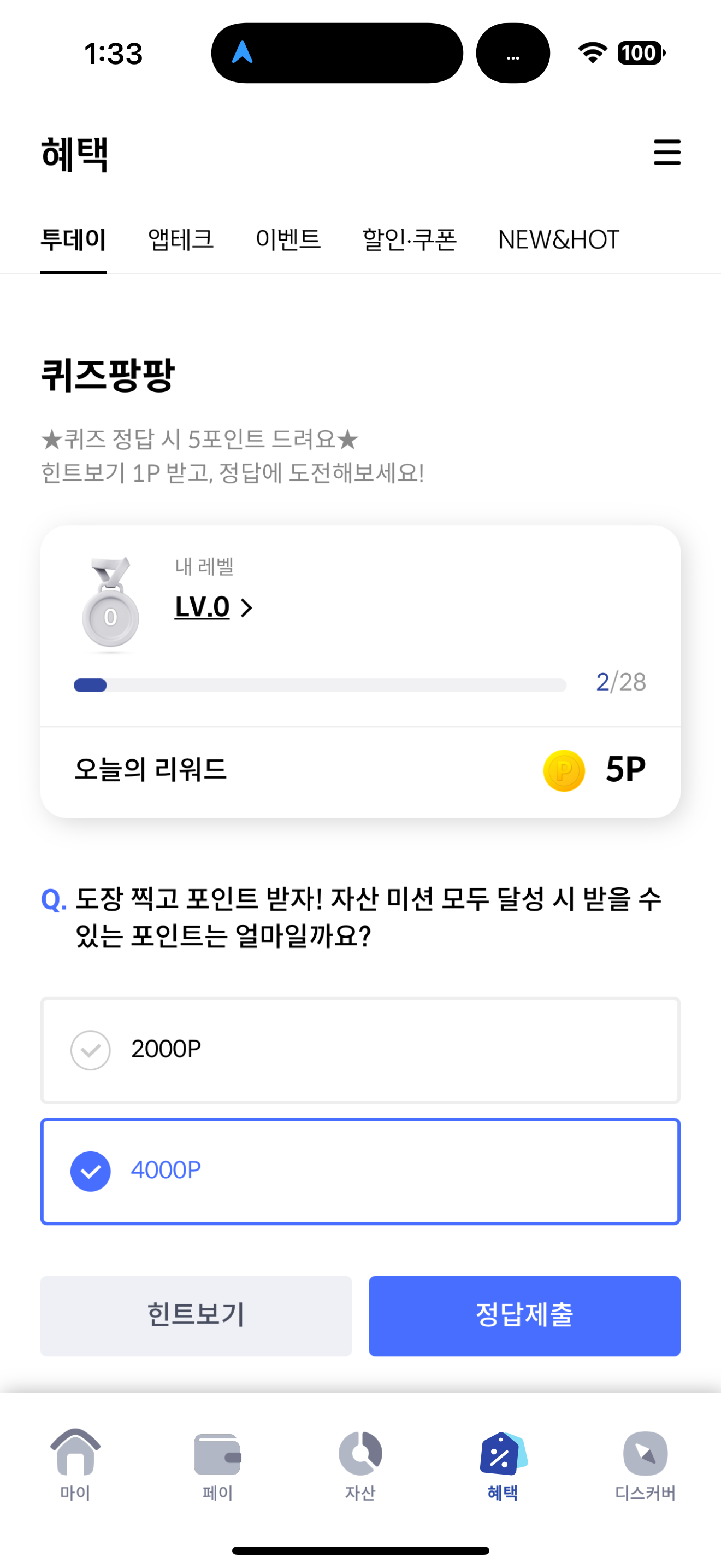 신한카드 퀴즈팡팡 정답은 4000P 입니다