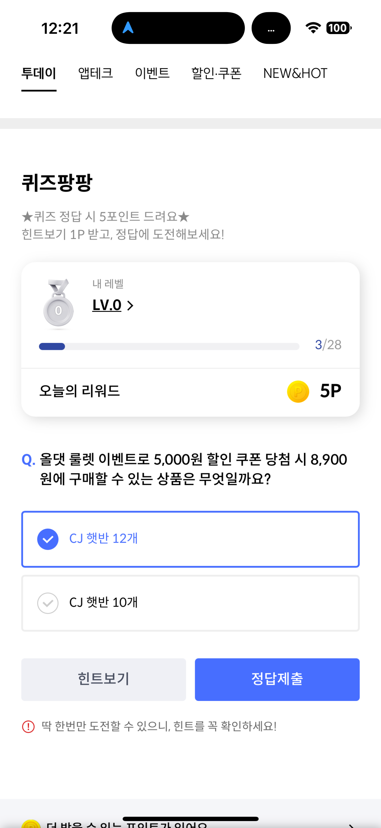 신한카드 퀴즈팡팡 정답은 CJ 햇반 12개 입니다