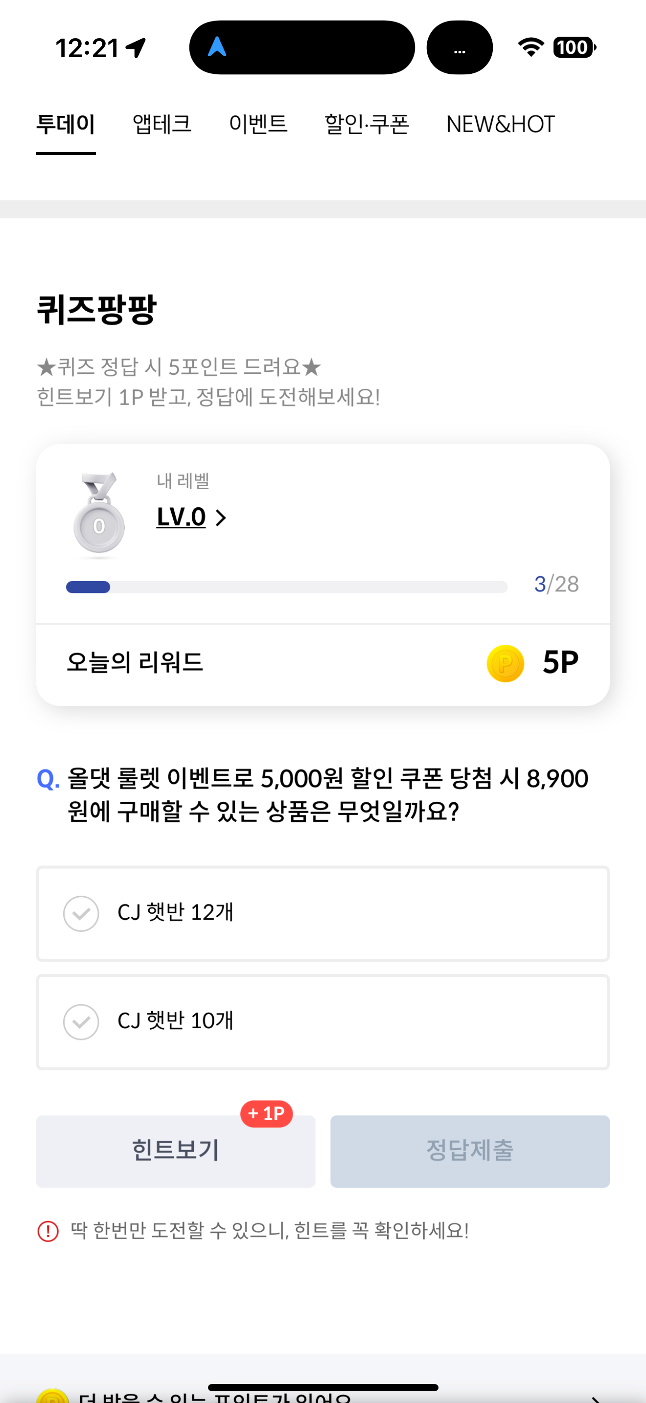 올댓 룰렛 이벤트로 5,000원 할인 쿠폰 당첨 시 8,900원에 구매할 수 있는 상품은 무엇일까요? 보기는 1. CJ햇반 12개 2. CJ햇반 10개 입니다. 올댓 룰렛 이벤트를 하면 다양한 할인 제품들을 받을 수 있습니다. 잘 참고해서 도전해 보세요