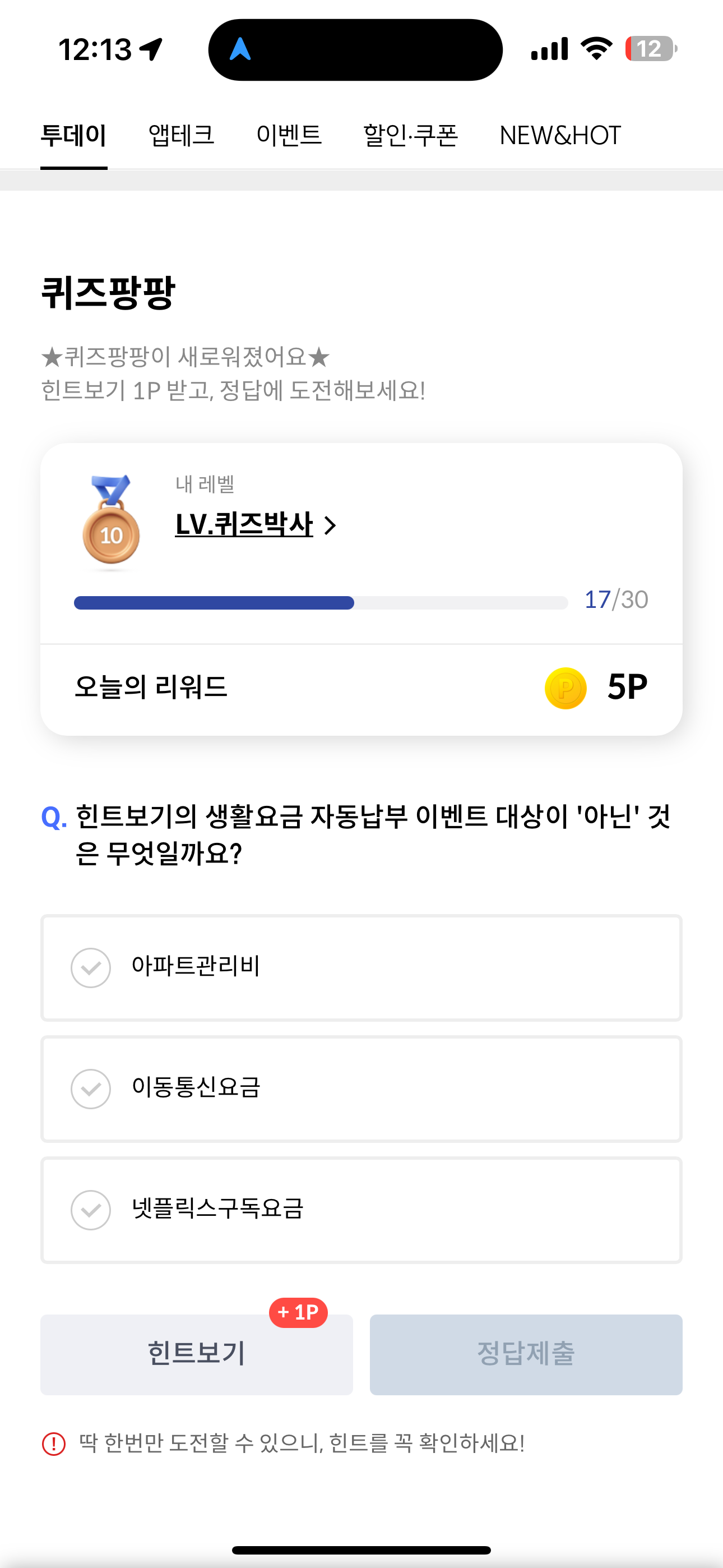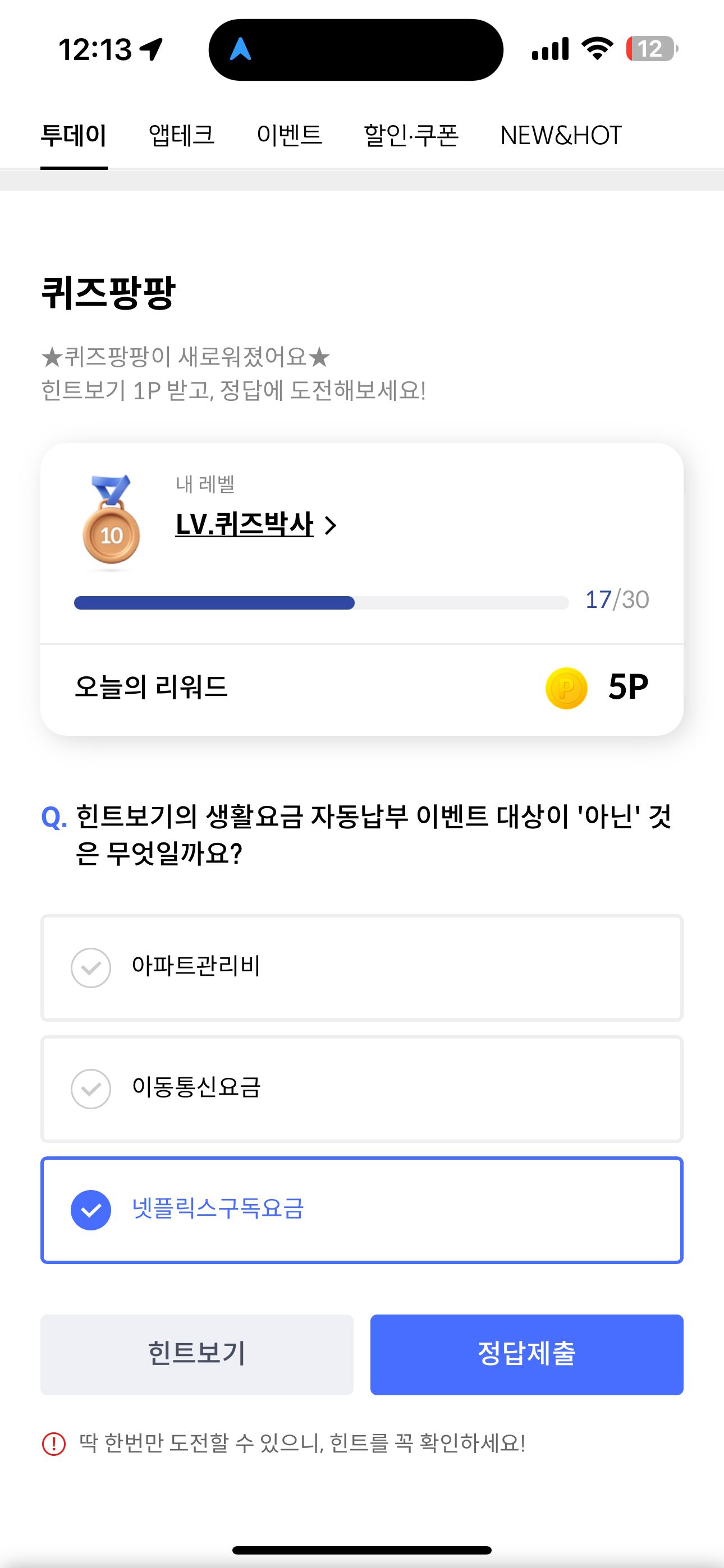 힌트보기의 생활요금 자동납부 이벤트 대상이 '아닌' 것은 무엇일까요? 보기는 1. 아파트관리비 2. 이동통신요금 3. 넷플릭스구독요금 입니다. 생활요금 자동납부 이벤트 대상에 포함되지 않는 것은 눈에 딱 보이죠. 아파트관리비, 이동통신요금은 생활요금이죠.