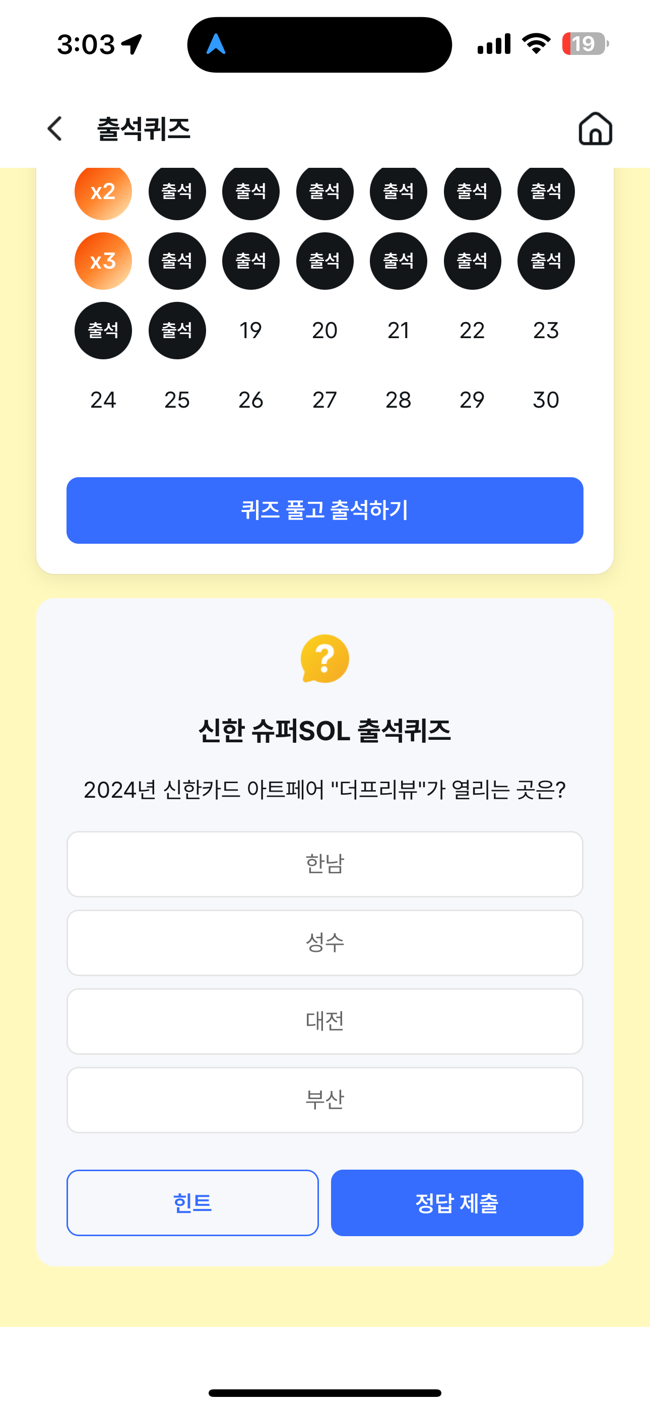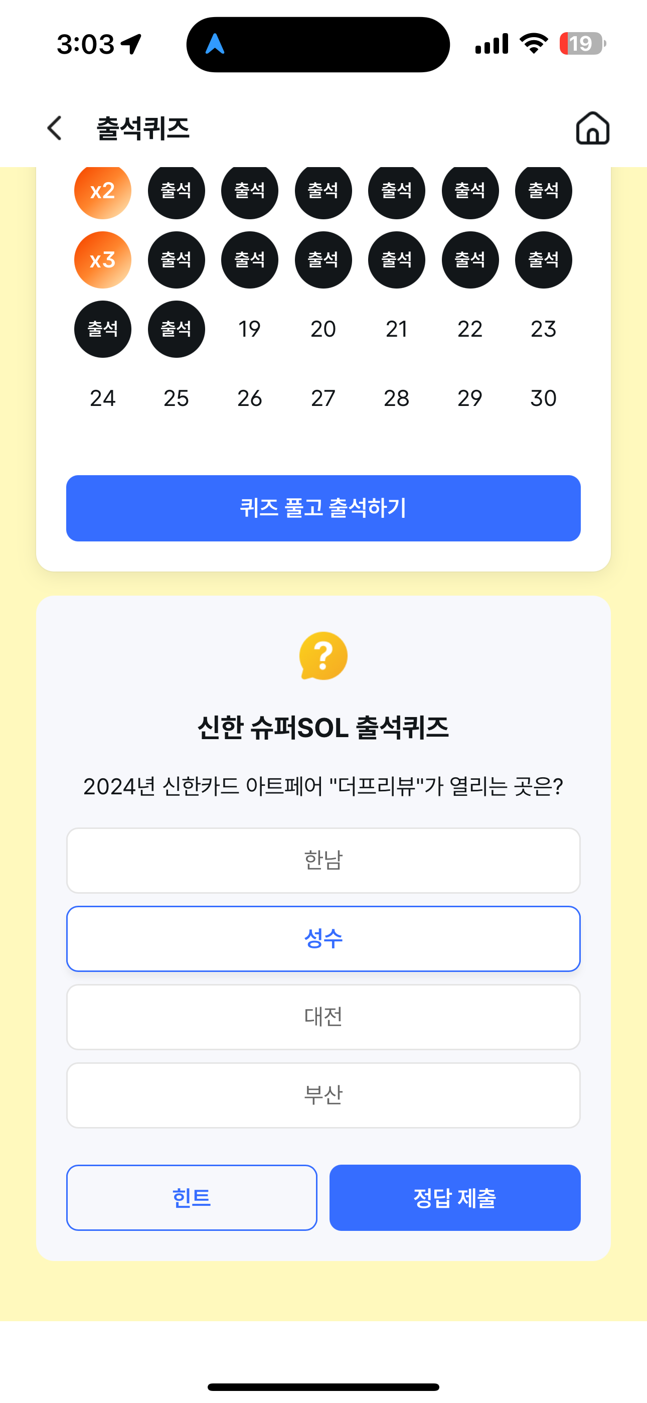 신한 슈퍼SOL 출석퀴즈 정답은 성수 입니다