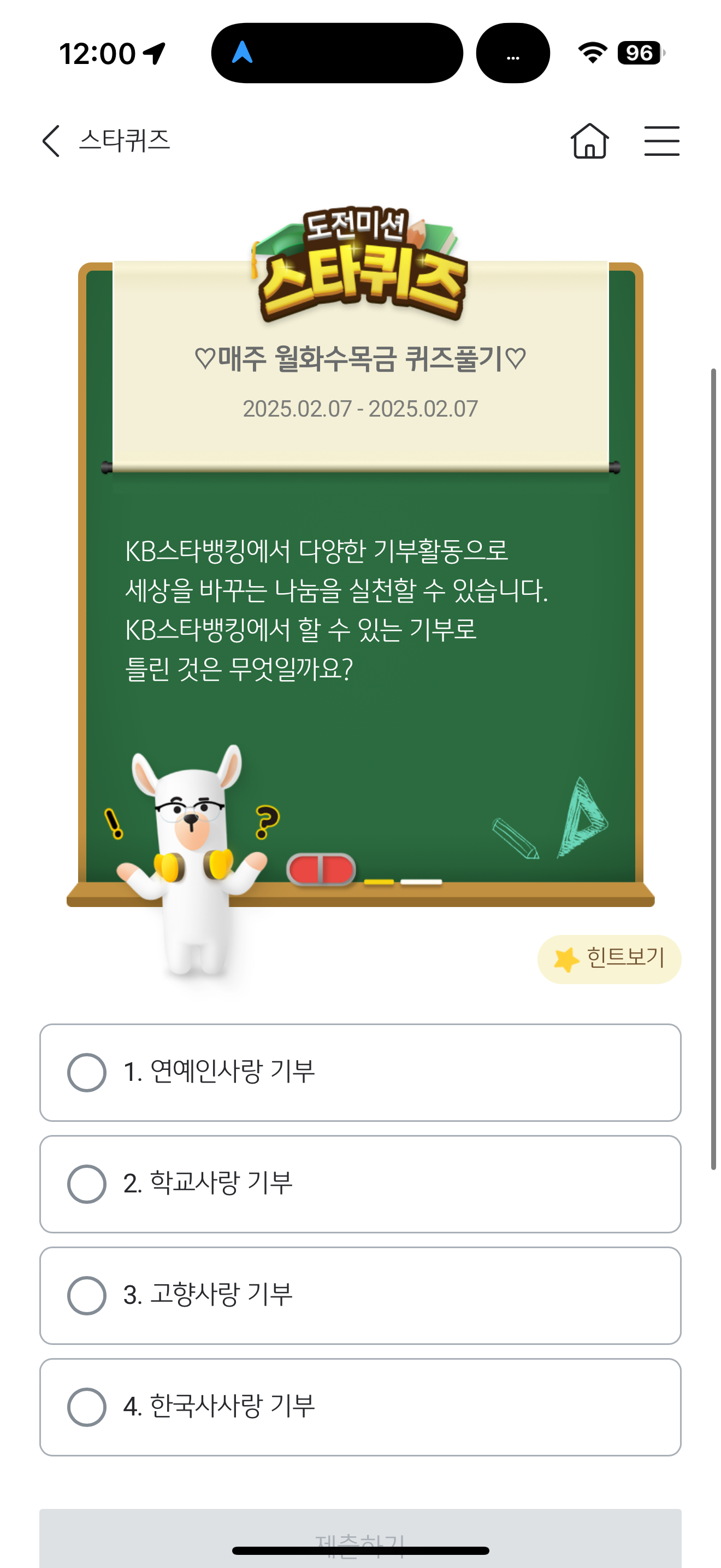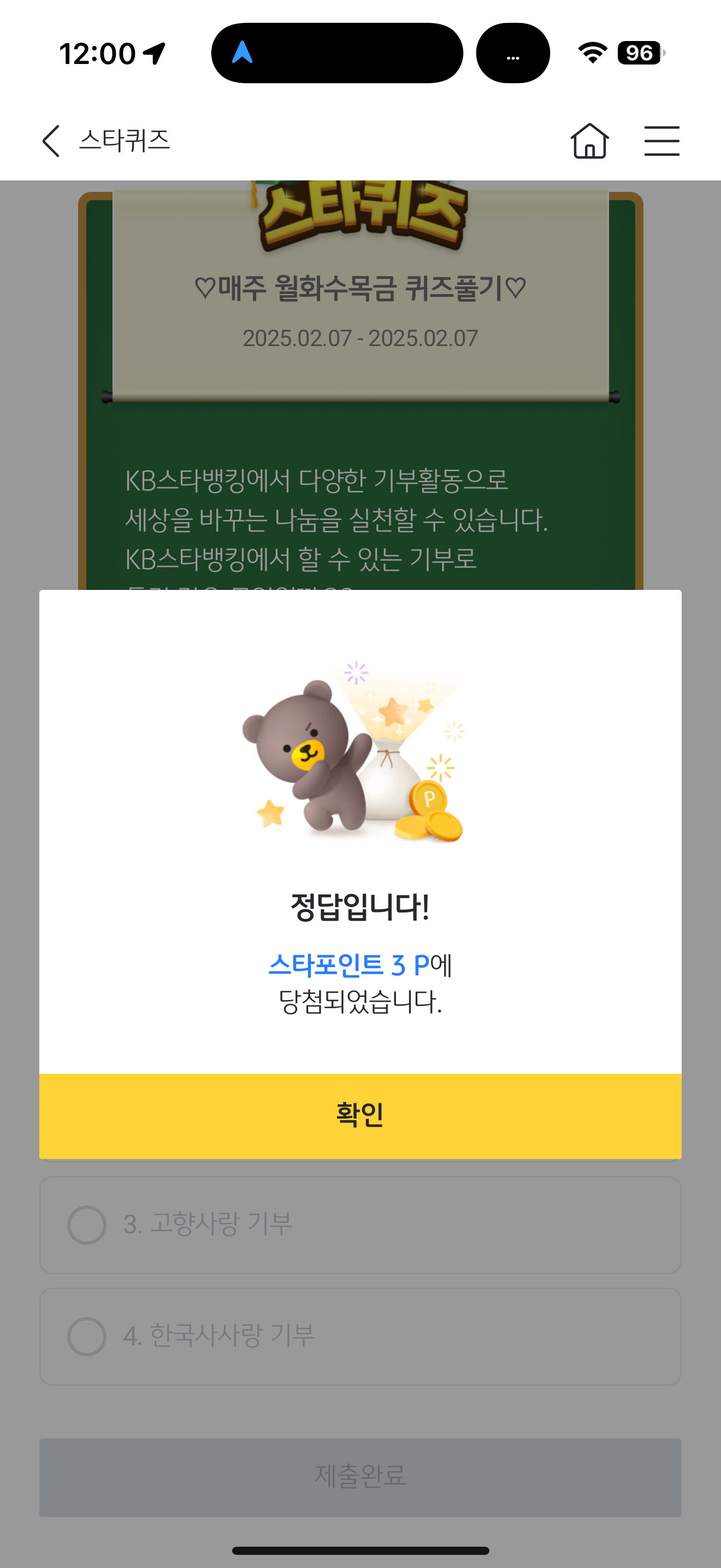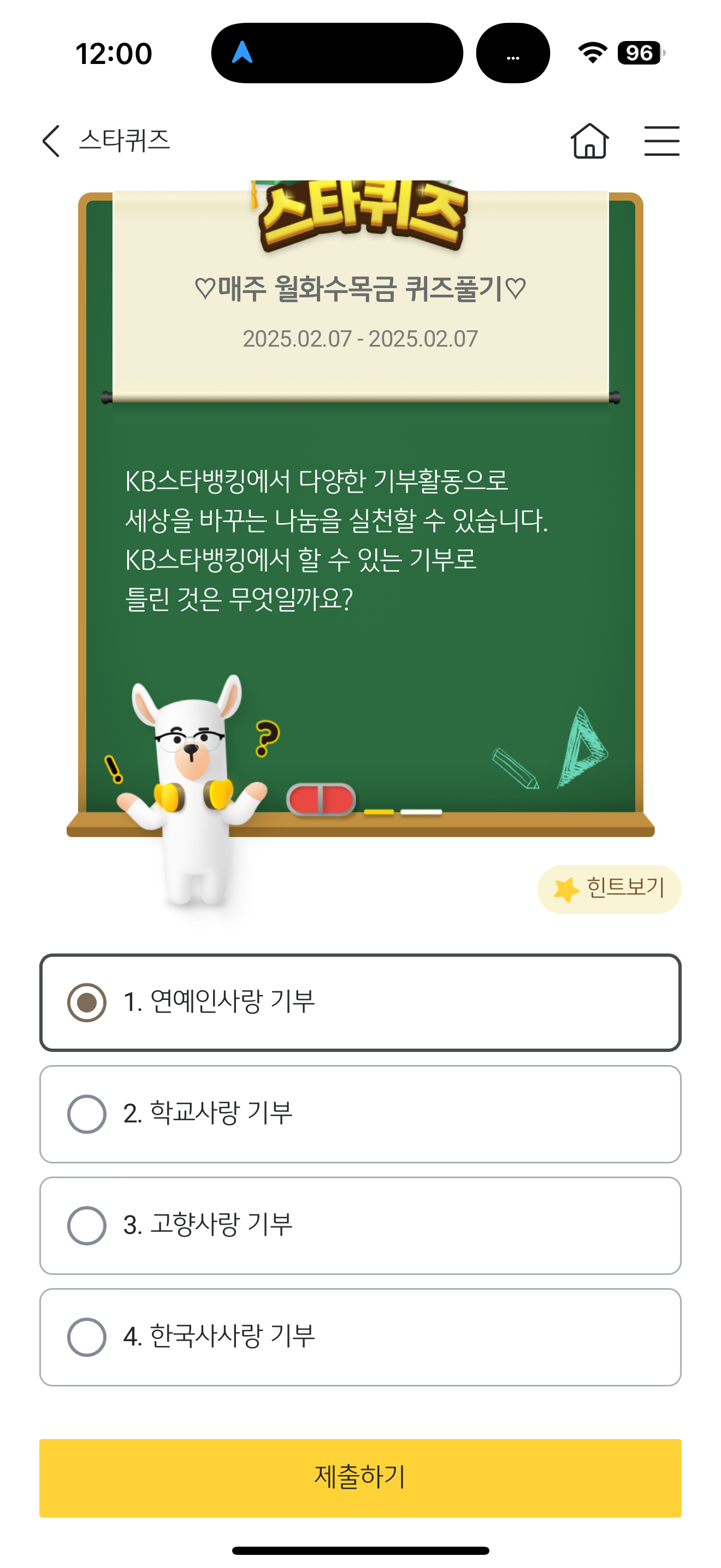 KB스타뱅킹 스타퀴즈 정답은 1. 연예인사랑 기부 입니다