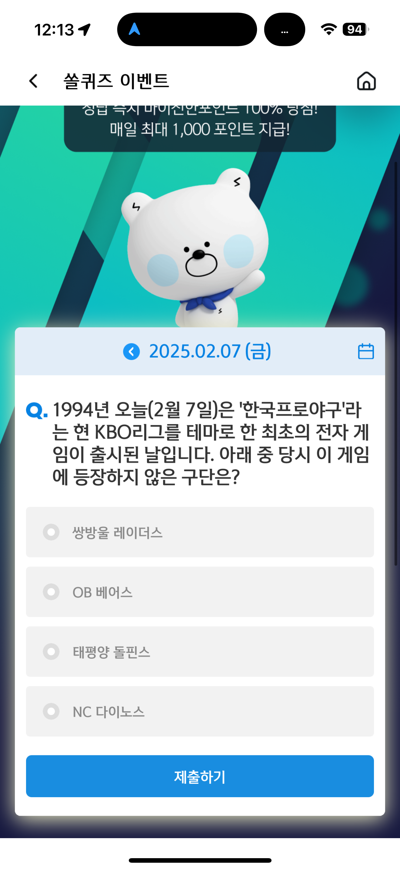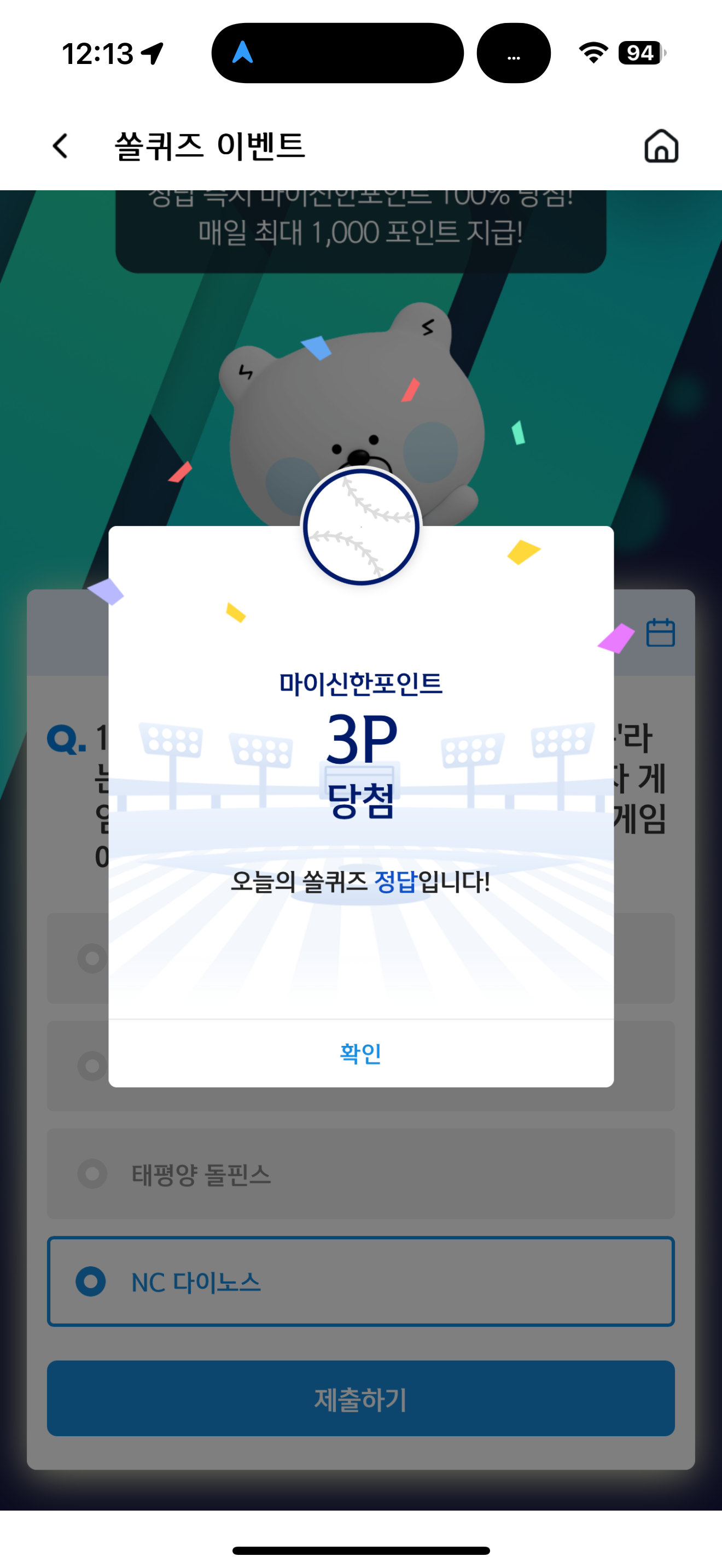 신한 슈퍼SOL 야구/상식 쏠퀴즈 정답은 NC 다이노스 입니다