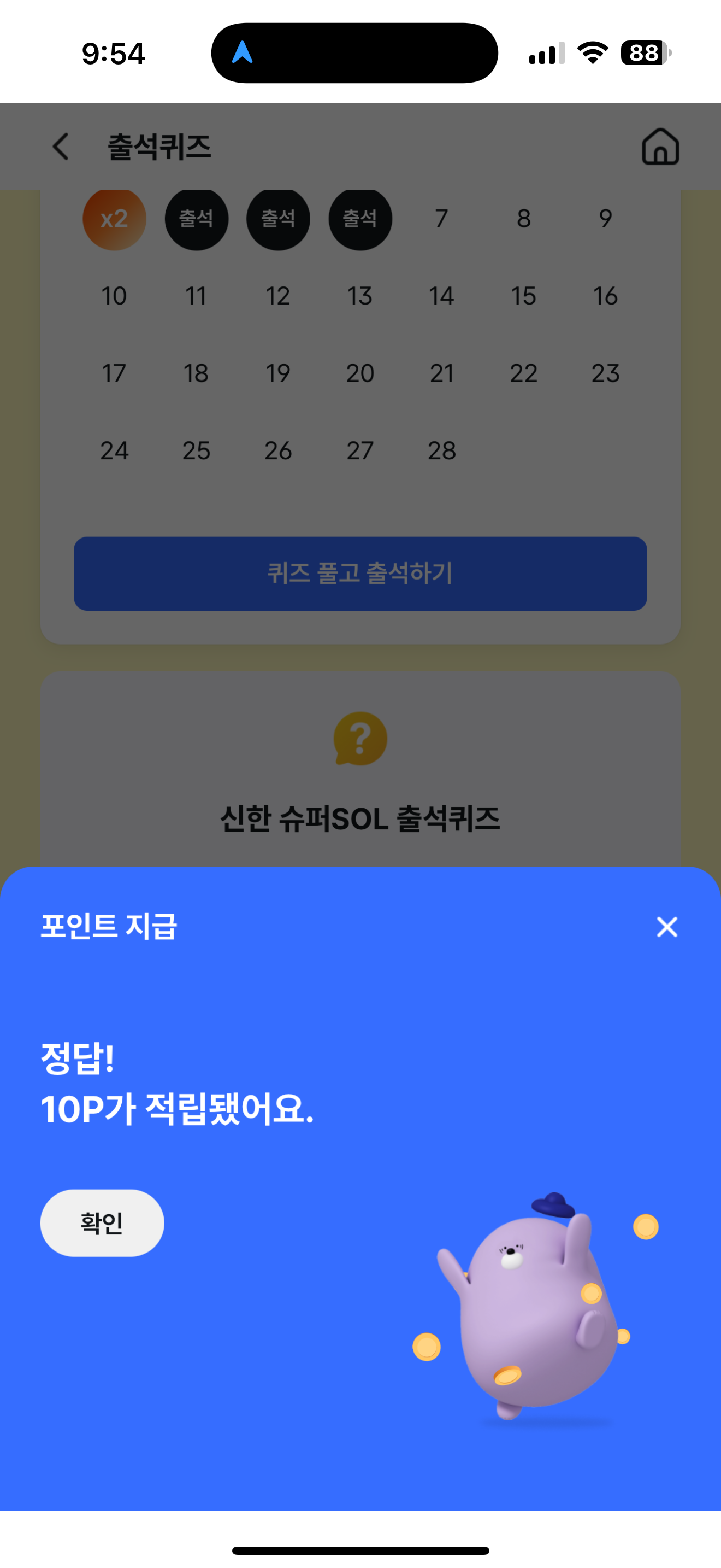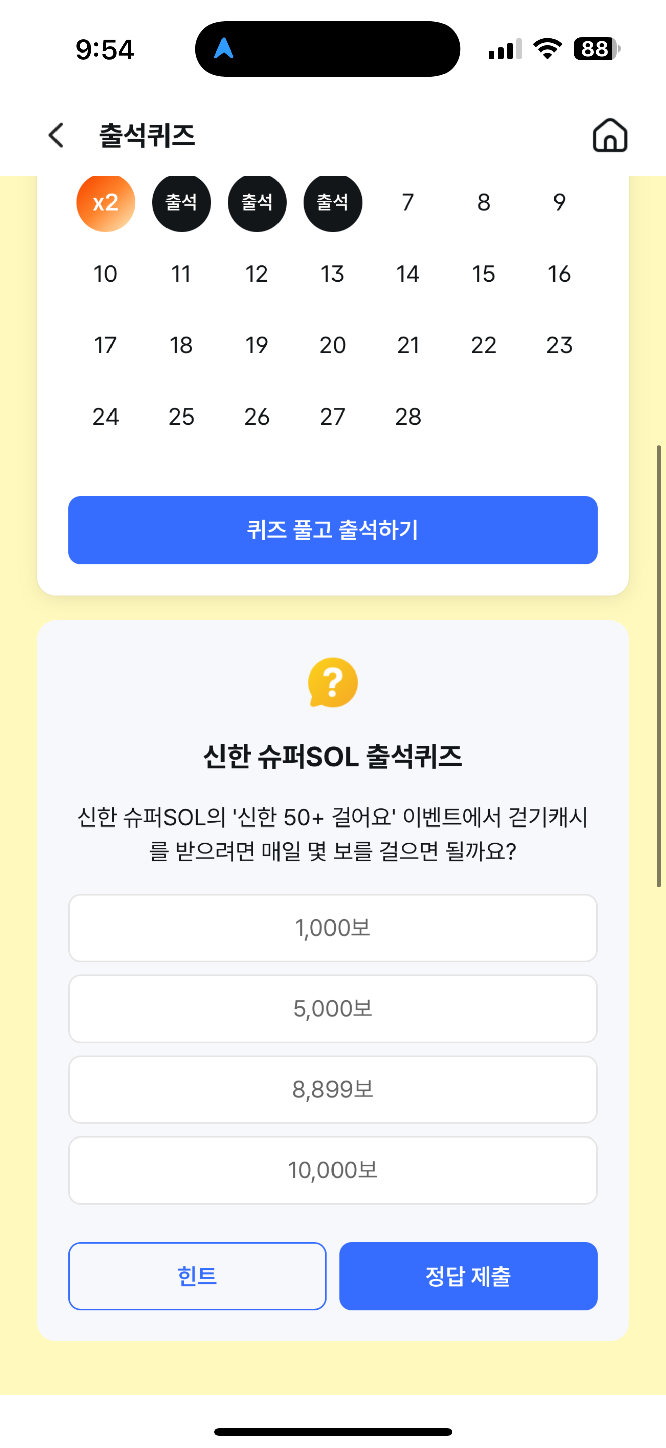 신한 슈퍼SOL 출석퀴즈 정답은 8,899보 입니다