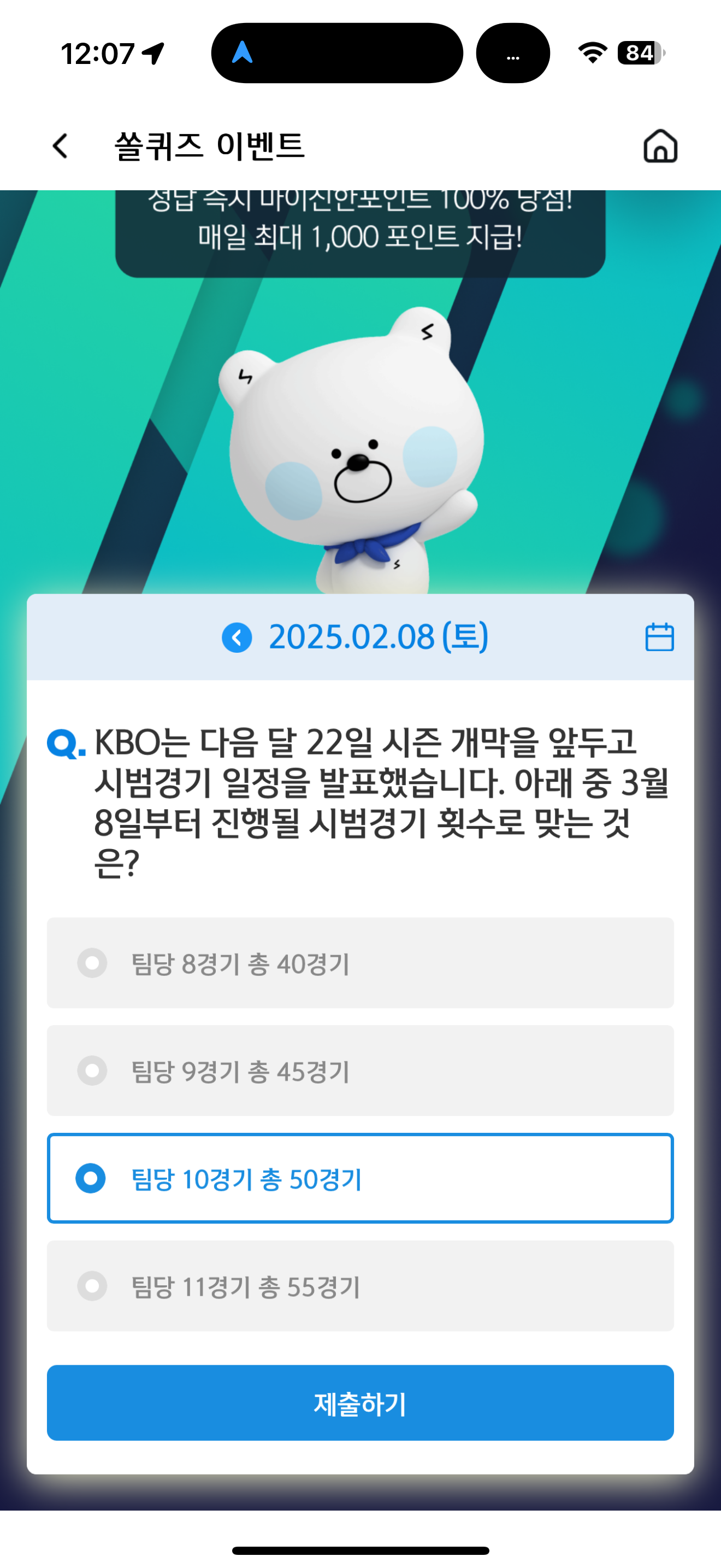 신한 슈퍼SOL 야구/상식 쏠퀴즈 정답은 팀당 10경기 총 50경기 입니다
