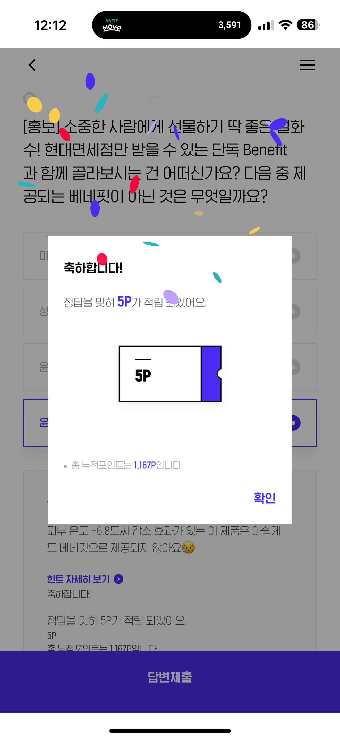 소중한 사람에게 선물하기 딱 좋은 설화수! 현대면세점만 받을 수 있는 단독 Benefit과 함께 골라보시는 건 어떠신가요? 다음 중 제공되는 베네핏이 아닌 것은 무엇일까요? 보기는 1. 마티나 라운지 이용권 2. 상백톤업선크림 3. 윤조 에센스 등 증정품 키트 4. 윤조마스크 입니다