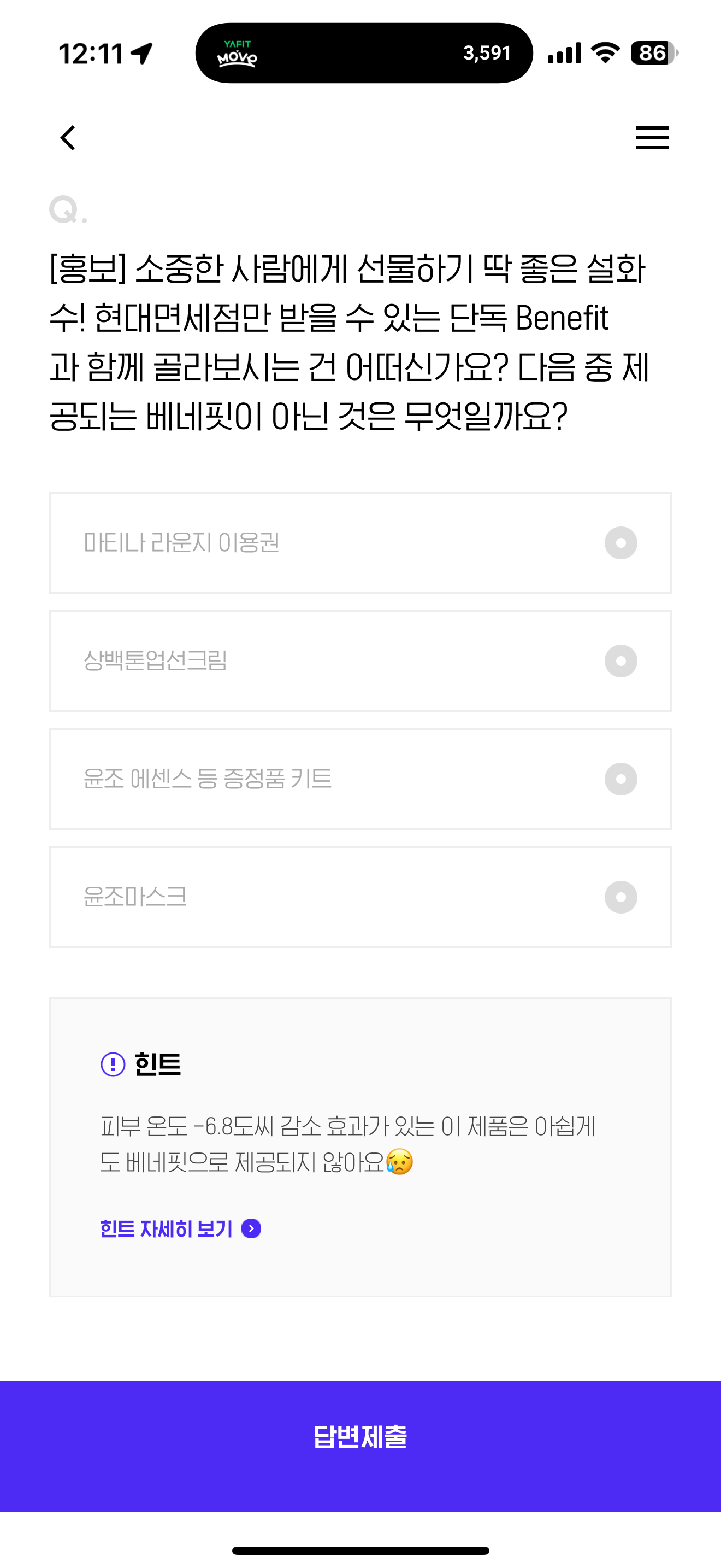 소중한 사람에게 선물하기 딱 좋은 설화수! 현대면세점만 받을 수 있는 단독 Benefit과 함께 골라보시는 건 어떠신가요? 다음 중 제공되는 베네핏이 아닌 것은 무엇일까요? 보기는 1. 마티나 라운지 이용권 2. 상백톤업선크림 3. 윤조 에센스 등 증정품 키트 4. 윤조마스크 입니다
