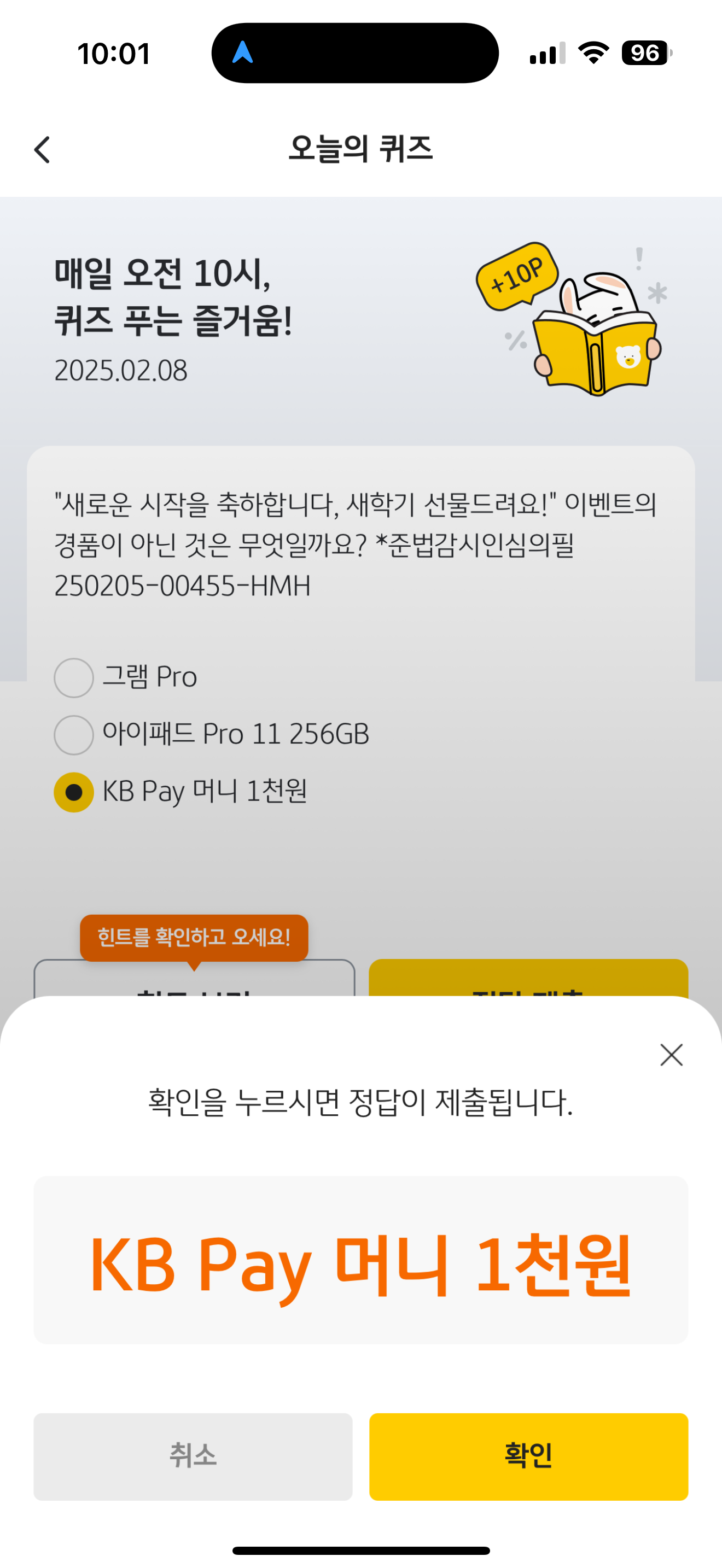 KB Pay 오늘의 퀴즈 정답은 KB Pay 머니 1천원 입니다