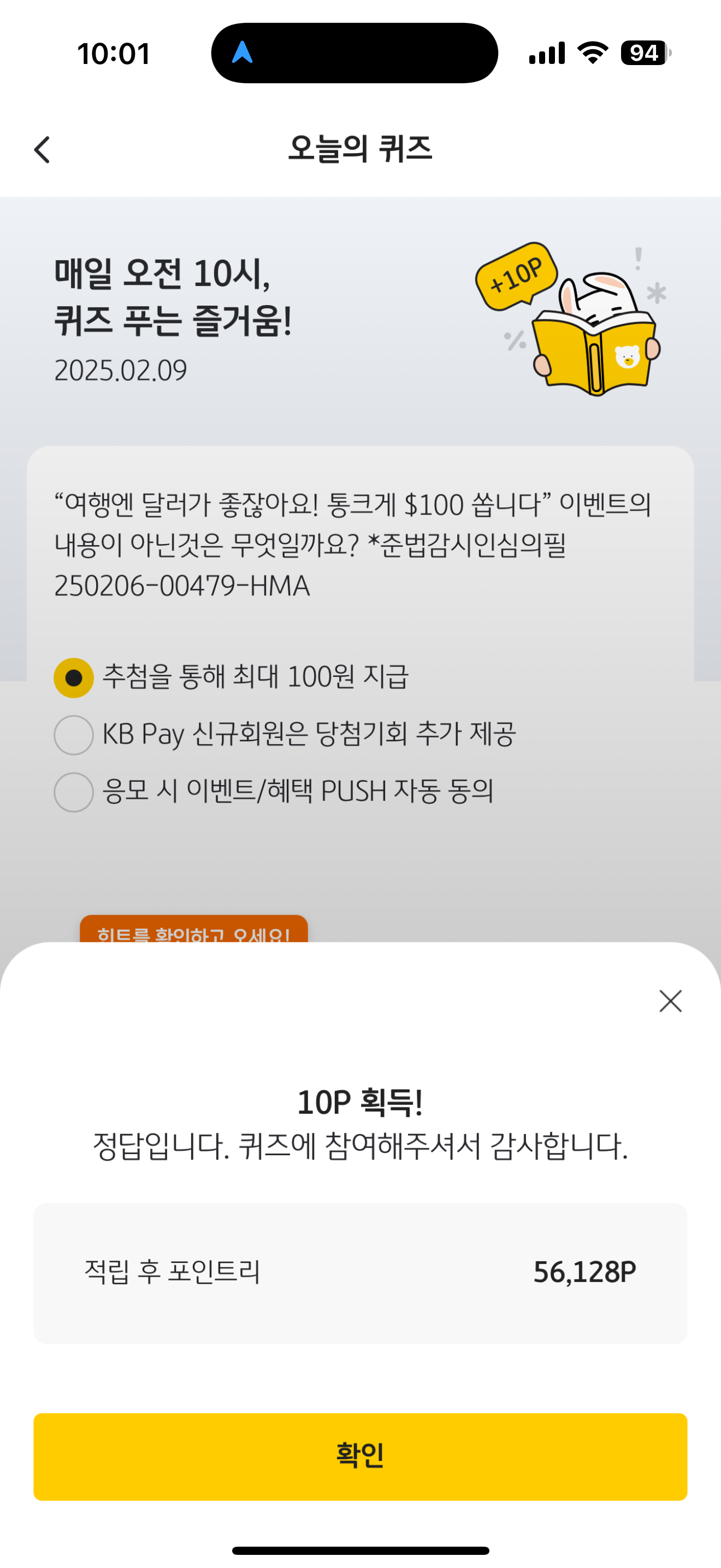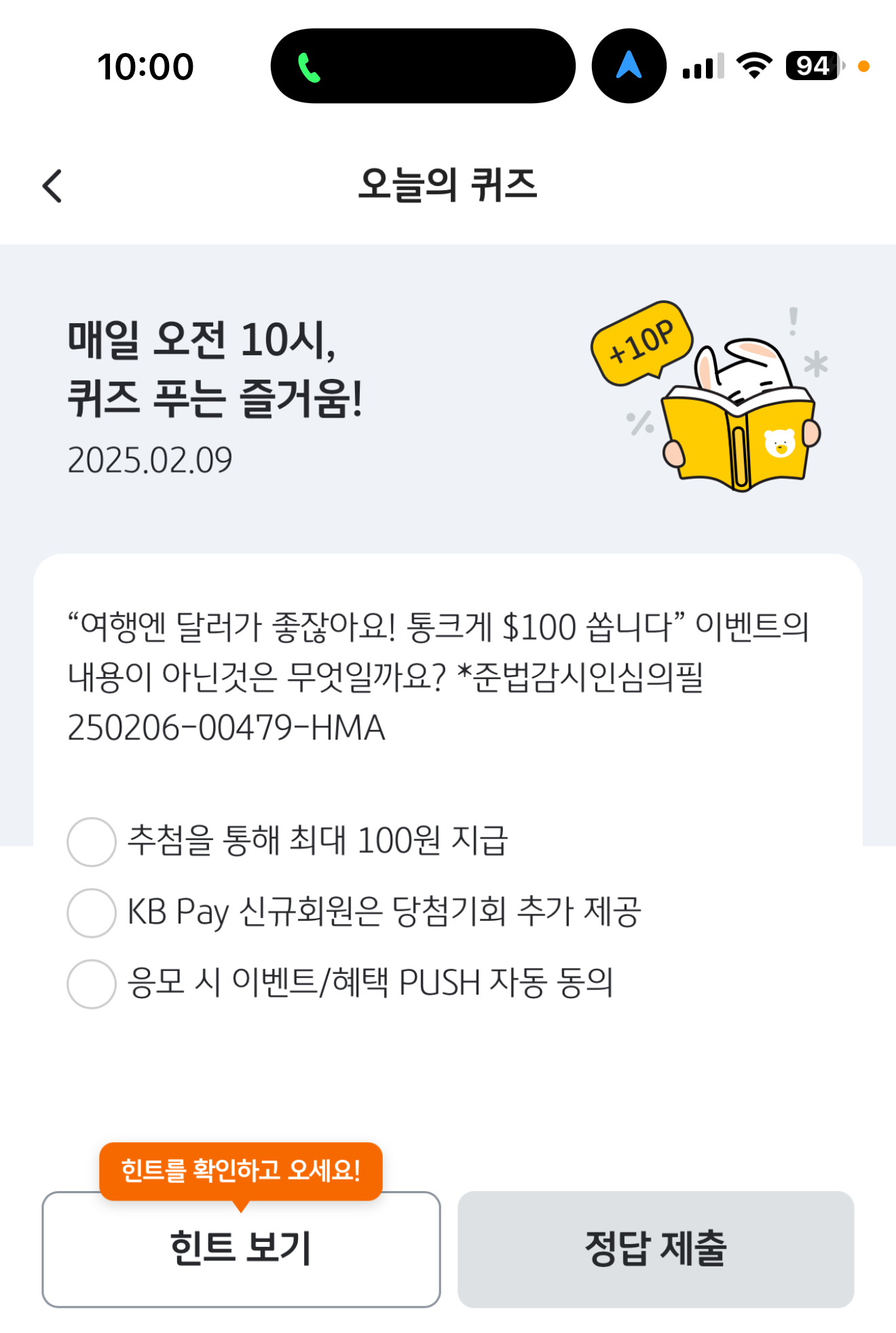 "여행엔 달러가 좋잖아요! 통크게 $100 쏩니다" 이벤트의 내용이 아닌것은 무엇일까요? *준법감시인심의필250206-00479-HMA 보기는 1. 추첨을 통해 최대 100원 지금 2. KB Pay 신규회원은 당첨기회 추가 제공 3. 응모 시 이벤트/혜택 PUSH 자동 동의 입니다