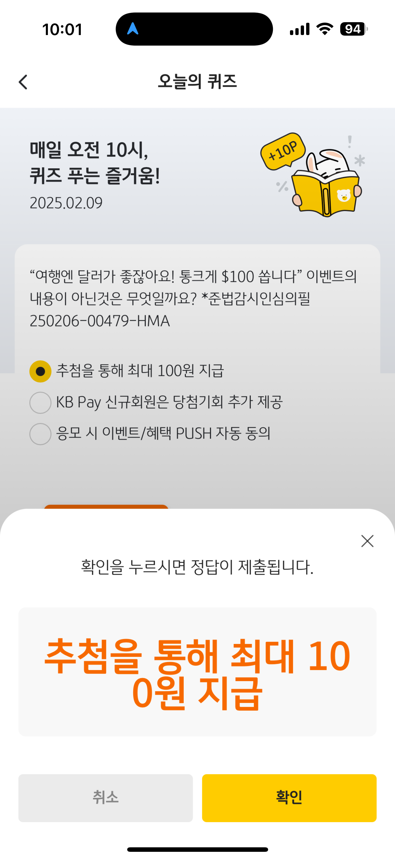 KB Pay 오늘의 퀴즈 정답은 추첨을 통해 최대 100원 지급 입니다