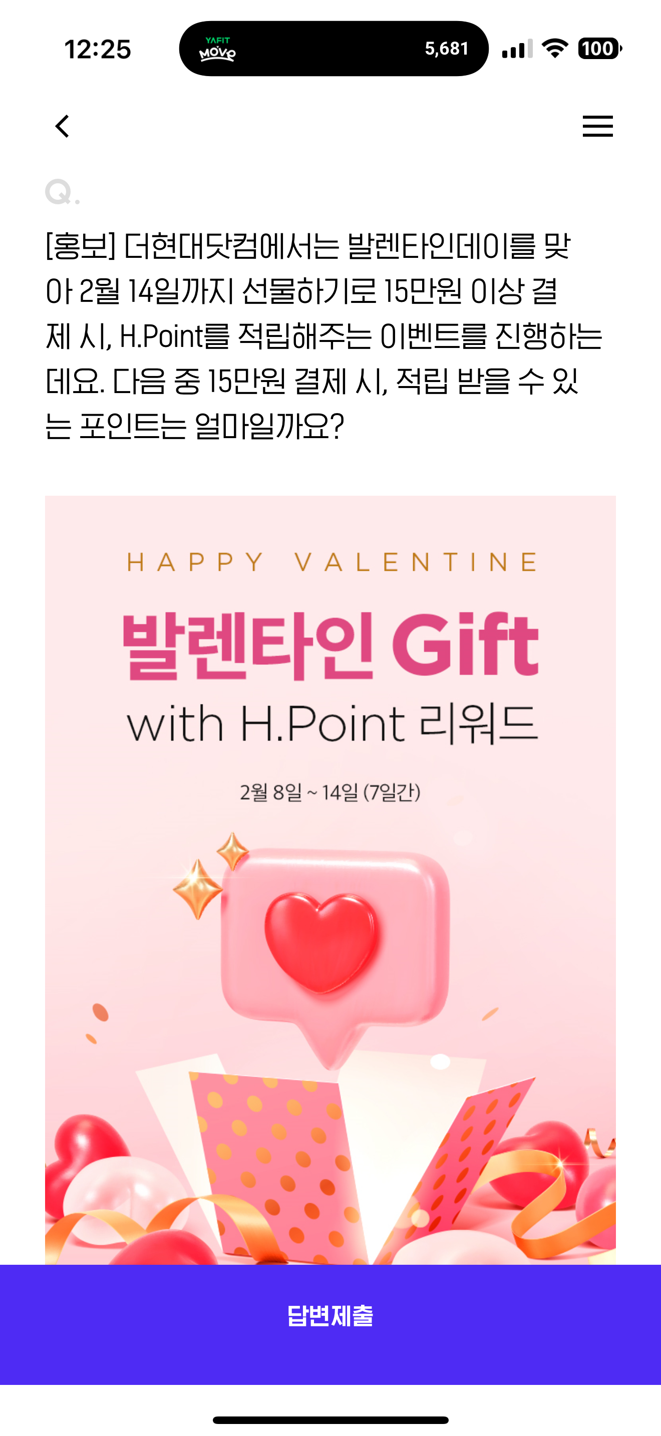 더현대닷컴에서는 발렌타인데이를 맞아 2월 14일까지 선물하기로 15만원 이상 결제 시, H.Point를 적립해주는 이벤트를 진행하는데요. 다음 중 15만원 결제 시, 적립 받을 수 있는 포인트는 얼마일까요? 보기는 1. 5천원 2. 1만원 3. 1만 5천원 4. 2만원 입니다