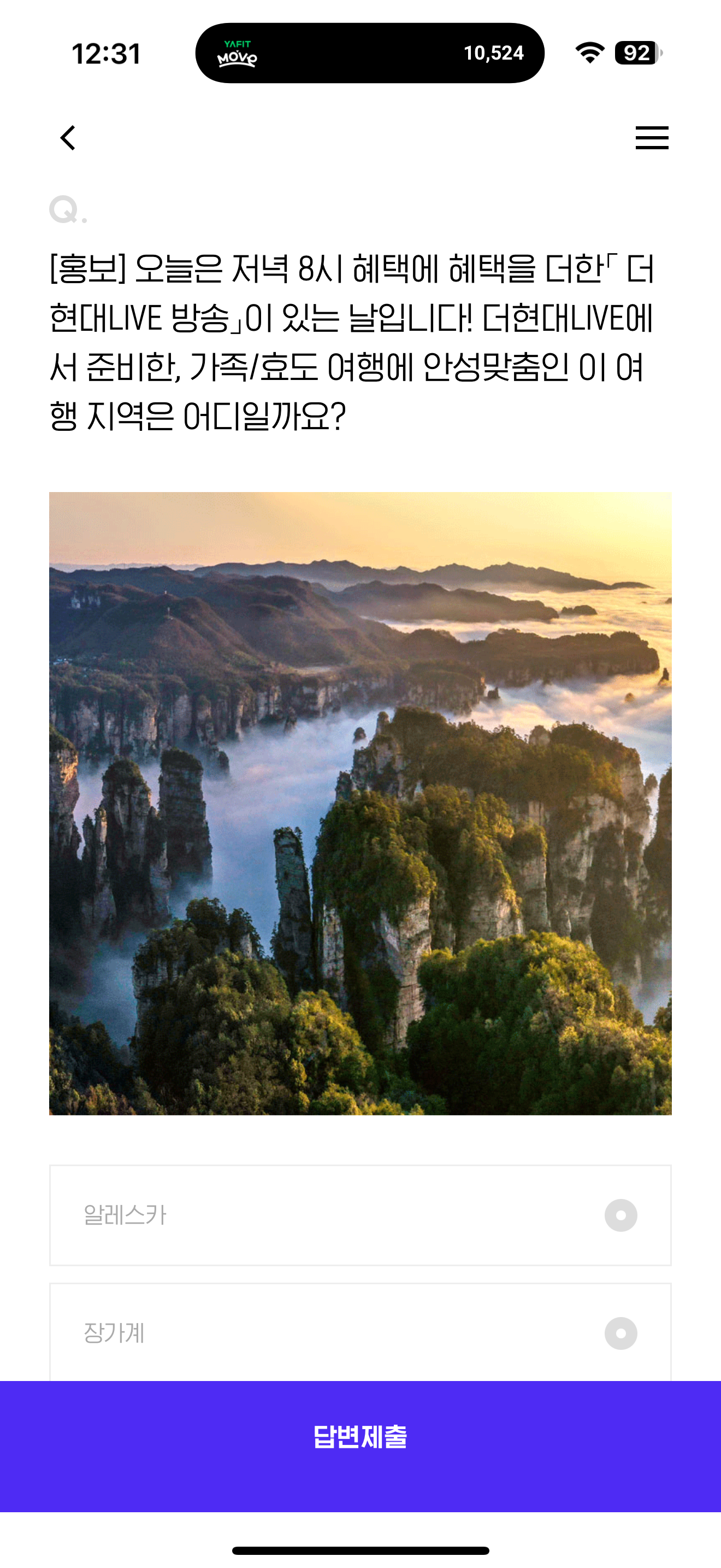 오늘은 저녁 8시 혜택에 혜택을 더한 더현대LIVE 방송이 있는 날입니다! 더현대LIVE에서 준비한, 가족/효도 여행에 안성맞춤인 이 여행 지역은 어디일까요? 보기는 1. 알레스카 2. 장가계 3. 브라질 아마존 4. 북극 입니다. 가족 여행지로 대표적인 곳이고 실제로도 아주 만족도가 높은 여행지 입니다