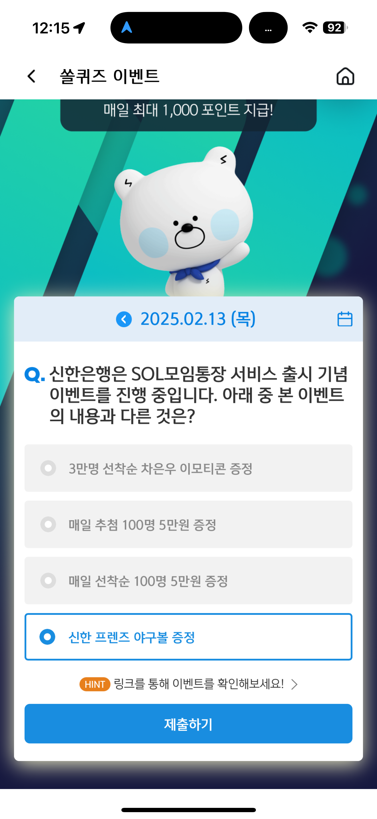 신한 슈퍼SOL 야구/상식 쏠퀴즈 정답은 신한 프렌즈 야구볼 증정 입니다