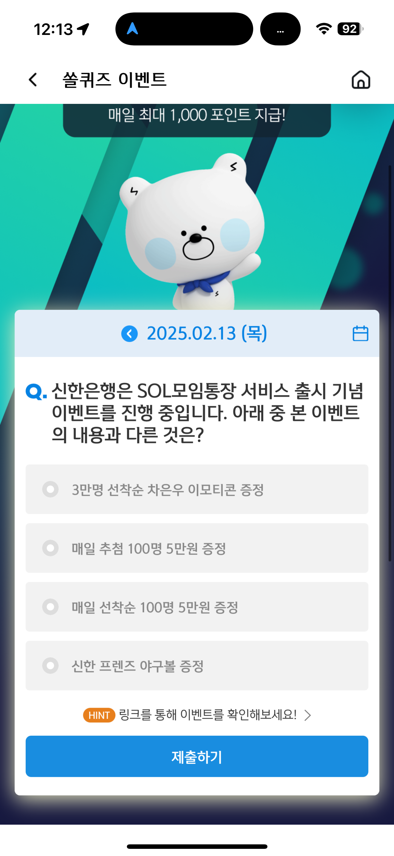 신한 슈퍼SOL 야구/상식 쏠퀴즈 2월 13일 문제입니다