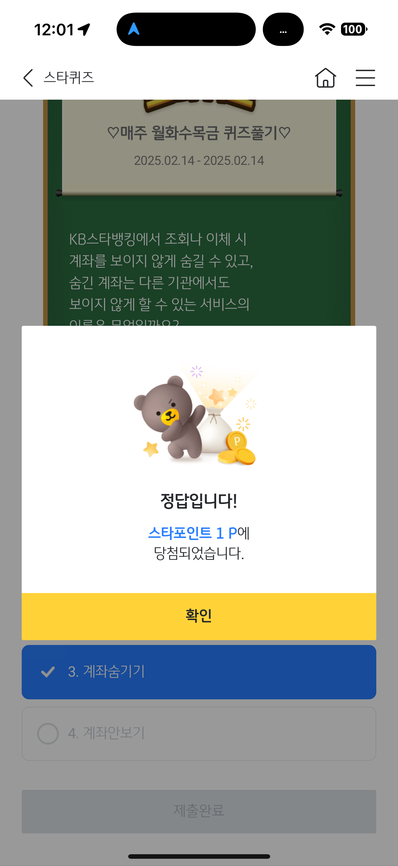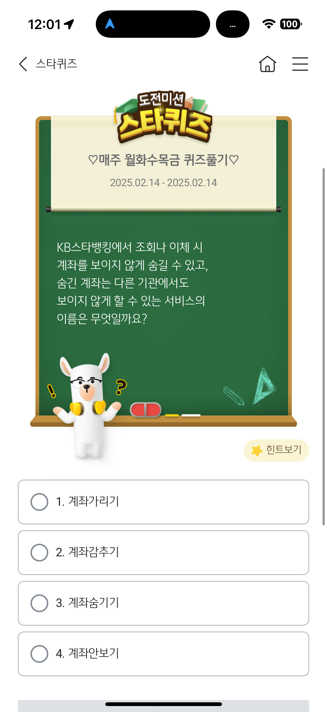 KB스타뱅킹 스타퀴즈 정답은 3. 계좌숨기기 입니다
