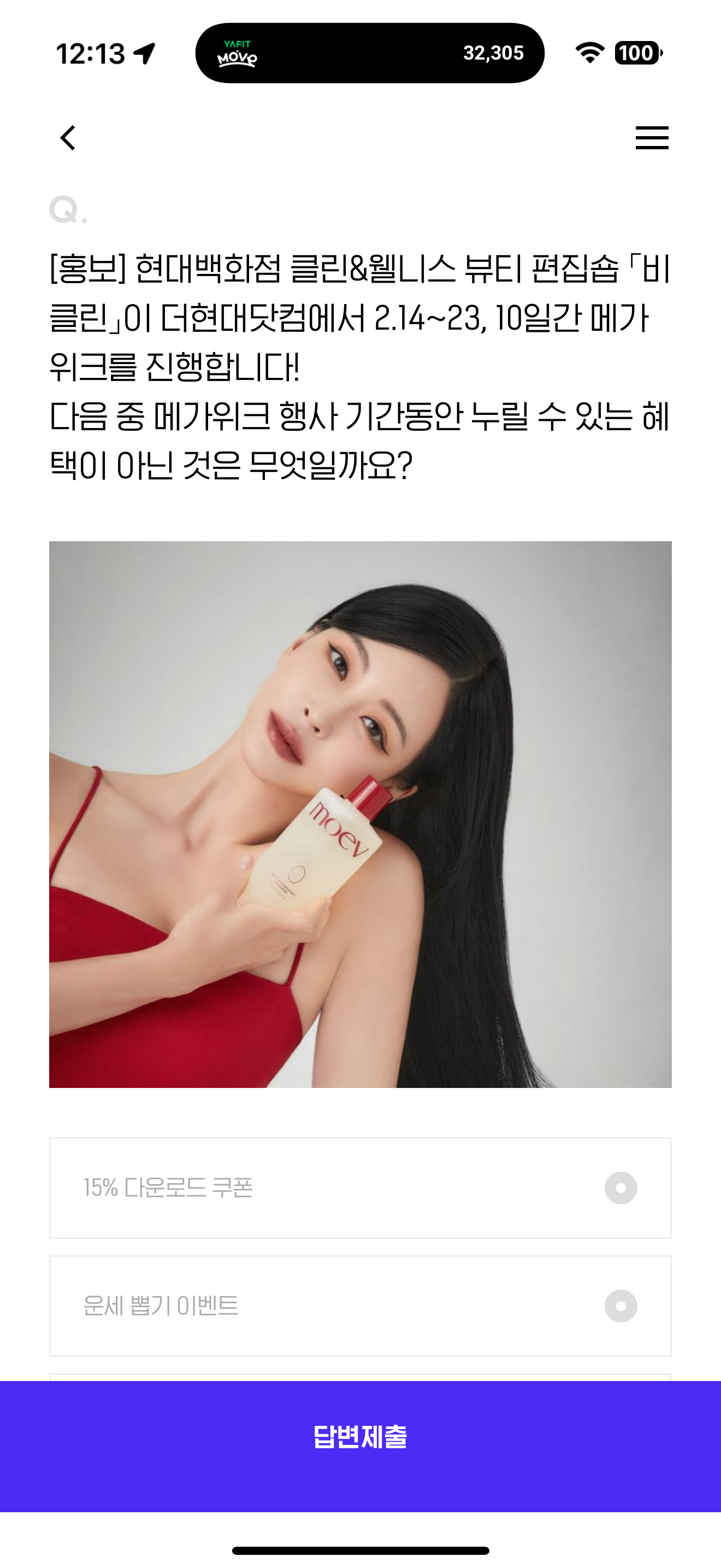 현대백화점 클린&웰니스 뷰티 편집숍 비클린이 더현대닷컴에서 2.14~23, 10일간 메가위크를 진행합니다. 다음 중 메가위크 행사 기간동안 누릴 수 있는 혜택이 아닌 것은 무엇일까요? 보기는 1. 15% 다운로드 쿠폰 2. 운세 뽑기 이벤트 3. 현대백화점카드 7% 혜택 4. 신상품 선런칭 혜택