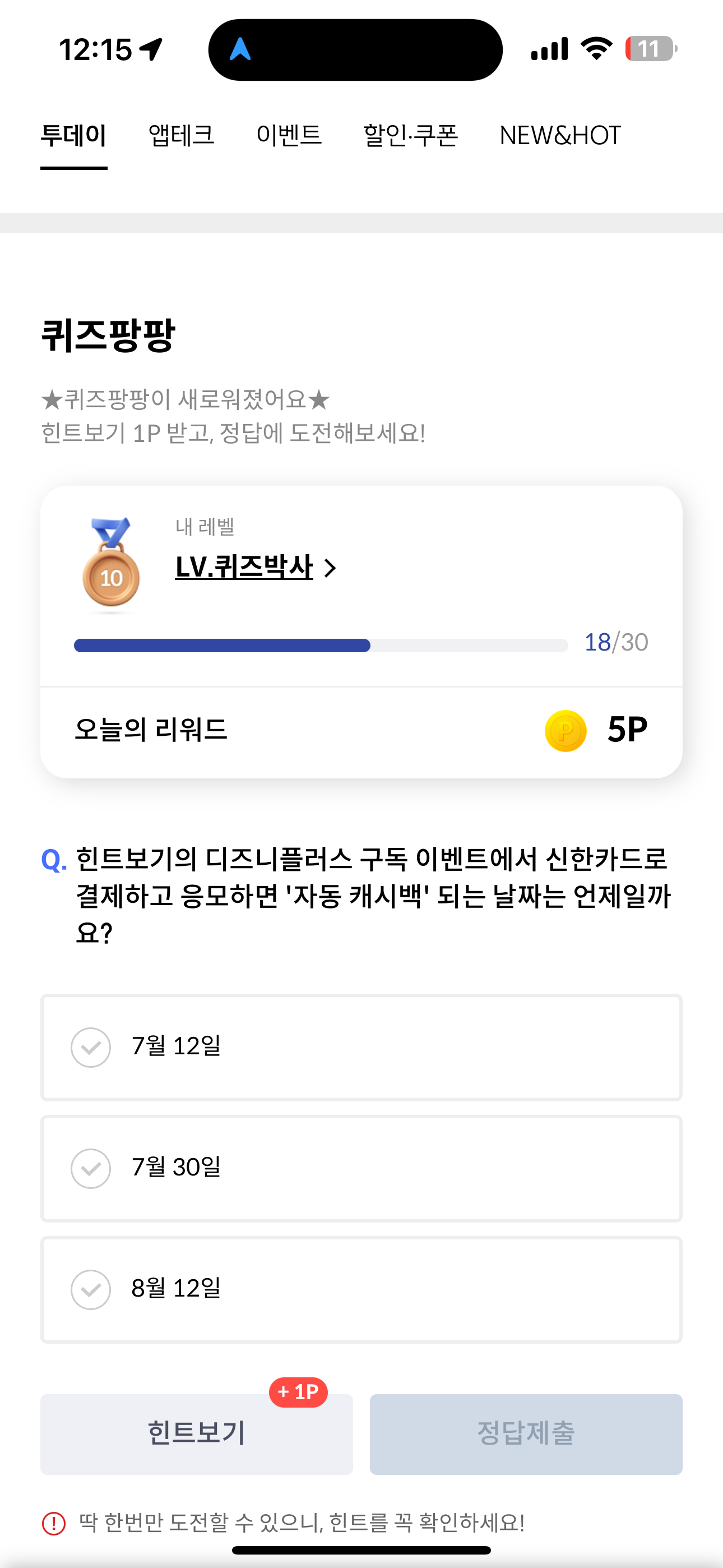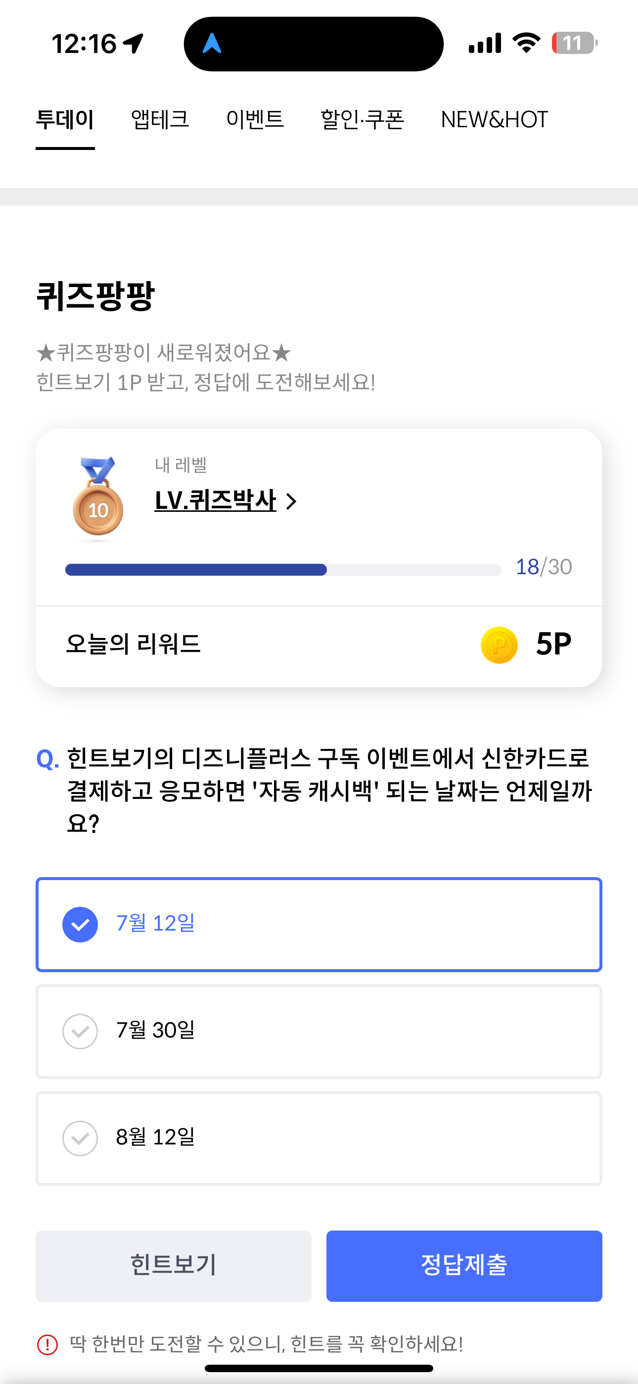 신한카드 퀴즈팡팡 정답은 7월 12일 입니다