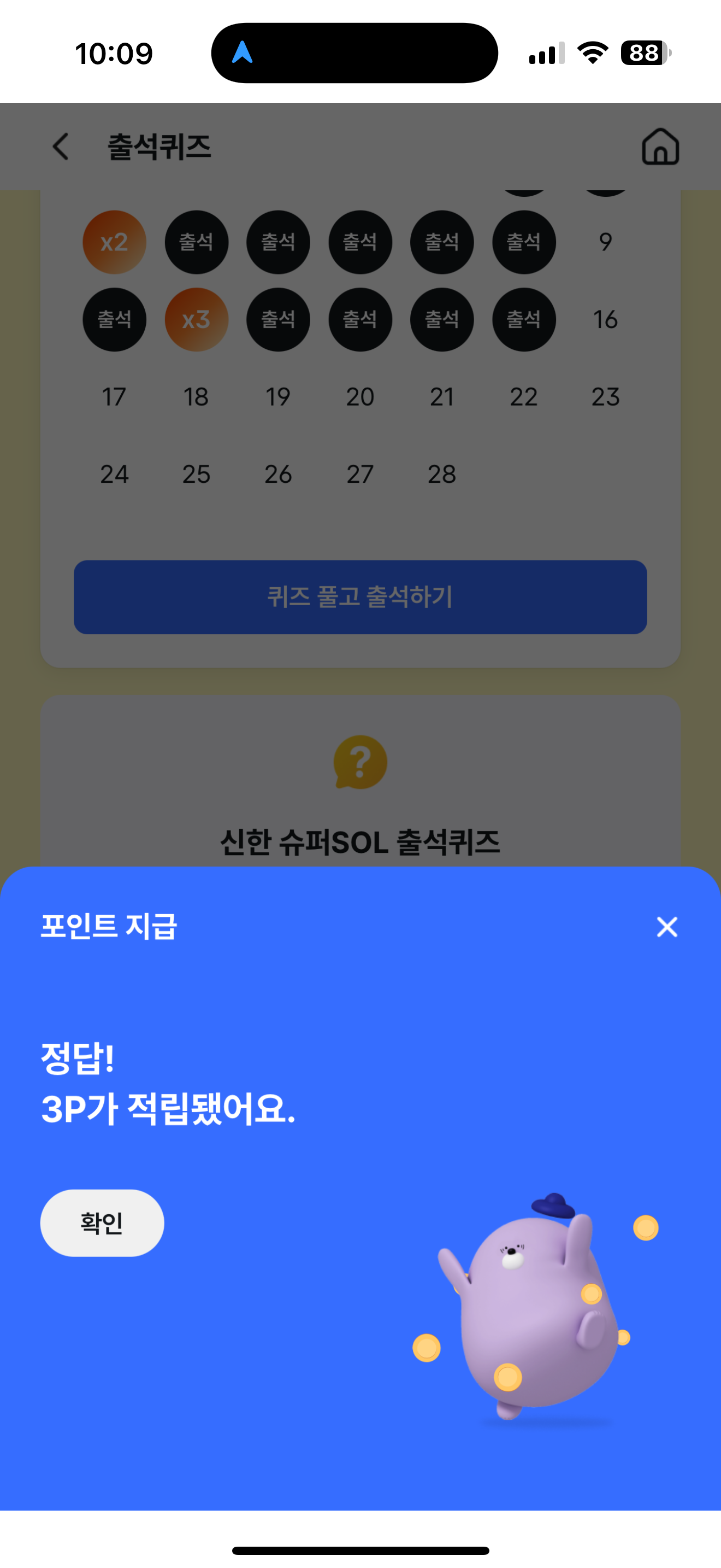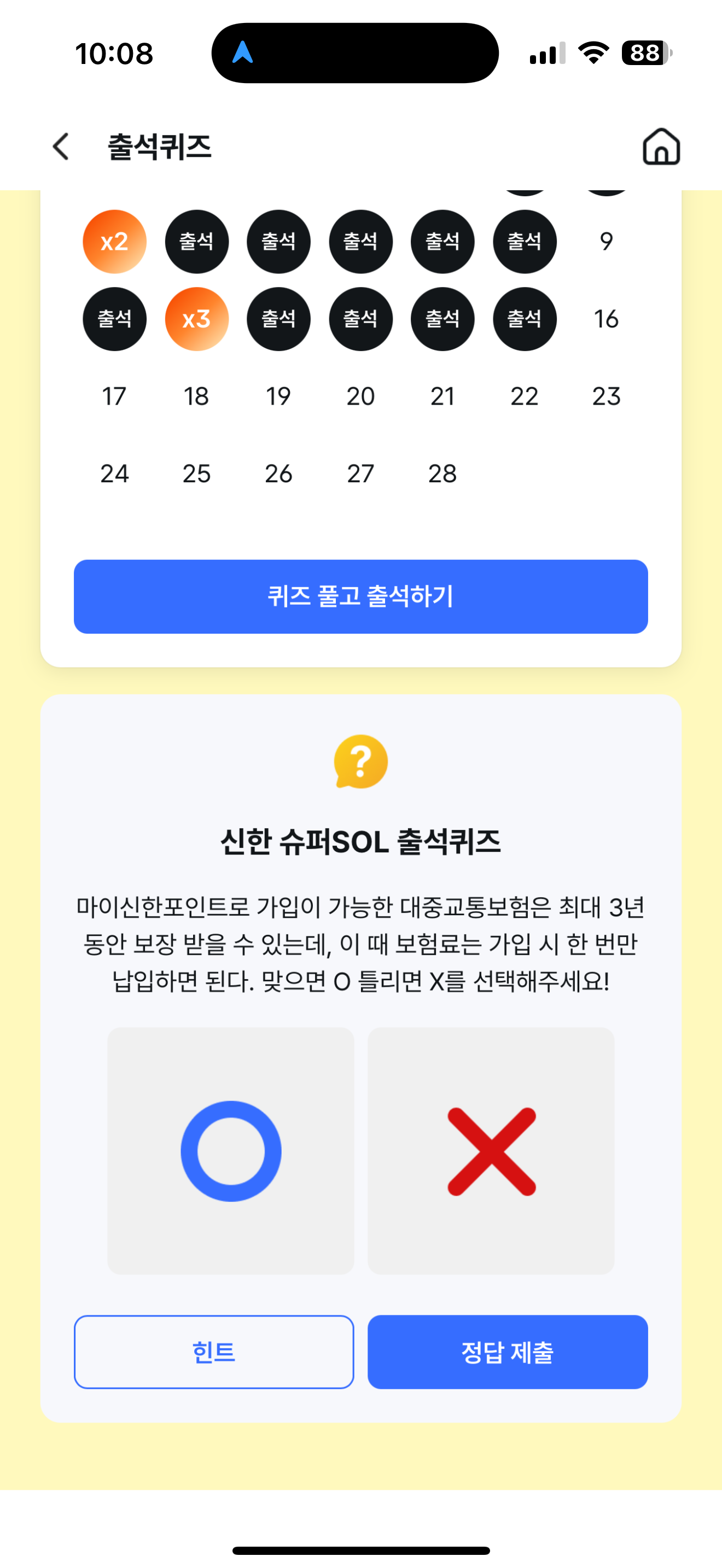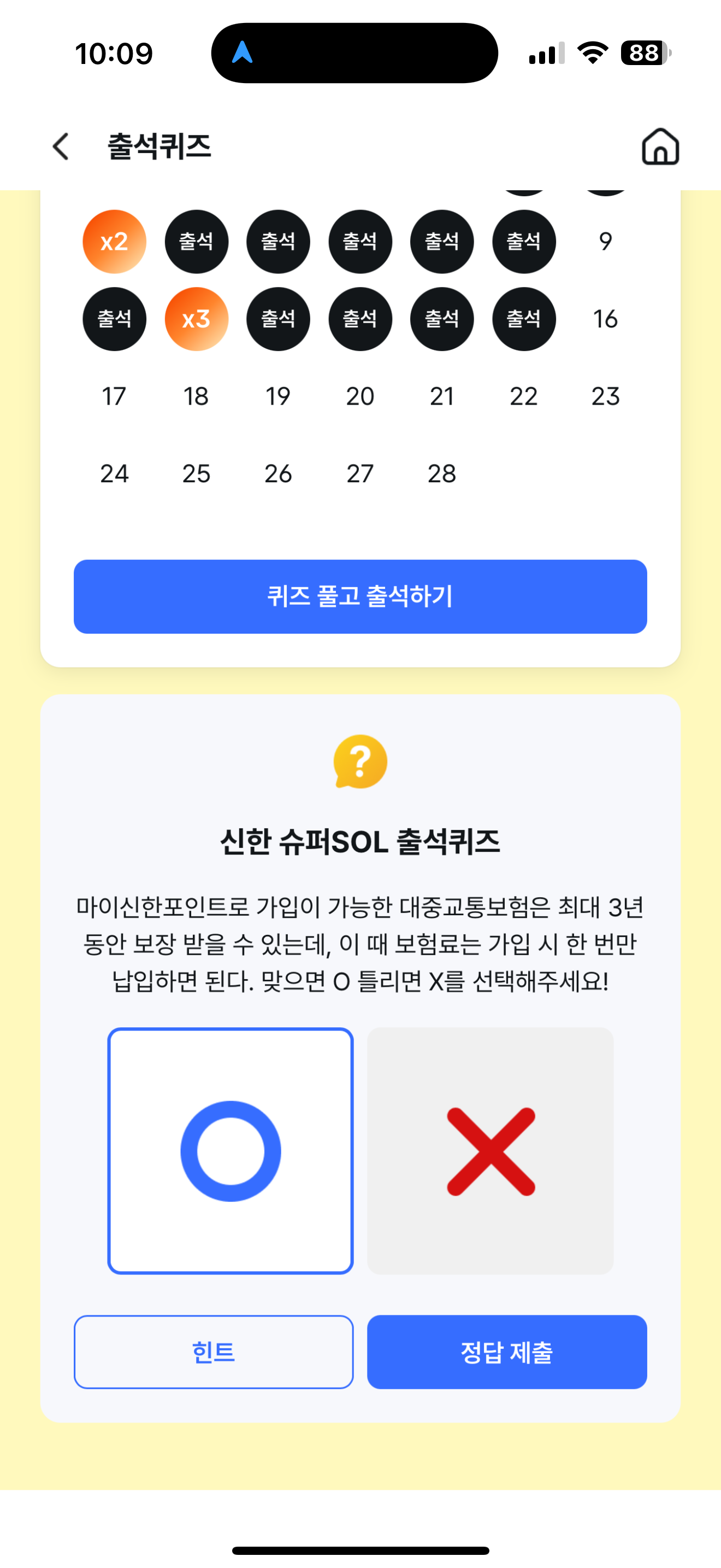신한 슈퍼SOL 출석퀴즈 정답은 O 입니다