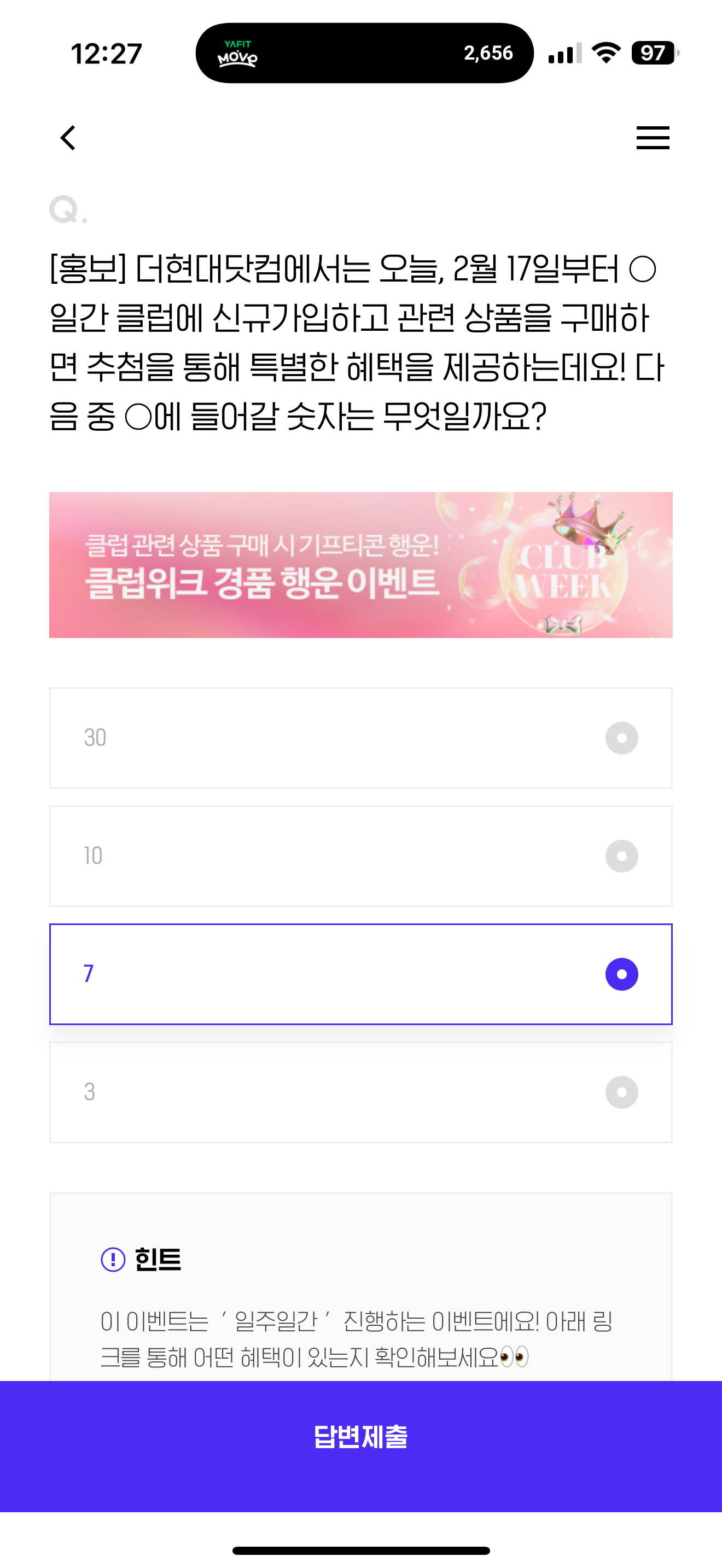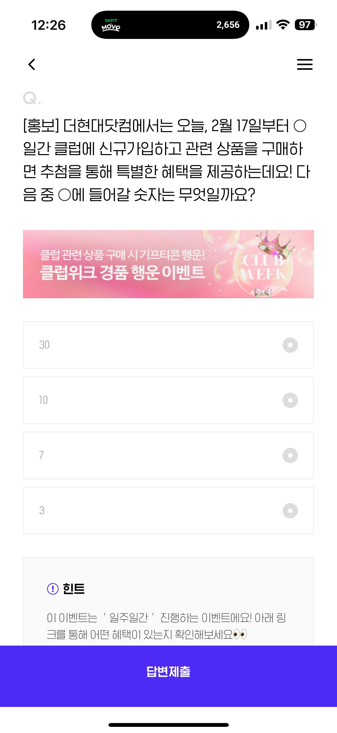 더현대닷컴에서는 오늘, 2월 17일부터 O일간 클럽에 신규가입하고 관련 상품을 구매하면 추첨을 통해 특별한 혜택을 제공하는데요! 다음 중 O에 들어갈 숫자는 무엇일까요? 보기는 1. 30 2. 10 3. 7 4. 3 입니다. 2월 17일부터 진행되는 이벤트입니다. 참고해서 혜택 받아 가세요