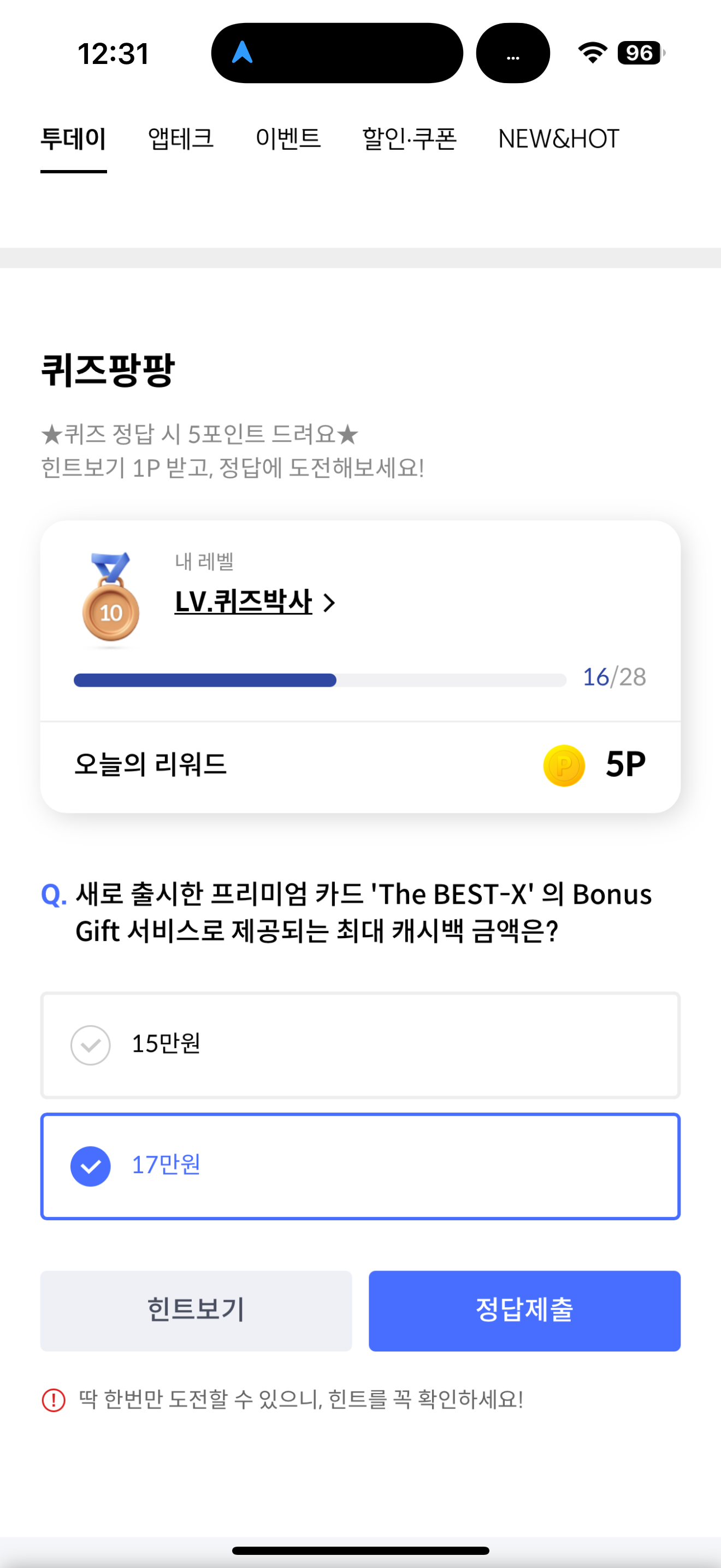 신한카드 퀴즈팡팡 정답은 17만원 입니다