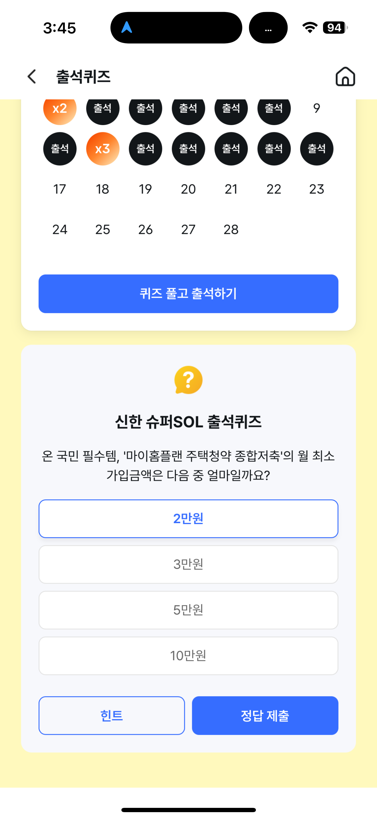 신한 슈퍼SOL 출석퀴즈 정답은 2만원 입니다