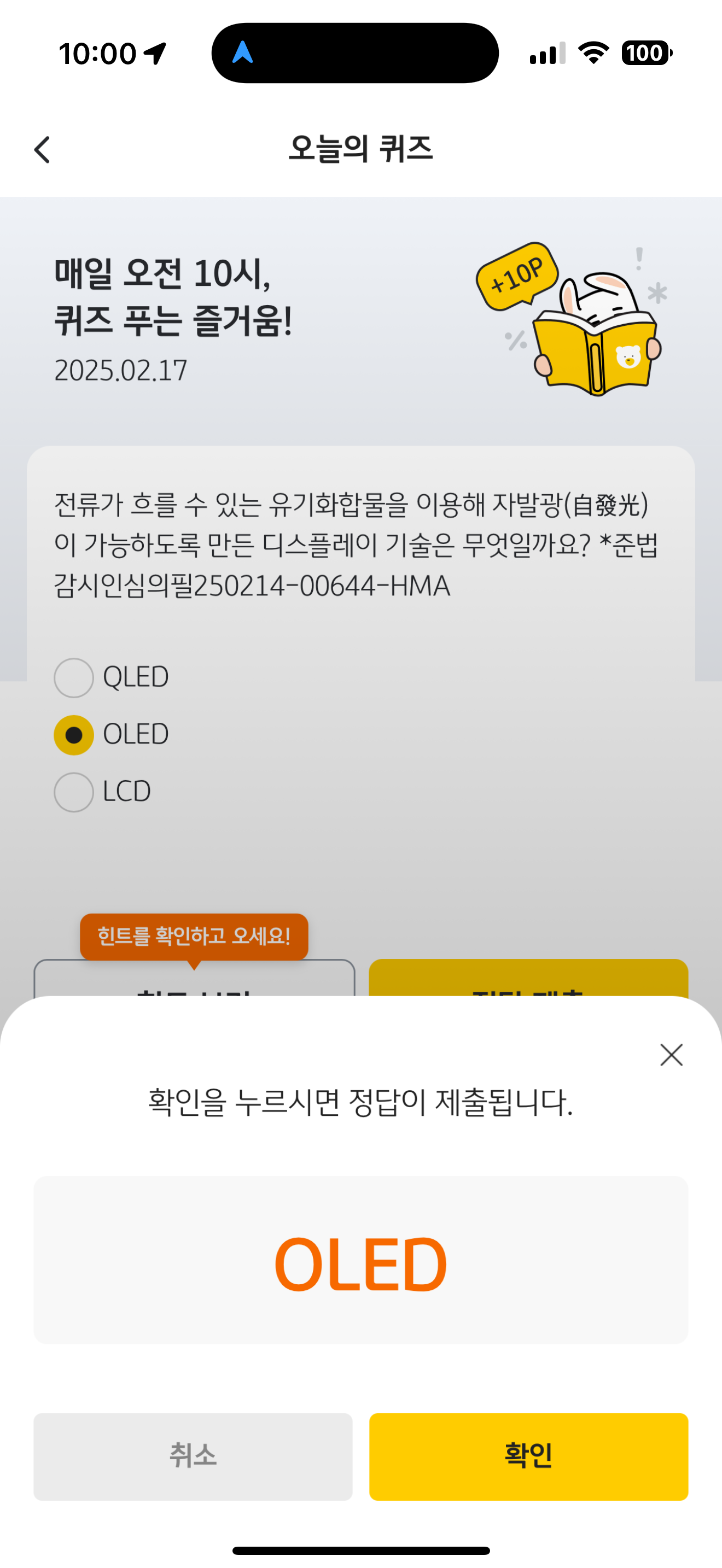 KB Pay 오늘의 퀴즈 정답은 OLED 입니다
