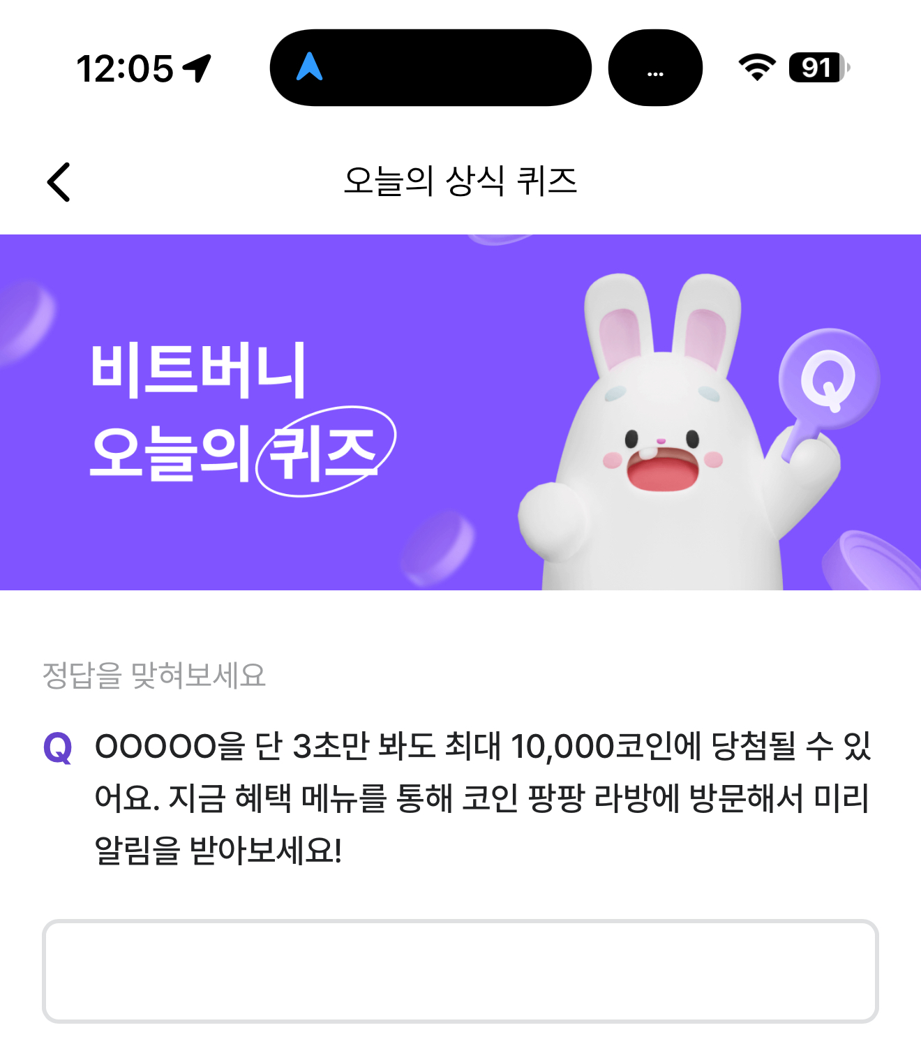 OOOOO을 단 3초만 봐도 최대 10,000코인에 당첨될 수 있어요. 지금 혜택 메뉴를 통해 코인 팡팡 라방에 방문해서 미리 알림을 받아보세요! 주관식 퀴즈인데요. 3초만 봐도 10,000코인을 최대로 받을 수 있다고 하는데요. 잘 참고해서 도전해 보세요