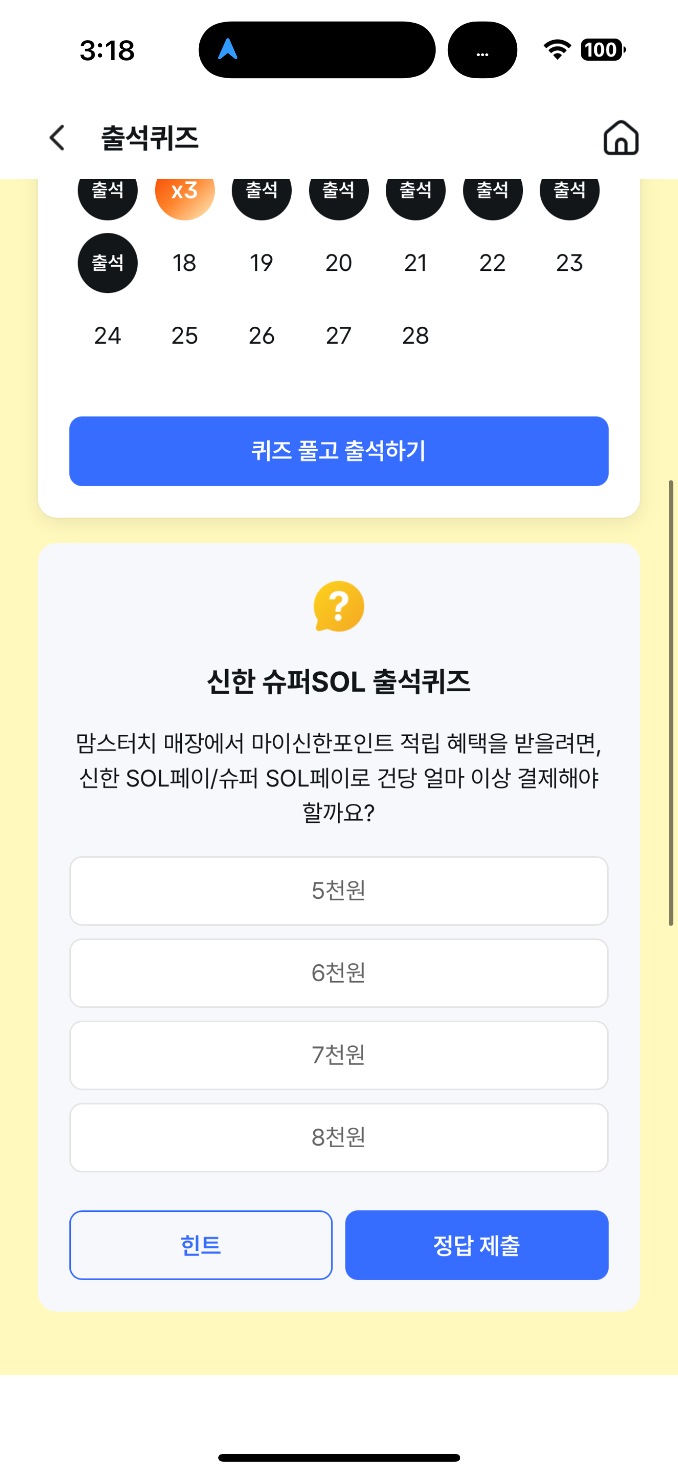신한 슈퍼SOL 출석퀴즈 정답은 6천원 입니다