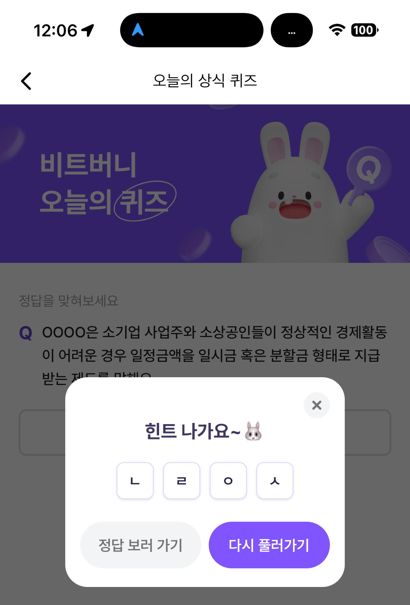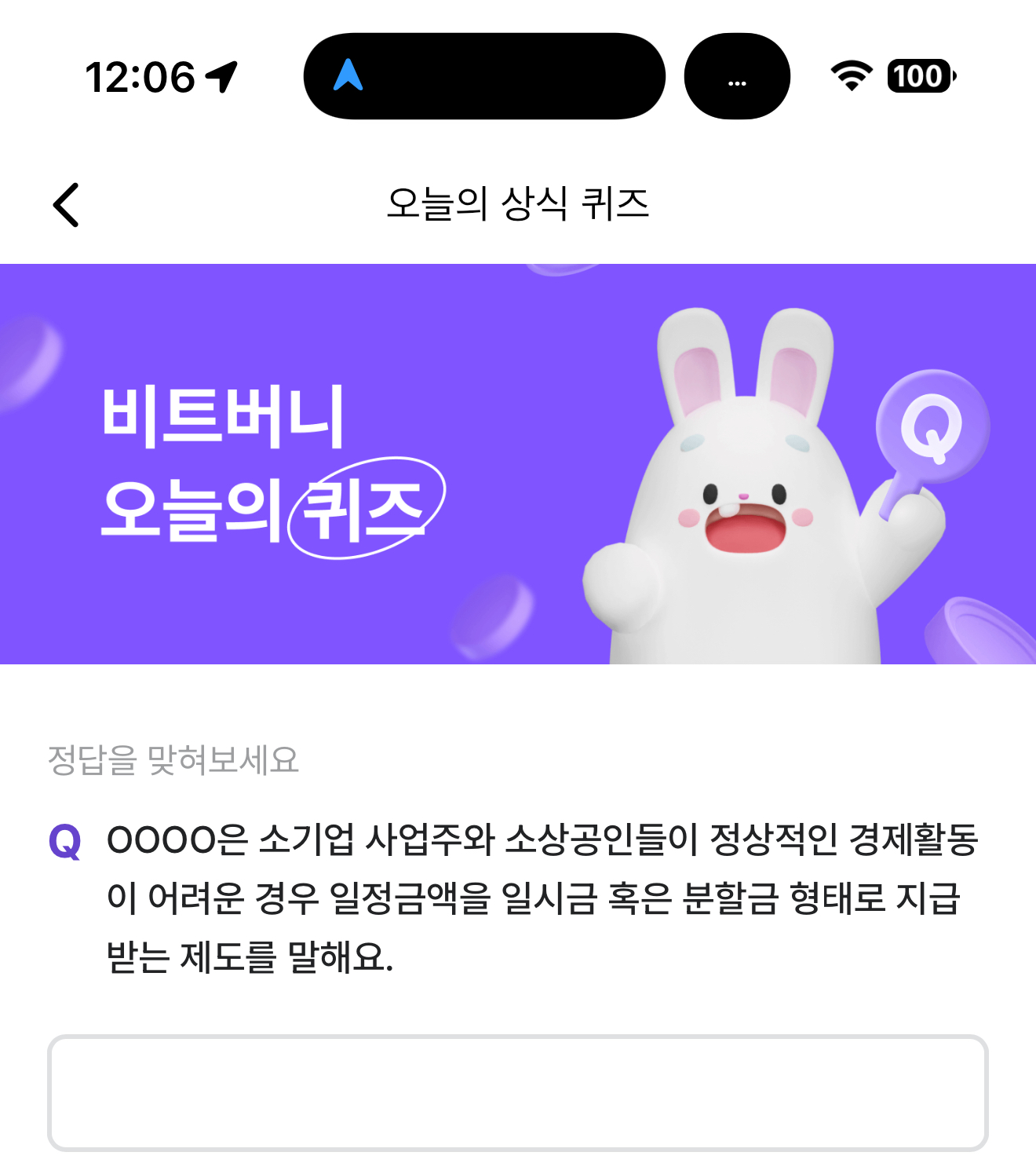 비트버니 오늘의 퀴즈 2월 19일 ㄴㄹㅇㅅ 정답(OOOO은 소기업 사업주와 소상공인들이 정상적인 경제활동이 어려운 경우 일정금액을 일시금 혹은 분할금 형태로 지급 받는 제도를 말해요)