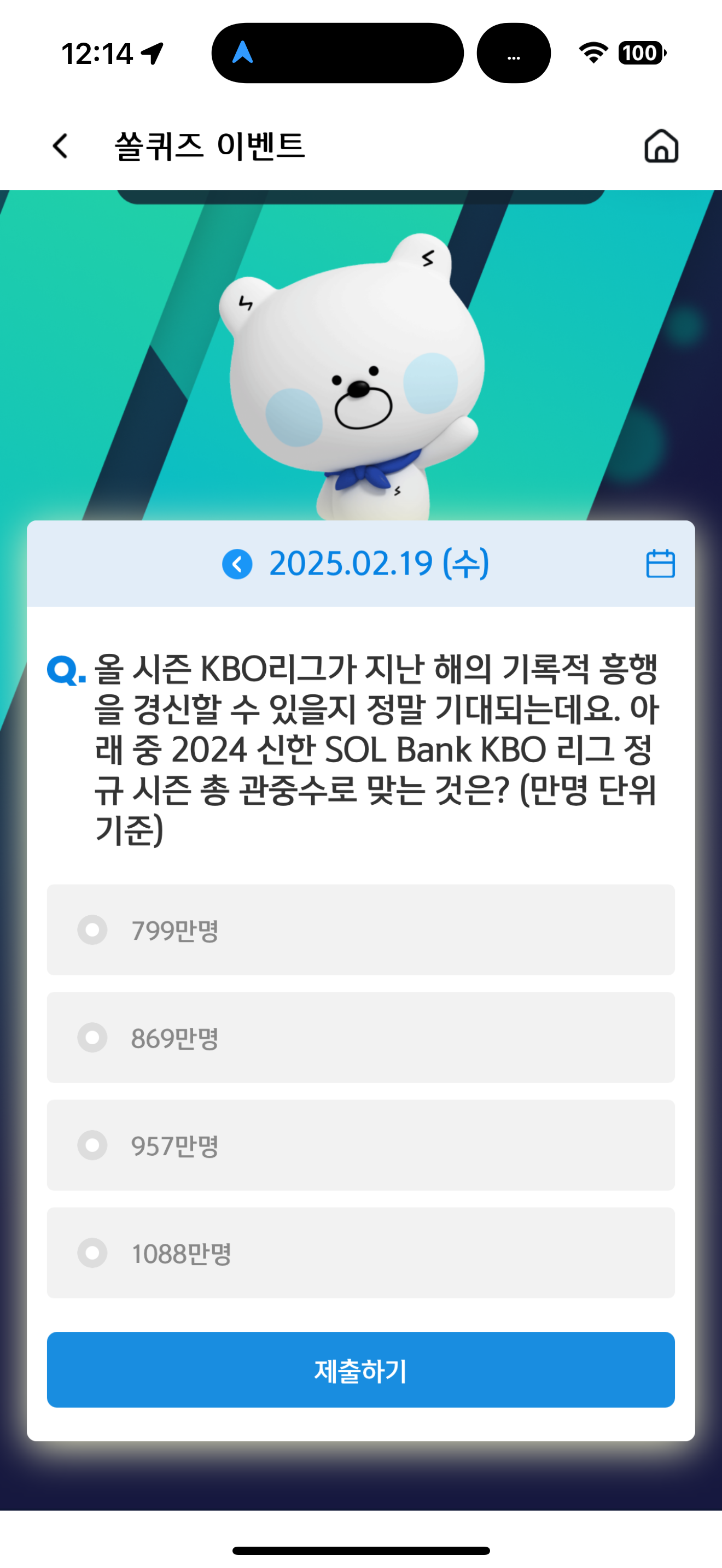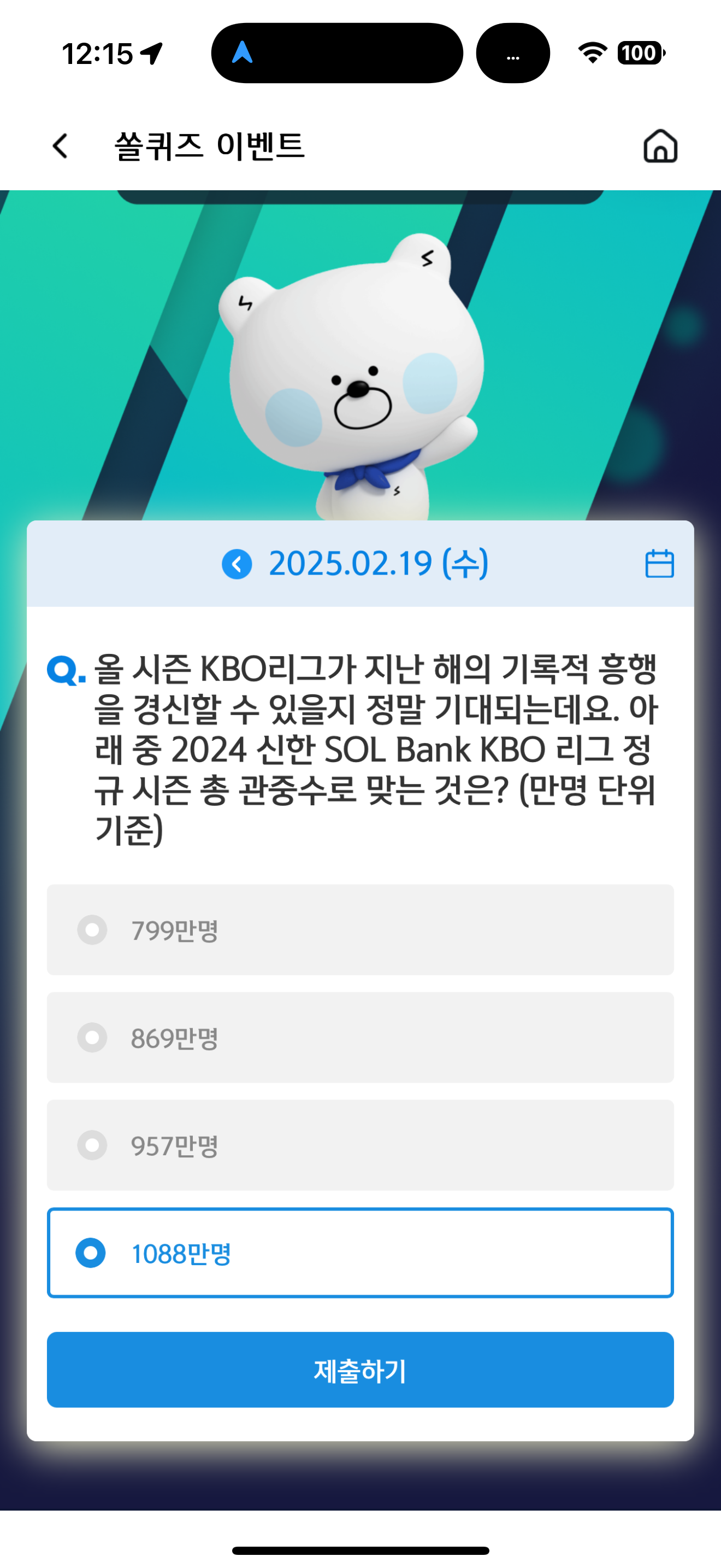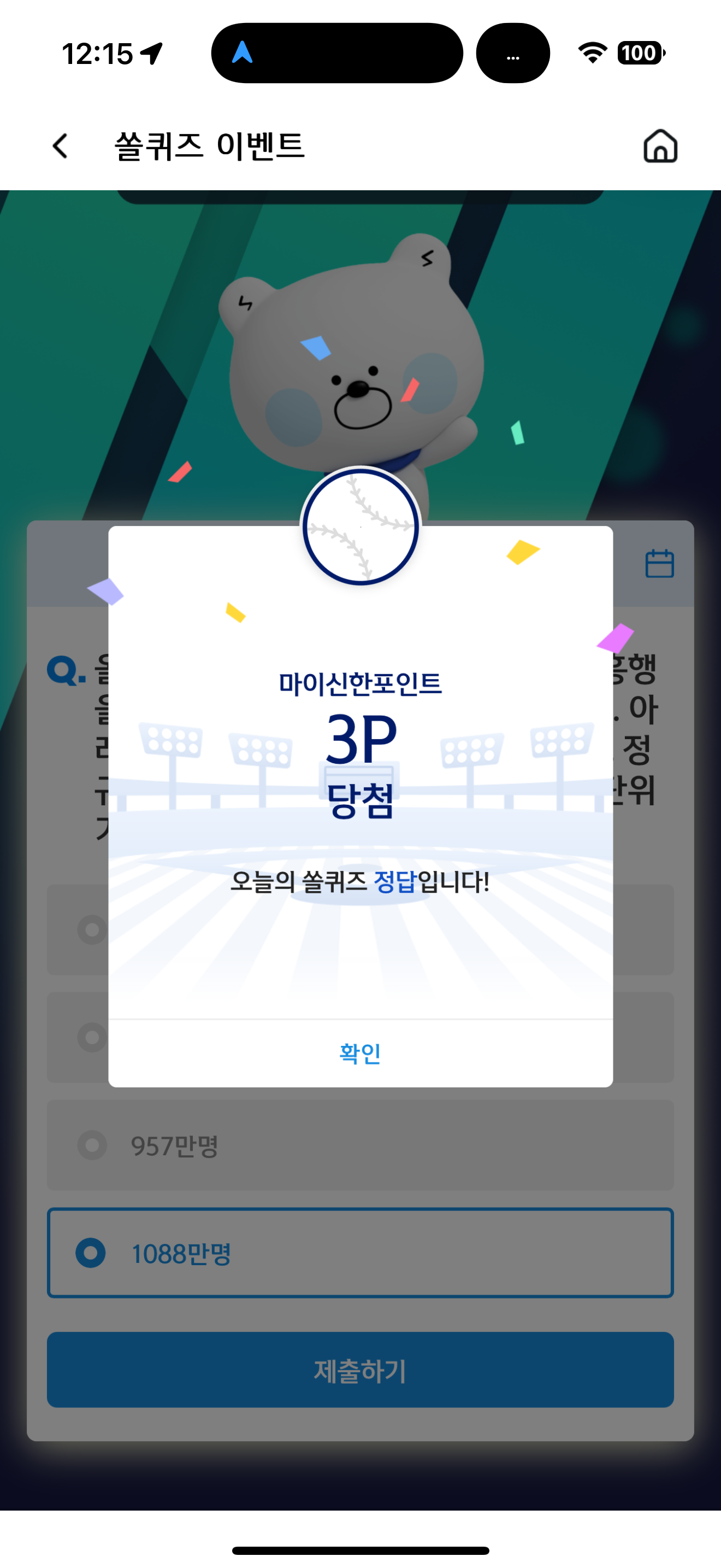 신한 슈퍼SOL 야구/상식 쏠퀴즈 정답은 1088만명 입니다