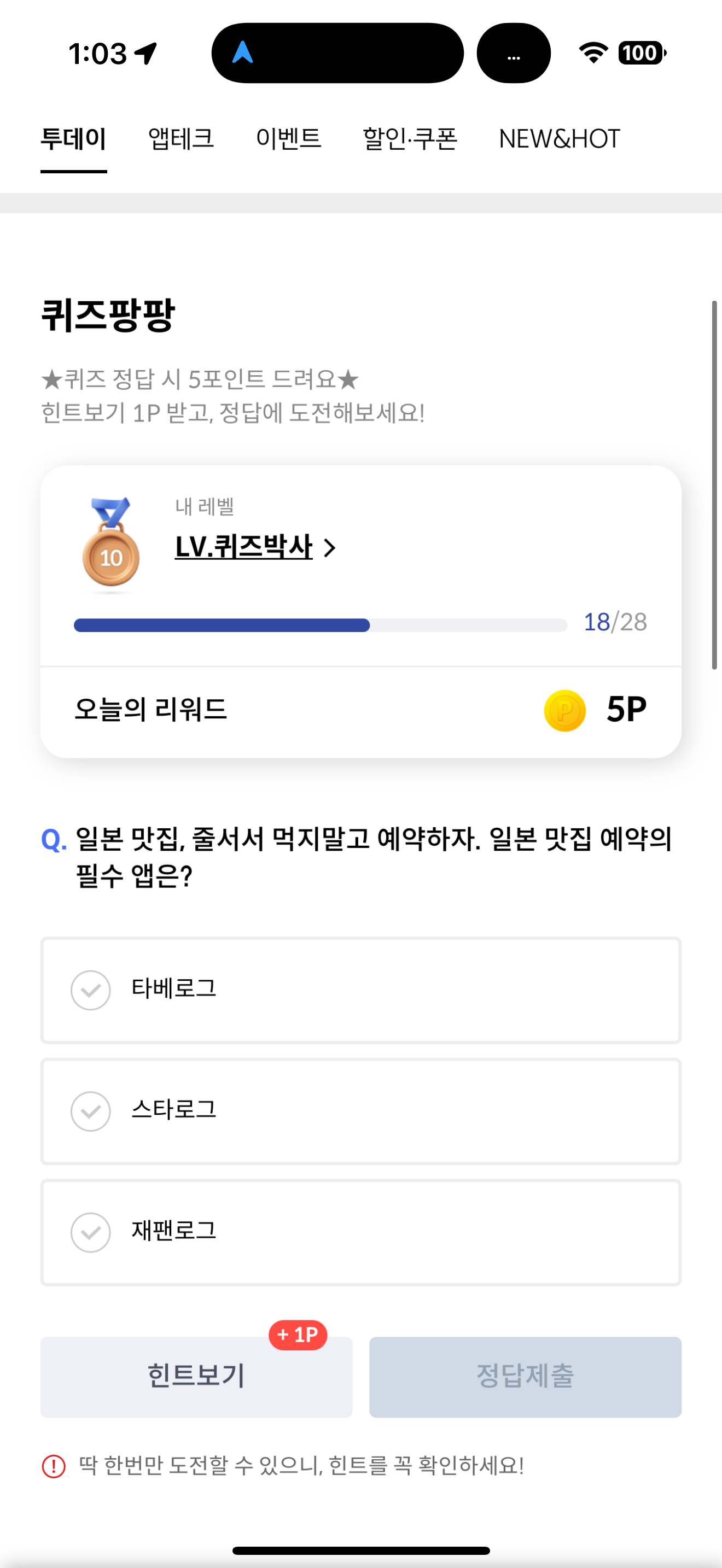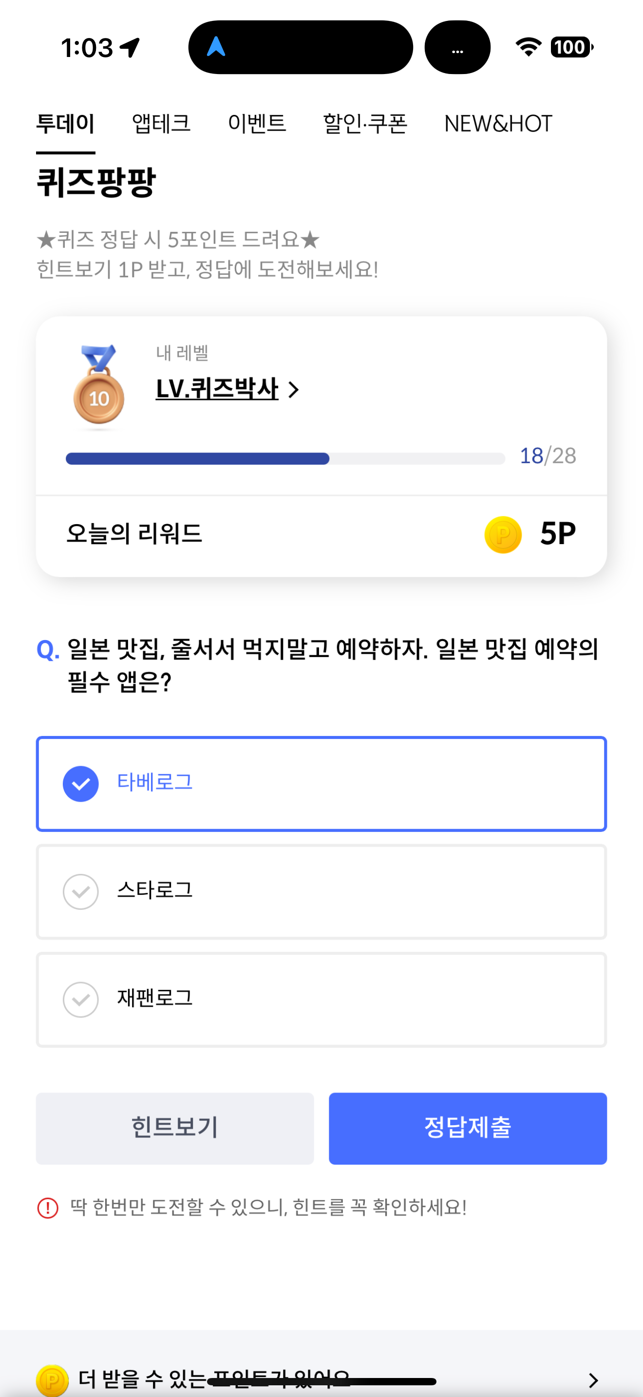 신한카드 퀴즈팡팡 정답은 타베로그 입니다