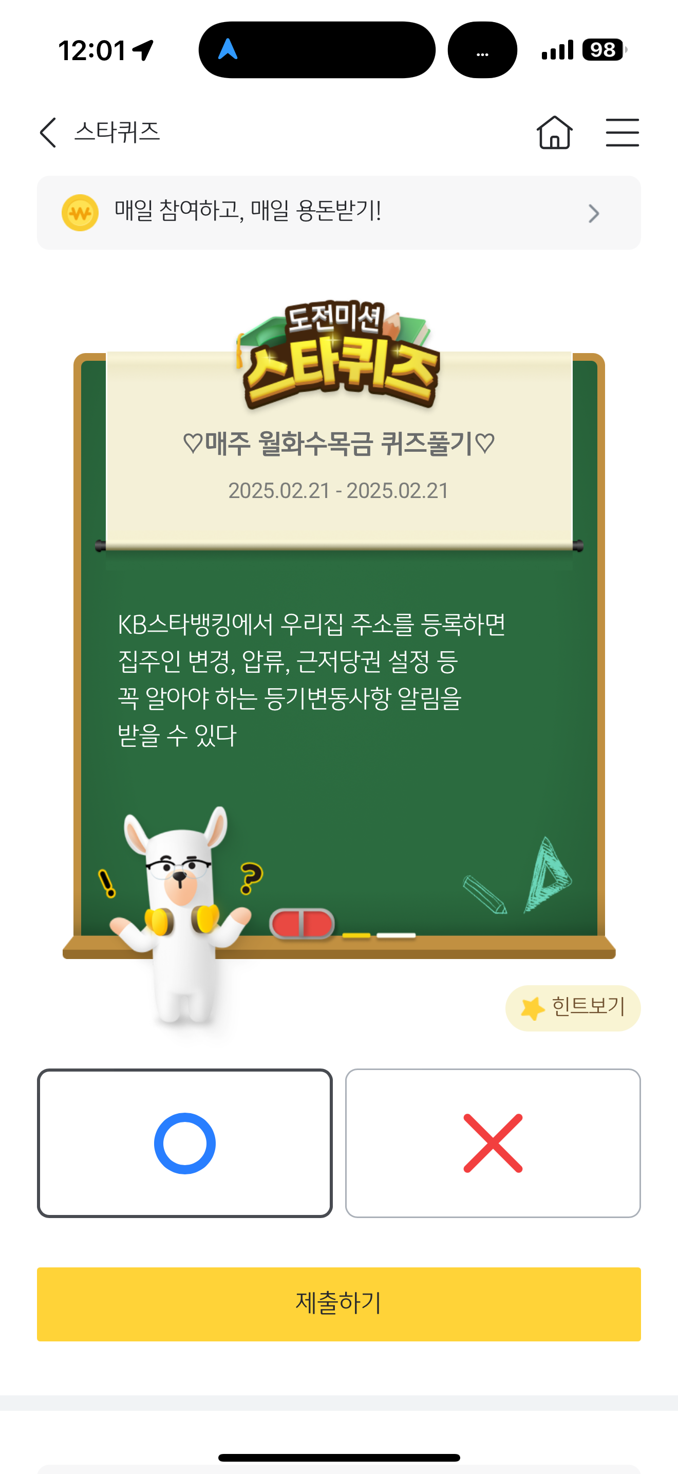 KB스타뱅킹에서 우리집 주소를 등록하면 집주인 변경, 압류, 근저당권 설정 등 꼭 알아야 하는 등기변동사항 알림을 받을 수 있다 O, X 퀴즈인데요. 전세 사기나 여러가지 문제가 발생하면서 이를 막을 다양한 제도들이 만들어지고 있는데요. 과연 KB스타뱅킹에서 이런 부분을 가능하게 도와줄까요?