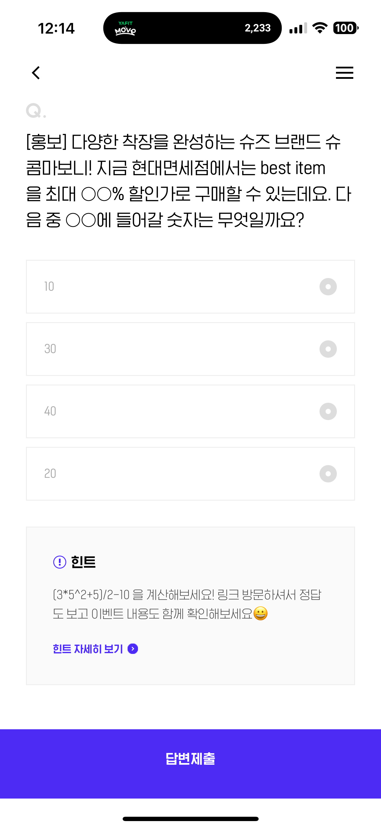 다양한 착장을 완성하는 슈즈 브랜드 슈콤마보니! 지금 현대면세점에서는 best item을 최대 OO% 할인가로 구매할 수 있는데요. 다음 중 OO에 들어갈 숫자는 무엇일까요? 보기는 1. 10 2. 30 3. 40 4. 20 입니다. 신발 구입을 고민중이신 분들은 할인 가격 참고해 보세요