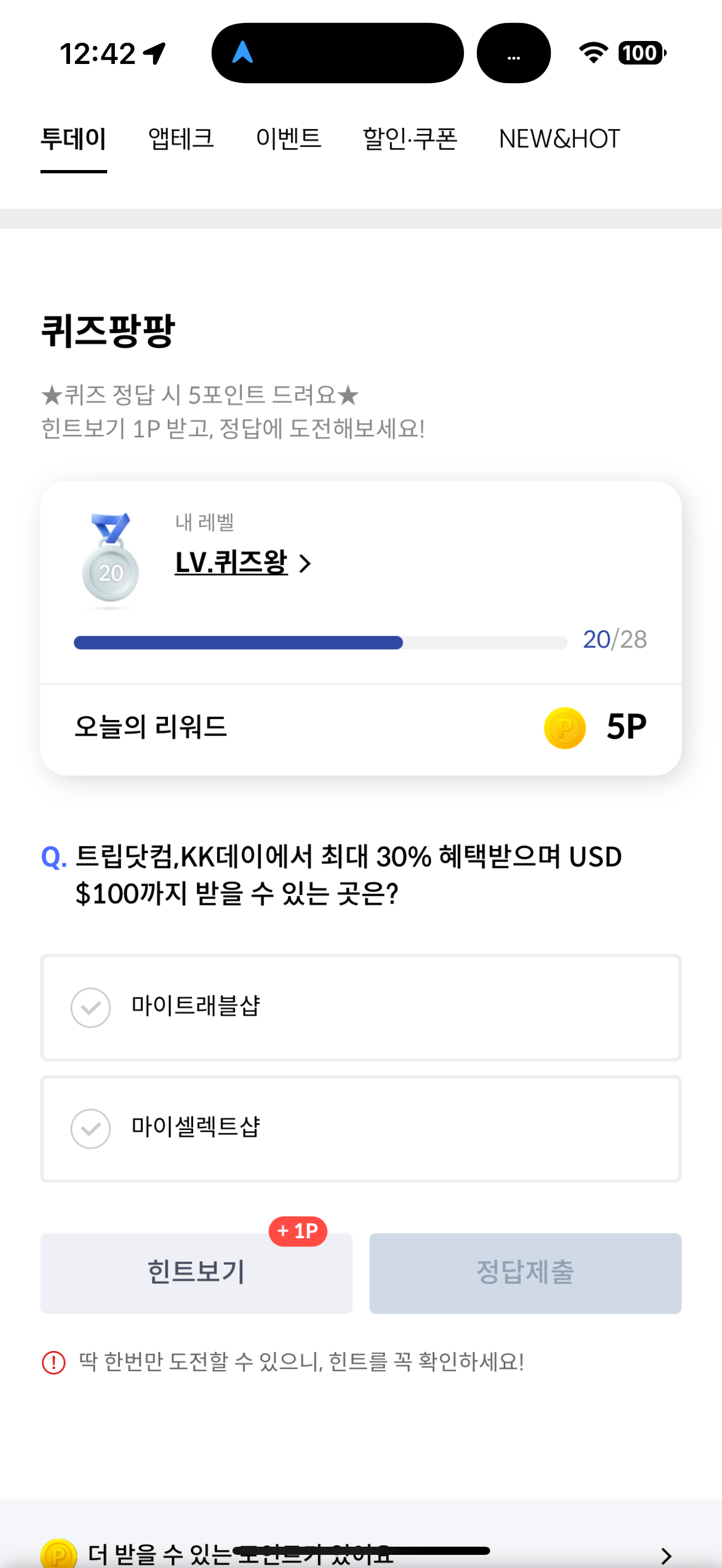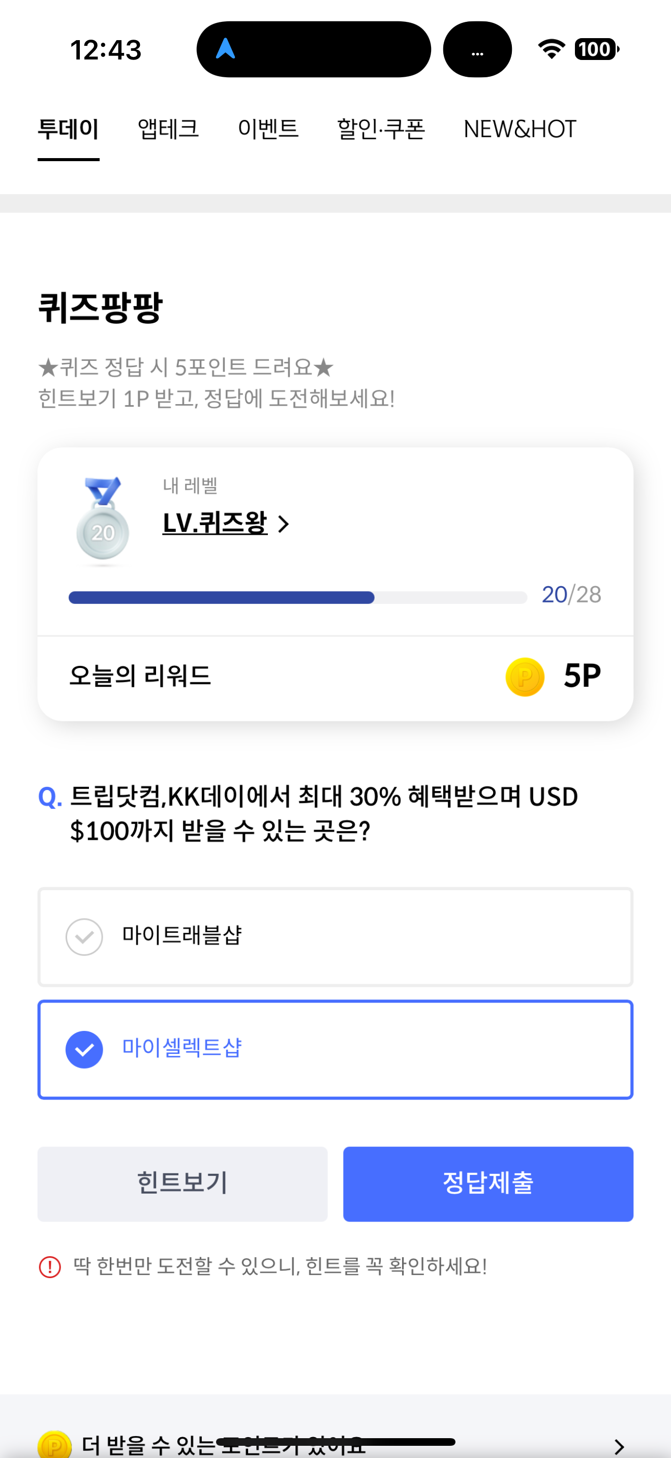 트립닷컴,KK데이에서 최대 30% 혜택받으며 USB$100까지 받을 수 있는 곳은? 보기는 1. 마이트래블샵 2. 마이셀렉트샵 입니다. 할인 혜택이 많이 주어지고 있으니 평상시 구매를 고려했던 분들은 참고해 보세요