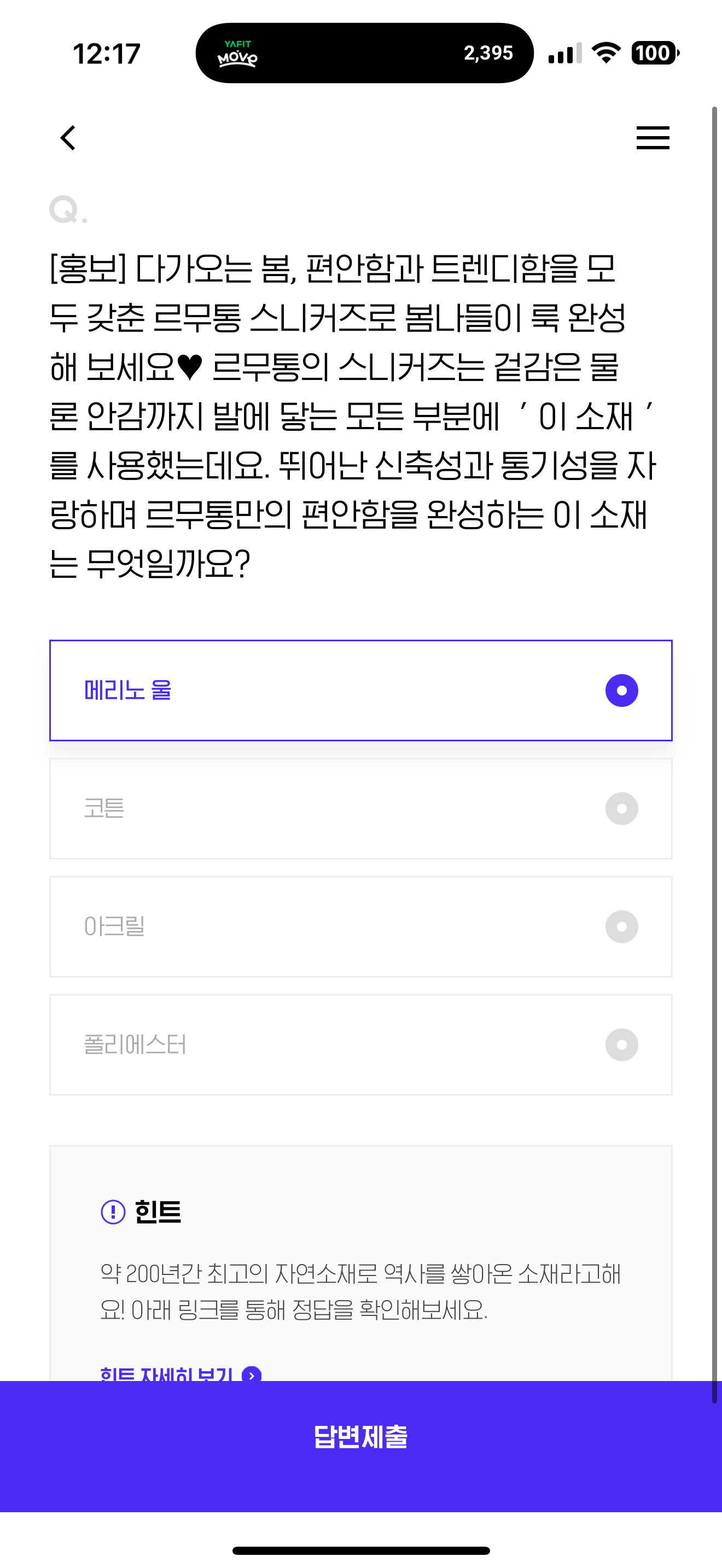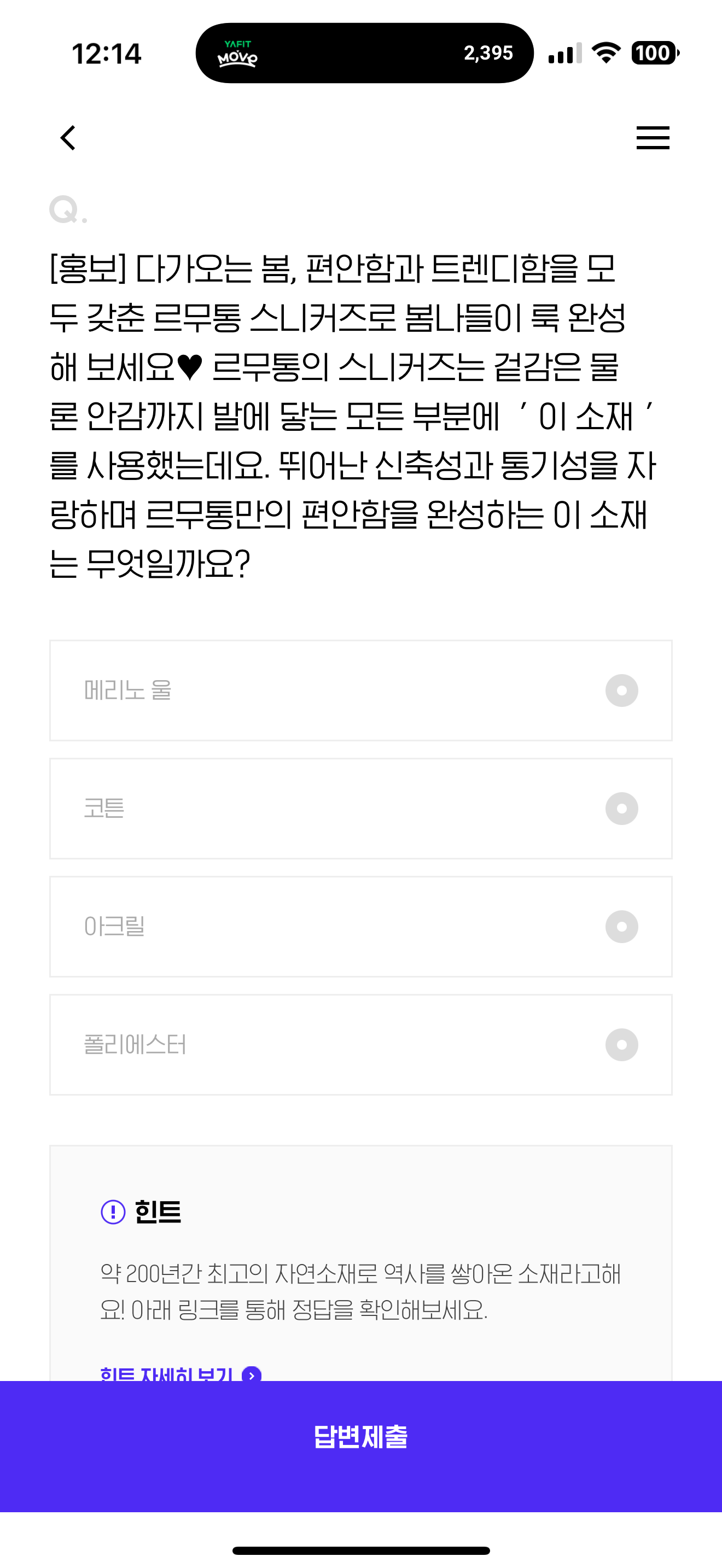 다가오는 봄, 편안함과 트렌디함을 모두 갖춘 르무통 스니커즈로 봄나들이 룩 완성해 보세요 르무통의 스니커즈는 겉감은 물론 안감까지 발에 닿는 모든 부분에 ' 이 소재 '를 사용했는데요. 뛰어난 신축성과 통기성을 자랑하며 르무통만의 편안함을 완성하는 이 소재는 무엇일까요? 보기는 1. 메리노 울 2. 코튼 3. 아크릴 4. 폴리에스터 입니다.