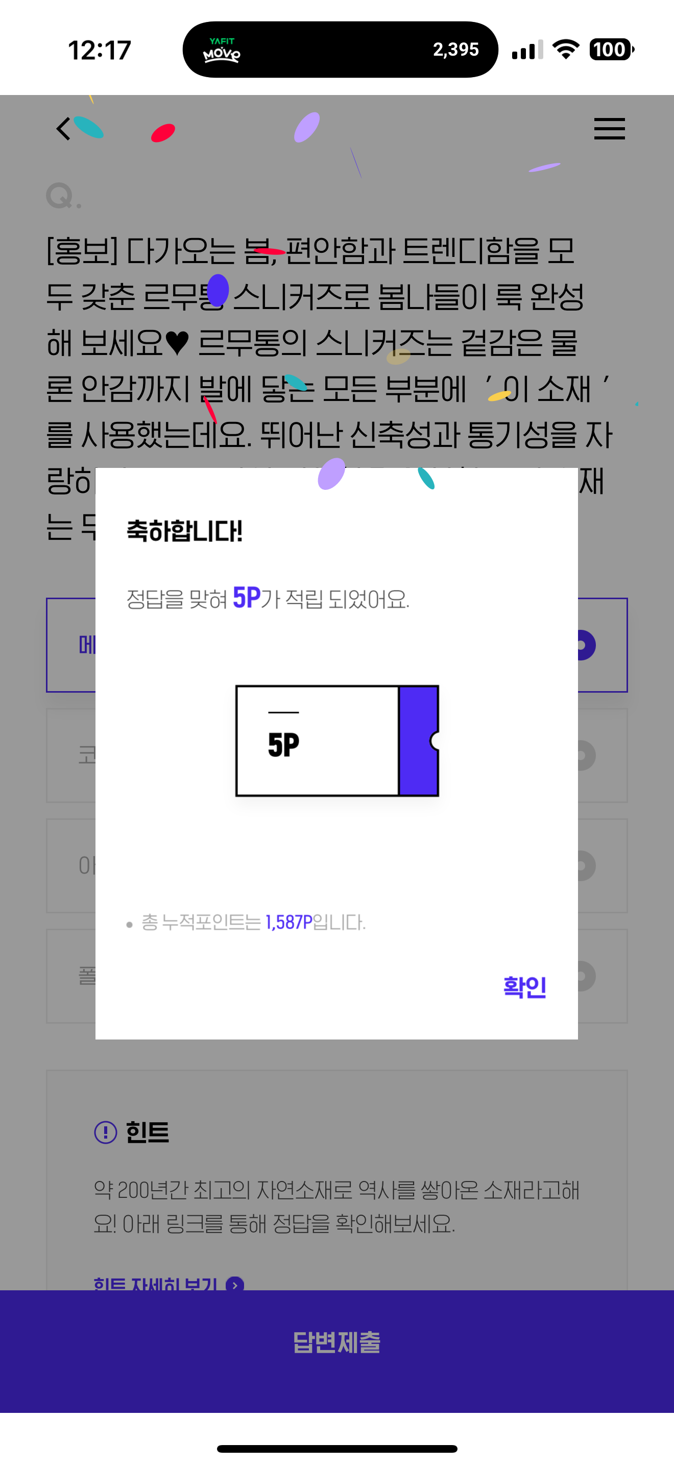 H포인트 퀴즈 2월 23일 정답(다가오는 봄, 편안함과 트렌디함을 모두 갖춘 르무통 스니커즈로 봄나들이 룩 완성해 보세요 르무통의 스니커즈는 겉감은 물론 안감까지 발에 닿는 모든 부분에 ' 이 소재 '를 사용했는데요. 뛰어난 신축성과 통기성을 자랑하며 르무통만의 편안함을 완성하는 이 소재는 무엇일까요?)