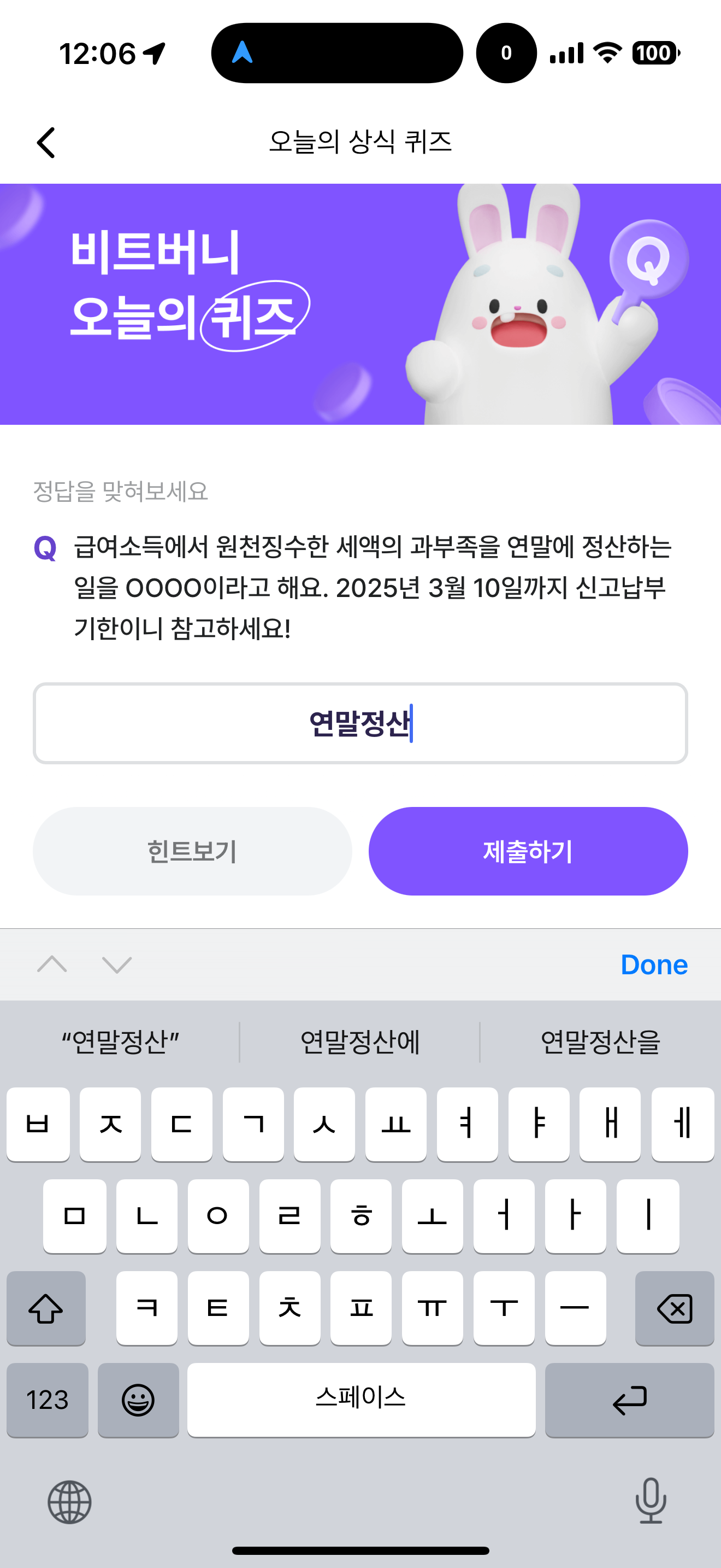 비트버니 오늘의 퀴즈 2월 24일 ㅇㅁㅈㅅ 정답(급여소득에서 원천징수한 세액의 과부족을 연말에 정산하는 일을 OOOO이라고 해요. 2025년 3월 10일까지 신고납부 기한이니 참고하세요!)