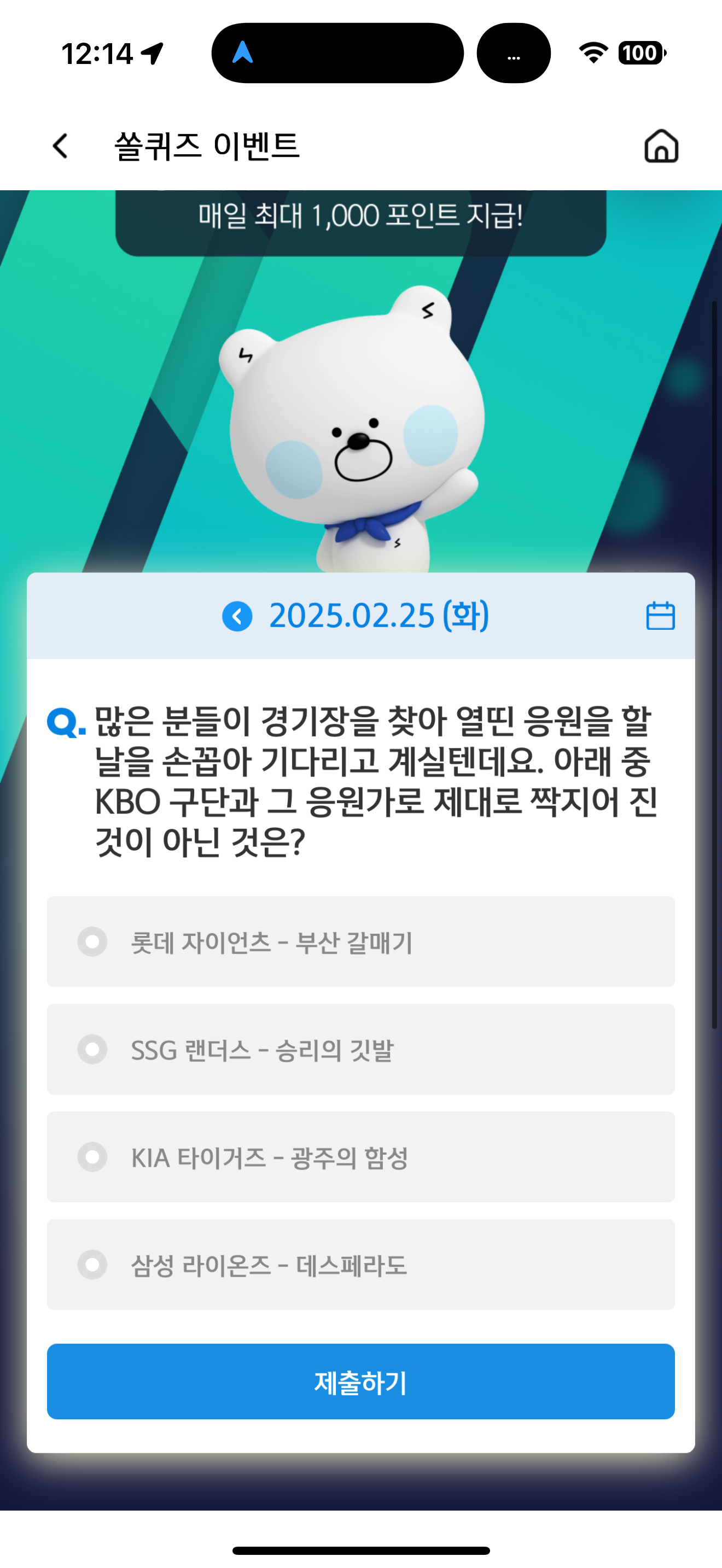 신한 슈퍼SOL 야구/상식 쏠퀴즈 정답은 삼성 라이온즈 - 데스페라도 입니다