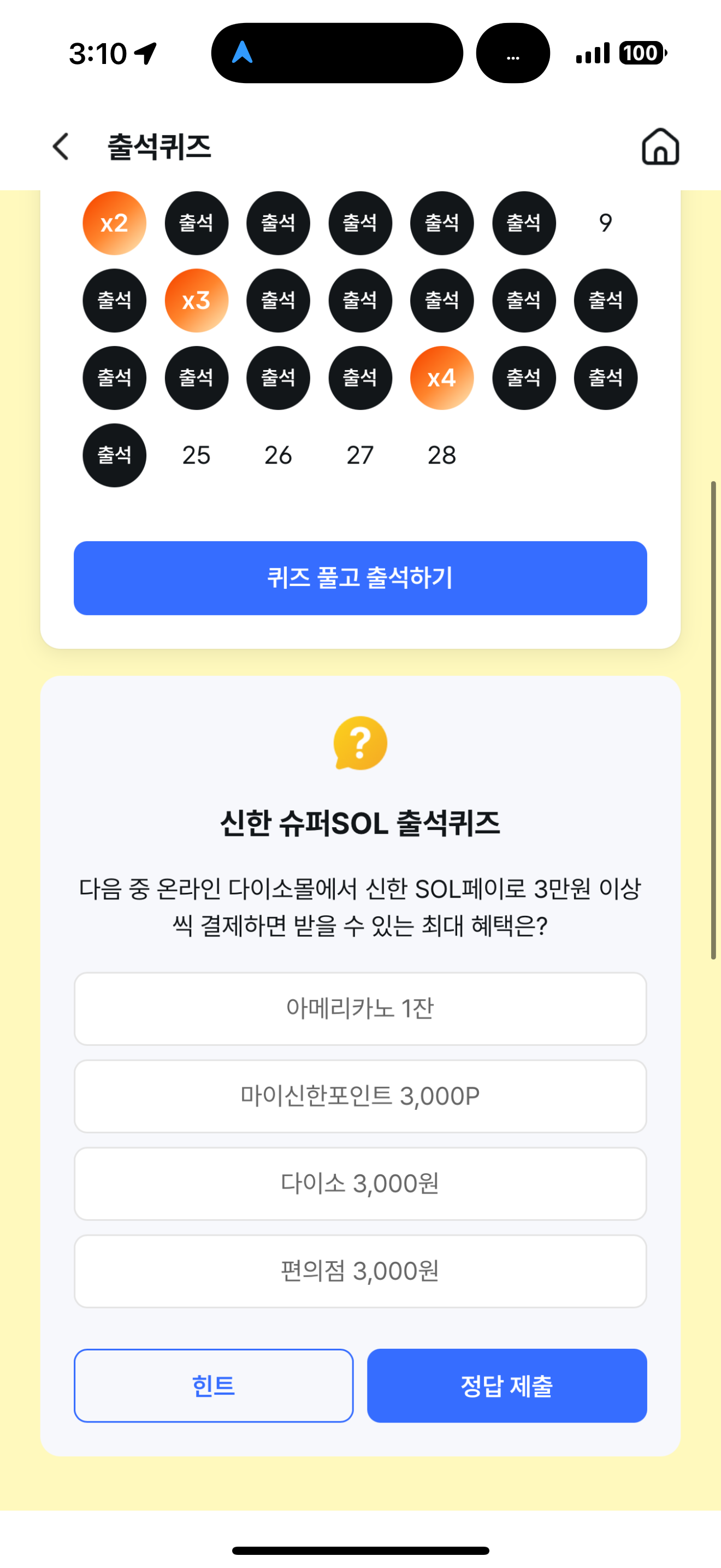 신한 슈퍼SOL 출석퀴즈 정답은 마이신한포인트 3,000P 입니다