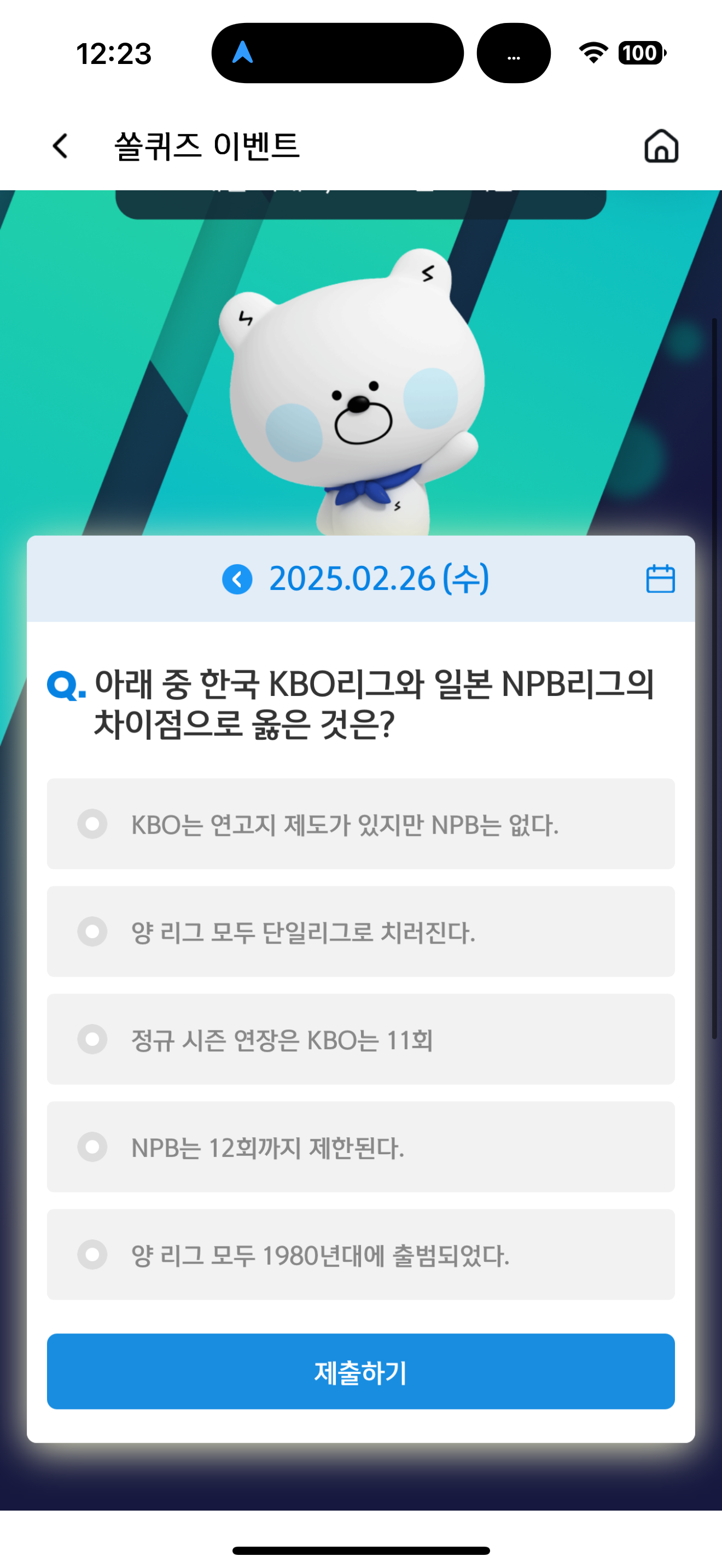 신한 슈퍼SOL 야구/상식 쏠퀴즈 정답은 현재 오류가 있는 것으로 보입니다. 현재 맞는 내용하면 2가지가 잇습니다. 정규 시즌 연장은 KBO는 11회와 NPB는 12회까지 제한된다 입니다. 그런데 다 오답이라고 나옵니다. 즉, 정답을 잡아내는 오류가 생긴 것으로 보이니 지금은 체크를 하지 마시고 기다리시기 바랍니다.