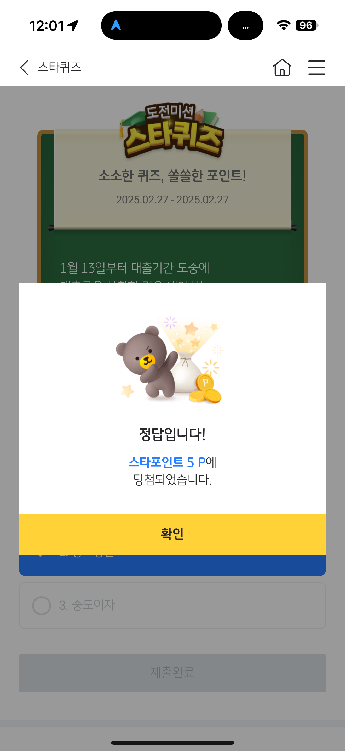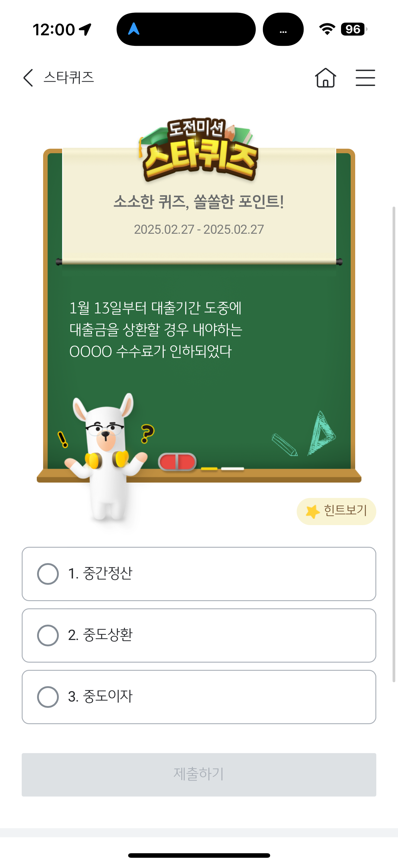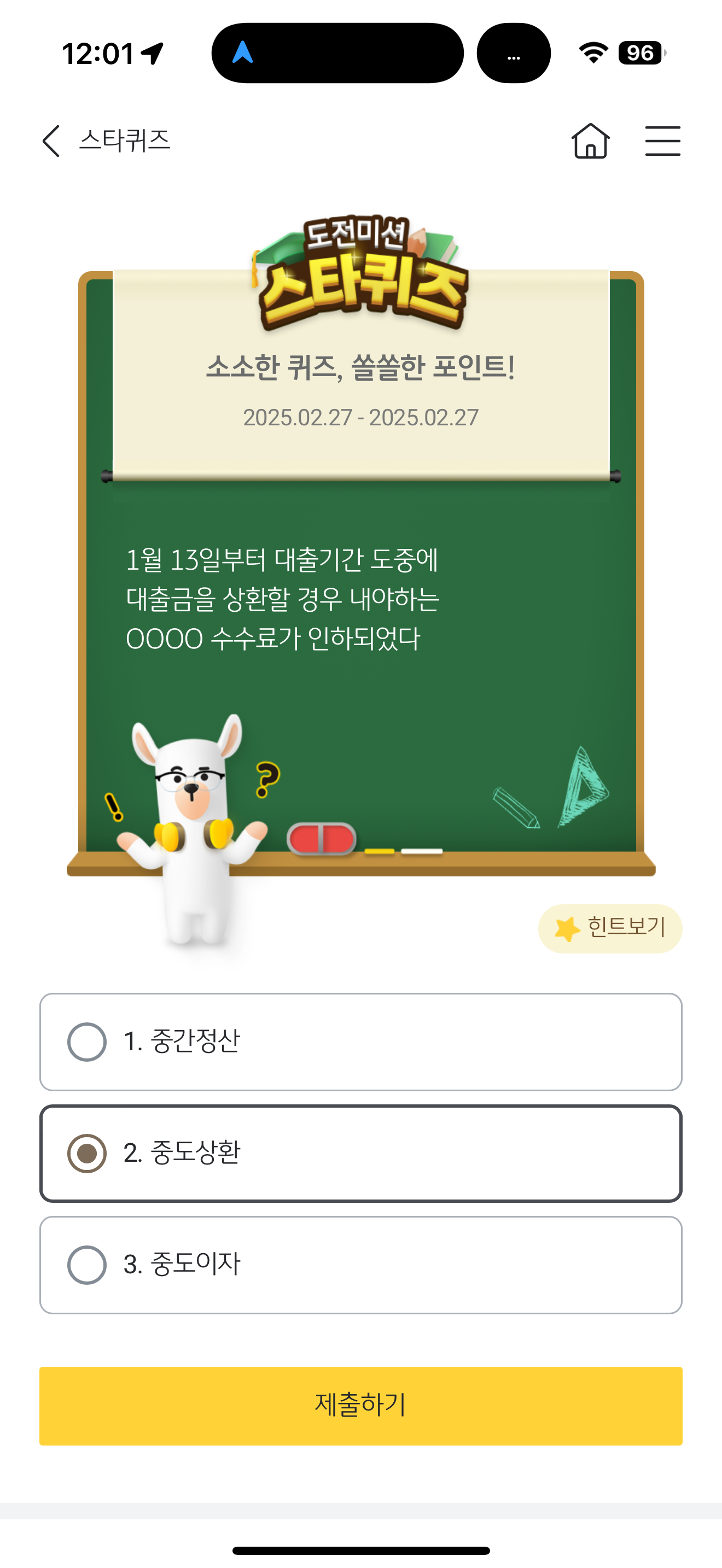 KB스타뱅킹 스타퀴즈 정답은 2. 중도상환 입니다