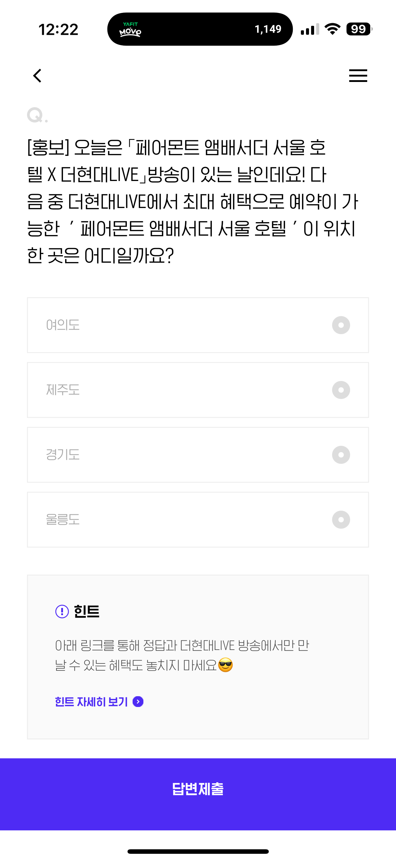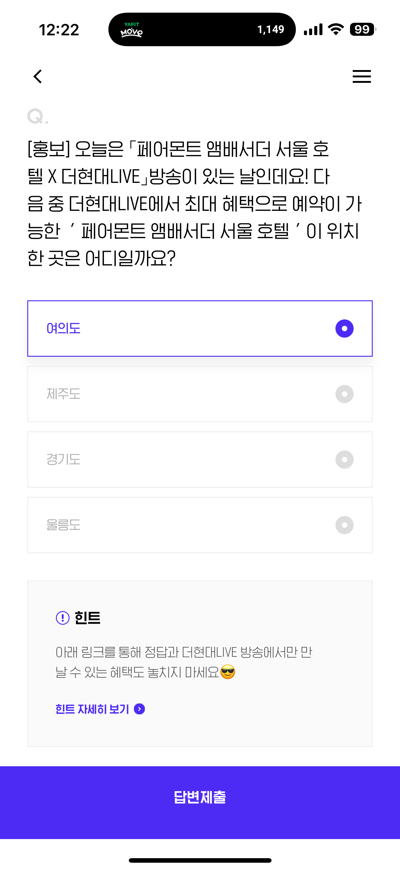 오늘은 페어몬트 앰배서더 서울 호텔 X 더현대LIVE 방송이 있는 날인데요! 다음 중 더현대LIVE에서 최대 혜택으로 예약이 가능한 ' 페어몬트 앰배서더 서울 호텔 ' 이 위치한 곳은 어디일까요? 보기는 1. 여의도 2. 제주도 3. 경기도 4. 울릉도 입니다. 서울이니 딱 한군데죠