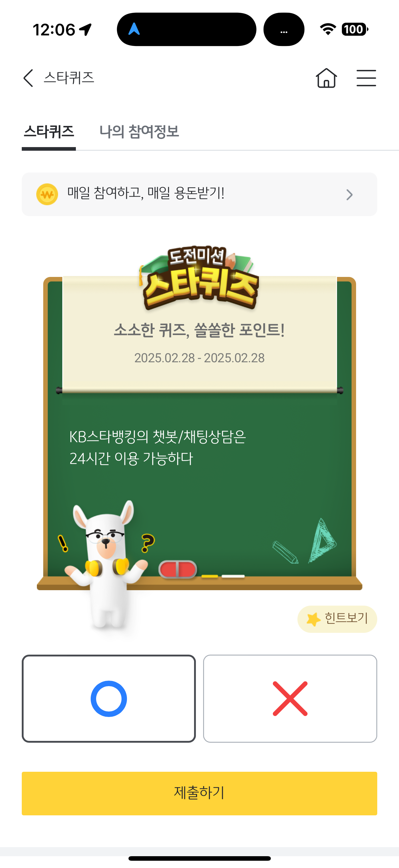 KB스타뱅킹 스타퀴즈 2월 28일 정답(KB스타뱅킹의 챗봇/채팅상담은 24시간 이용 가능하다)