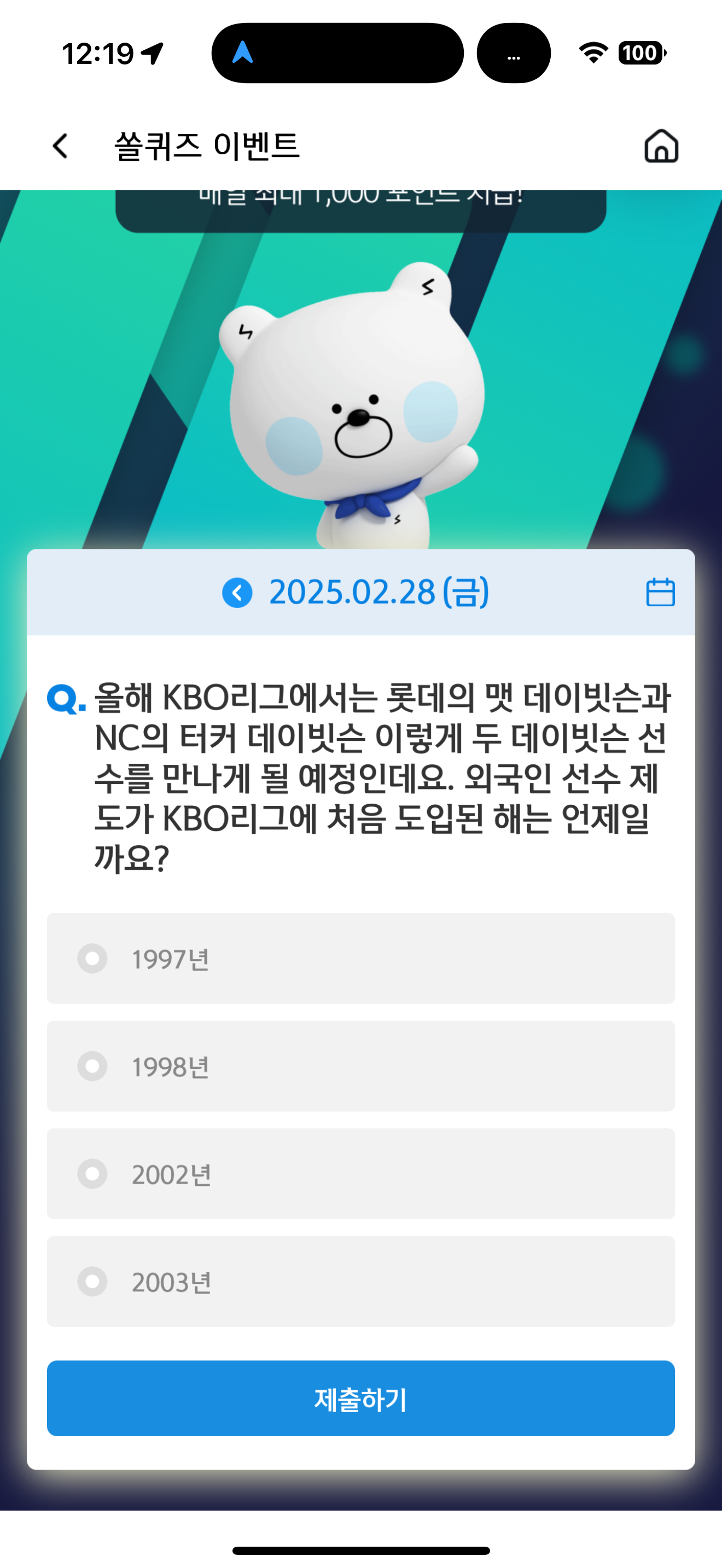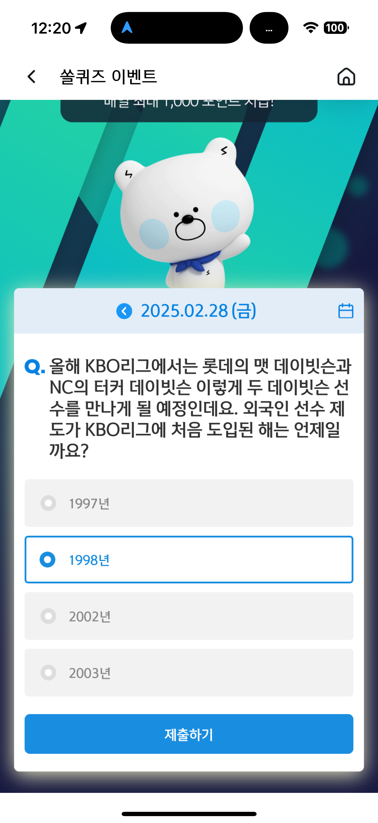 신한 슈퍼SOL 야구/상식 쏠퀴즈 정답은 1998년 입니다