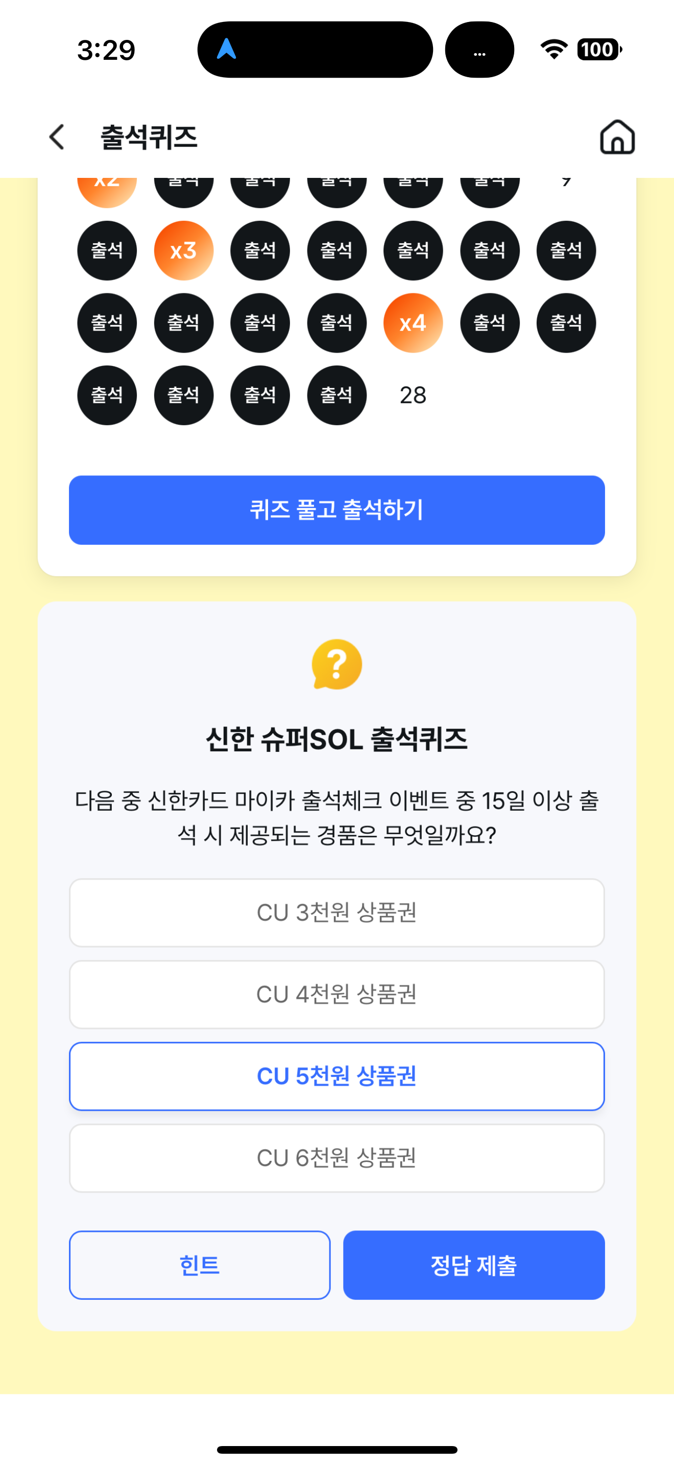 다음 중 신한카드 마이카 출석체크 이벤트 중 15일 이상 출석 시 제공되는 경품은 무엇일까요? 보기는 1. CU 3천원 상품권 2. CU 4천원 상품권 3. CU 5천원 상품권 4. CU 6천원 상품권 입니다. 상품권이 경품으로 걸려 있으니 도전해 보세요