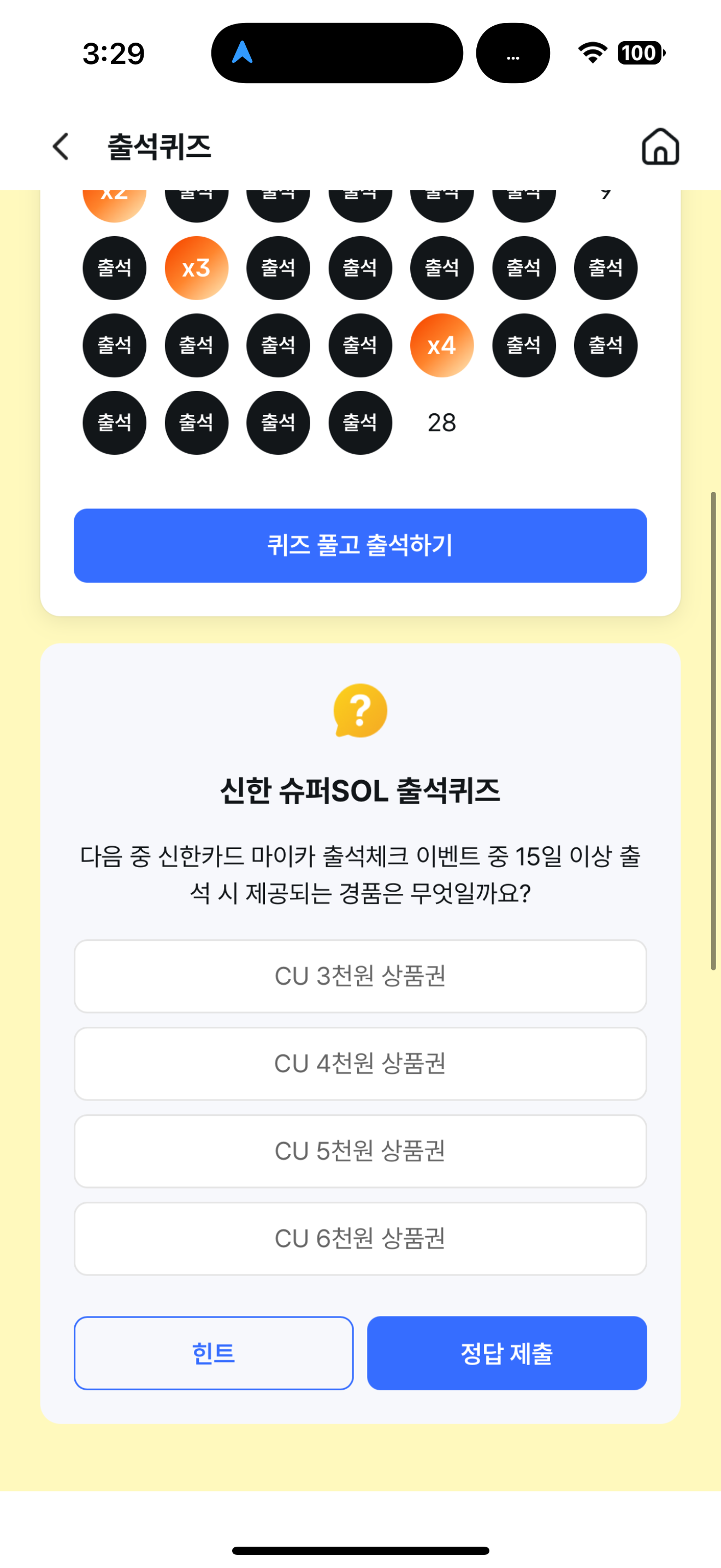 다음 중 신한카드 마이카 출석체크 이벤트 중 15일 이상 출석 시 제공되는 경품은 무엇일까요? 보기는 1. CU 3천원 상품권 2. CU 4천원 상품권 3. CU 5천원 상품권 4. CU 6천원 상품권 입니다. 상품권이 경품으로 걸려 있으니 도전해 보세요