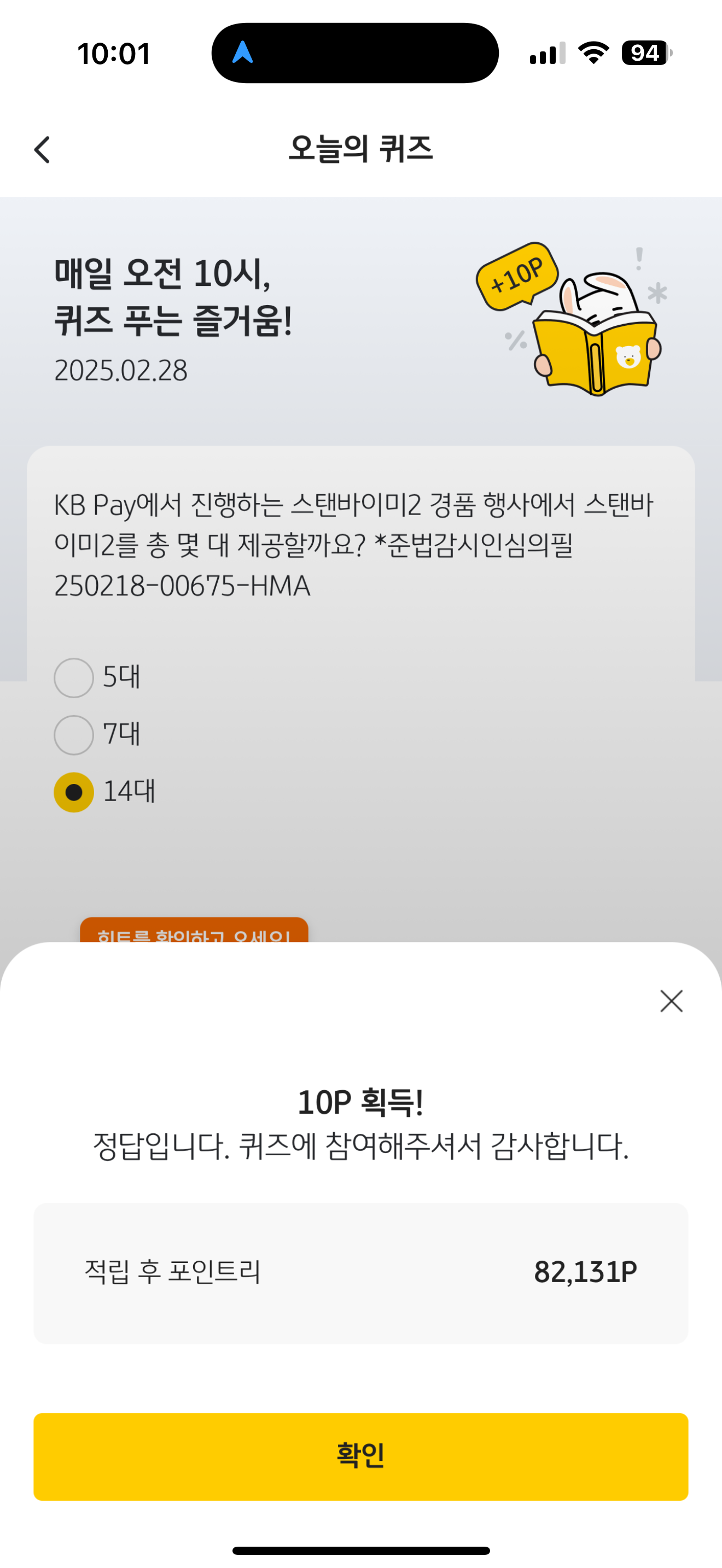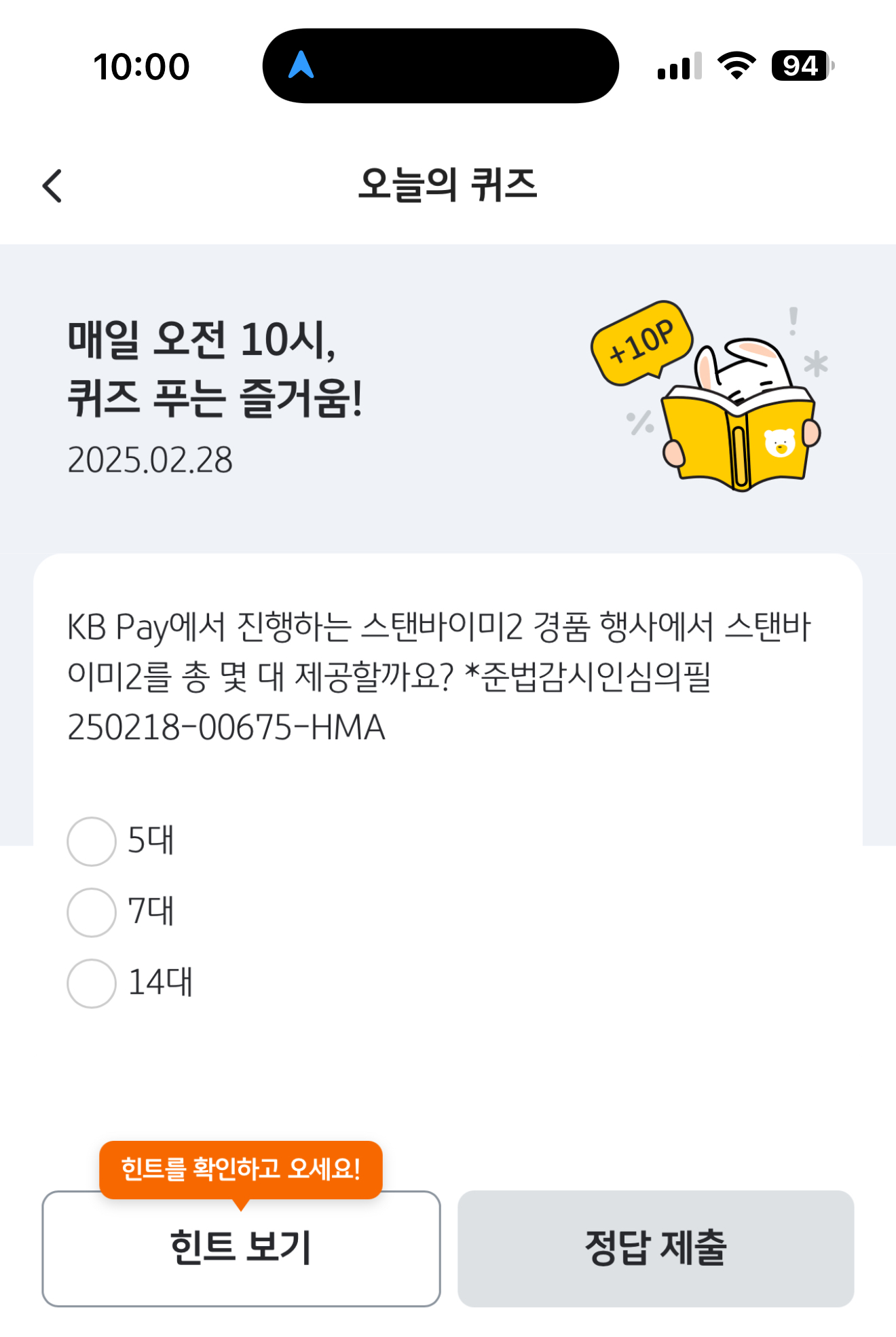 KB Pay 오늘의 퀴즈 2월 28일 문제입니다