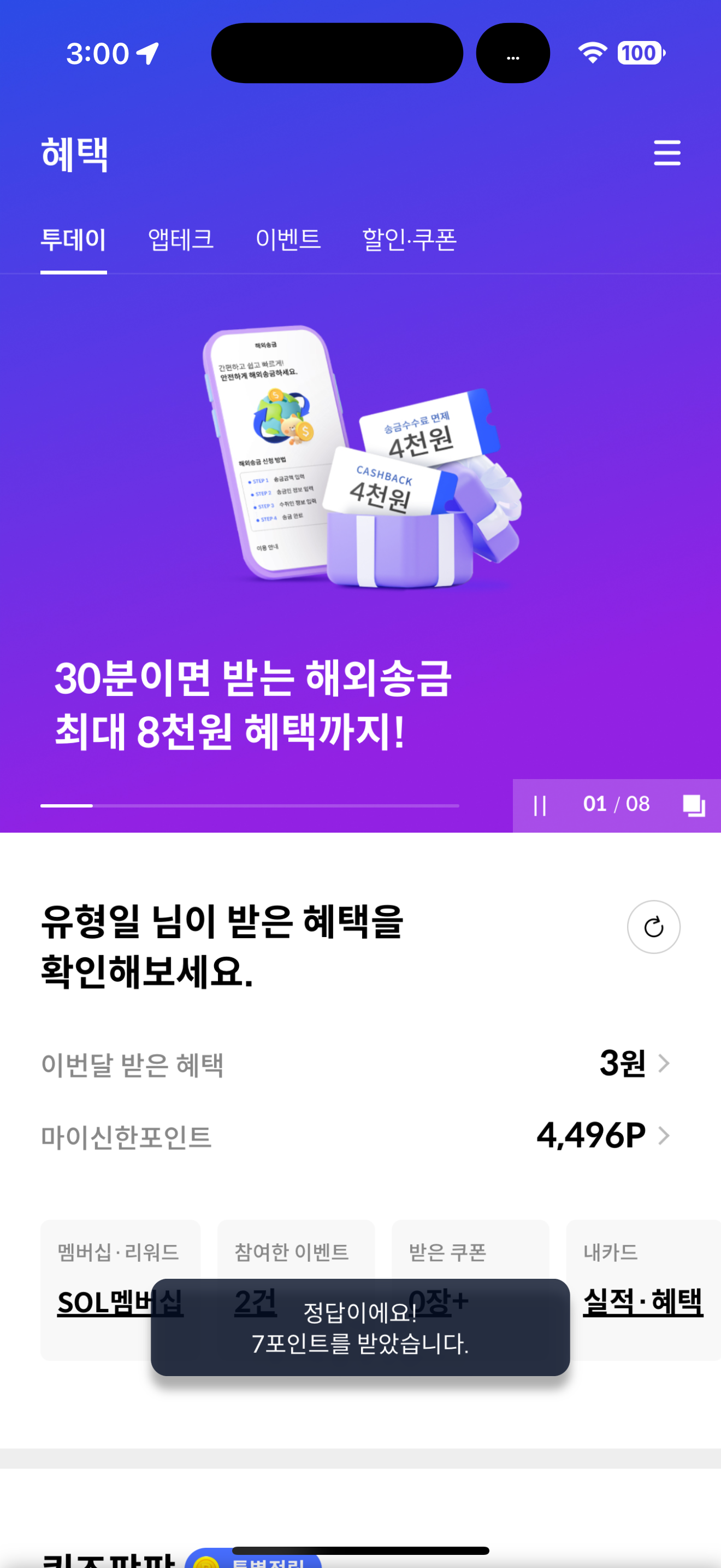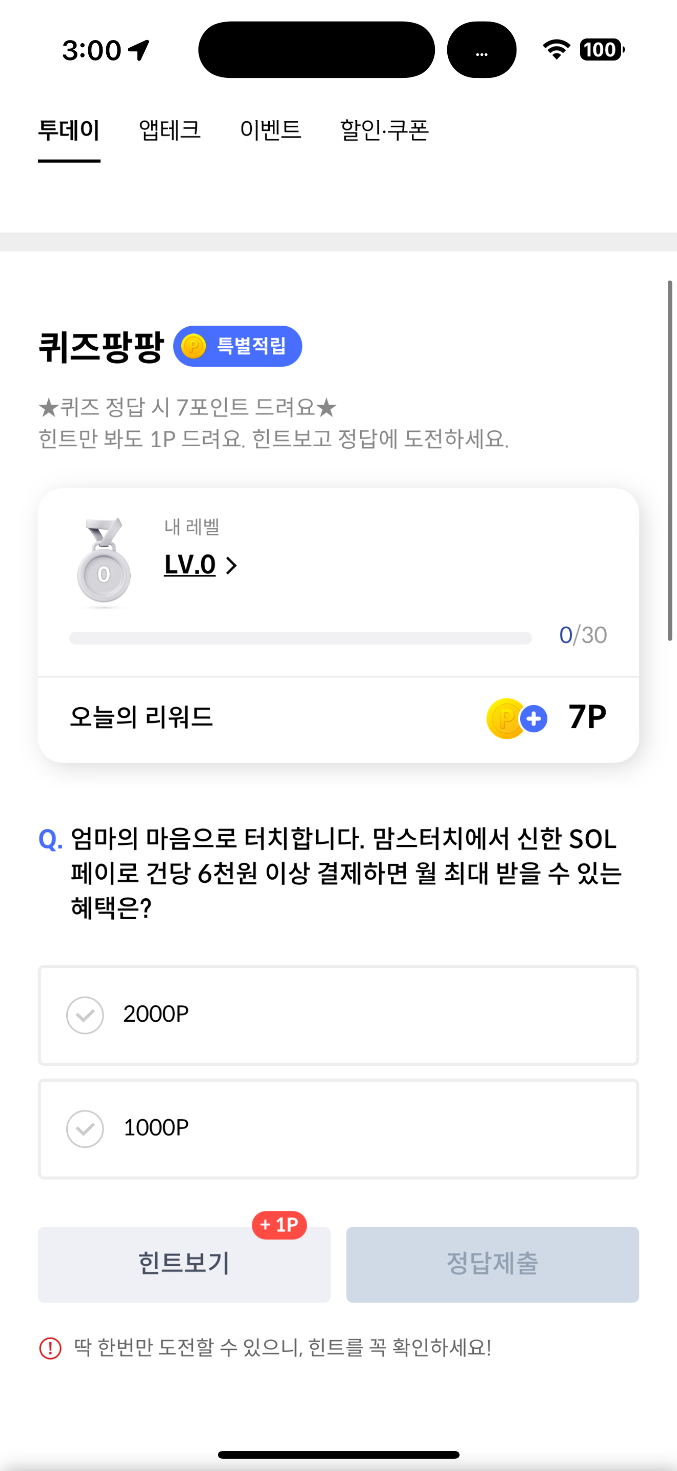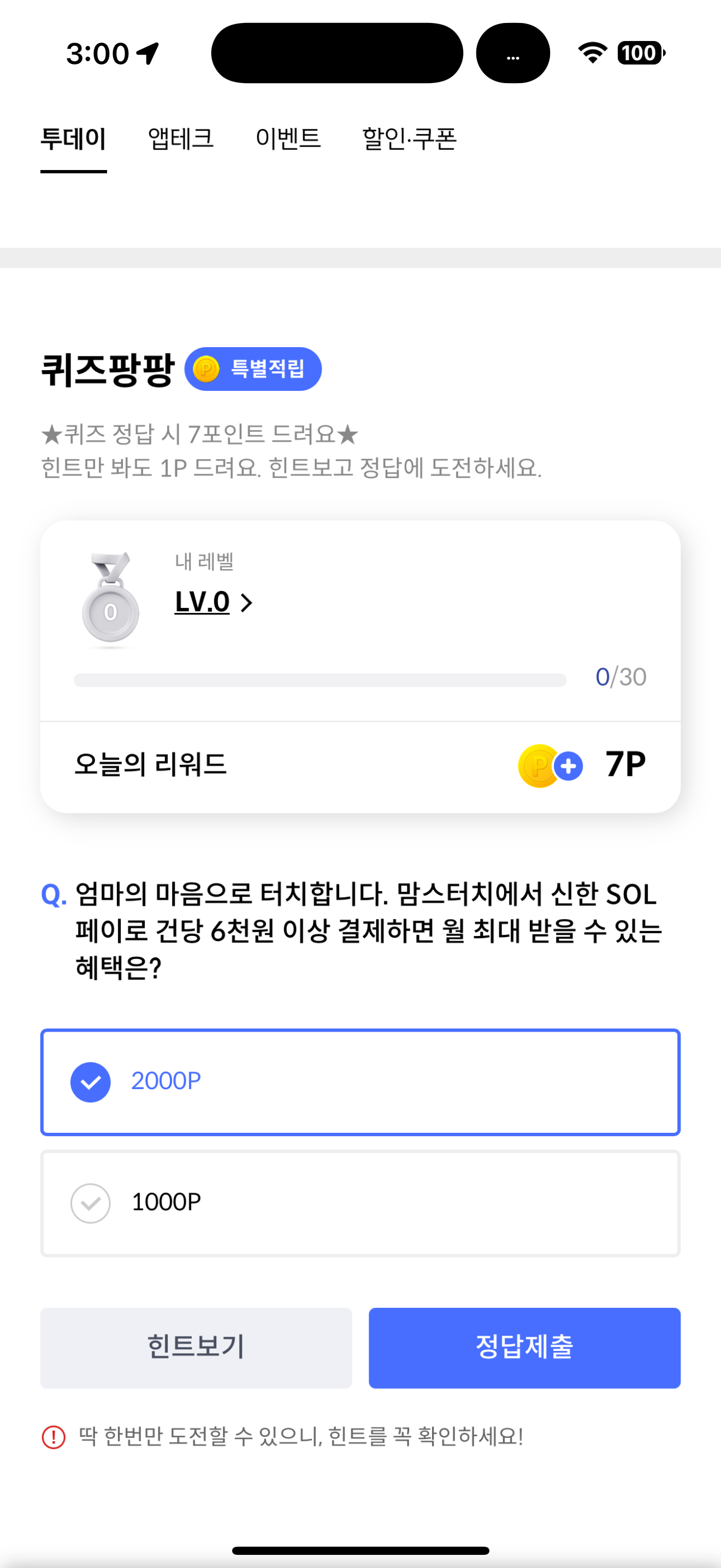 신한카드 퀴즈팡팡 정답은 2000P 입니다