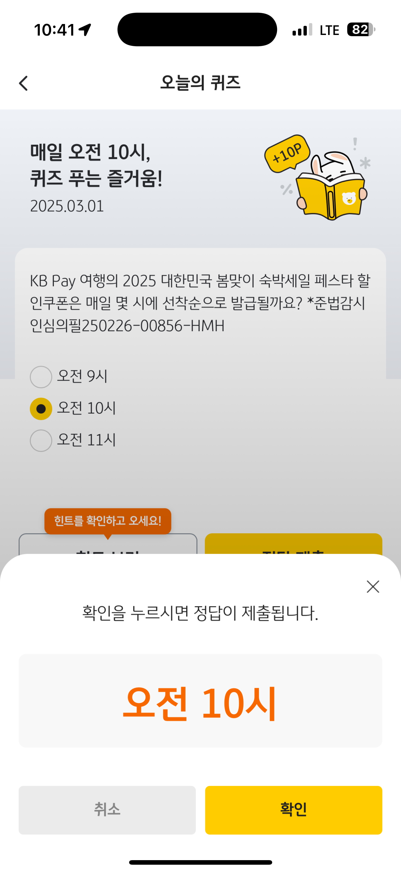 KB pay 오늘의 퀴즈 정답은 오전 10시 입니다