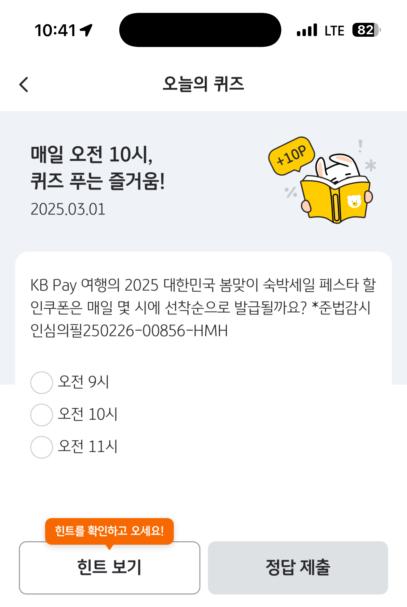 KB pay 여행의 2025 대한민국 봄맞이 숙박세일 페스타 할인쿠폰은 매일 몇 시에 선착순으로 발급될까요? *준법감시인심의필250226-00856-HMH 보기는 1. 오전 9시 2. 오전 10시 3. 오전 11시